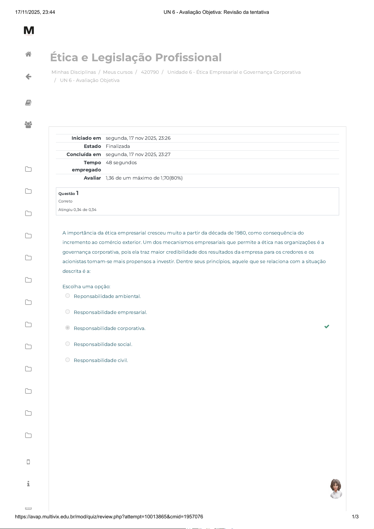 Minhas Disciplinas / Meus cursos / 420790 / Unidade 6 - Ética Empresarial e Governança Corporativa / UN 6 - Avaliação Objetiva Ética e Legislação Profissional Iniciado em segunda, 17 nov 2025, 23:26 Estado Finalizada Concluída em segunda, 17 nov 2025, 23:27 Tempo empregado 48 segundos Avaliar 1,36 de um máximo de 1,70(80%) Questão 1 Correto Atingiu 0,34 de 0,34 A importância da ética empresarial cresceu muito a partir da década de 1980, como consequência do incremento ao comércio exterior. Um dos mecanismos empresariais que permite a ética nas organizações é a governança corporativa, pois ela traz maior credibilidade dos resultados da empresa para os credores e os acionistas tornam-se mais propensos a investir. Dentre seus princípios, aquele que se relaciona com a situação descrita é a: Escolha uma opção: Reponsabilidade ambiental. Responsabilidade empresarial. Responsabilidade corporativa. Responsabilidade social. Responsabilidade civil. 17/11/2025, 23:44 UN 6 - Avaliação Objetiva: Revisão da tentativa https://avap.multivix.edu.br/mod/quiz/review.php?attempt=10013865&cmid=1957076 1/3 https://avap.multivix.edu.br/my/ https://avap.multivix.edu.br/course/view.php?id=36092 https://avap.multivix.edu.br/course/view.php?id=36092§ion=7 https://avap.multivix.edu.br/mod/quiz/view.php?id=1957076 https://avap.multivix.edu.br/my/ https://avap.multivix.edu.br/course/view.php?id=36092 https://avap.multivix.edu.br/user/index.php?id=36092 https://avap.multivix.edu.br/course/view.php?id=36092§ion=1 https://avap.multivix.edu.br/course/view.php?id=36092§ion=2 https://avap.multivix.edu.br/course/view.php?id=36092§ion=3 https://avap.multivix.edu.br/course/view.php?id=36092§ion=4 https://avap.multivix.edu.br/course/view.php?id=36092§ion=5 https://avap.multivix.edu.br/course/view.php?id=36092§ion=6 https://avap.multivix.edu.br/course/view.php?id=36092§ion=7 https://avap.multivix.edu.br/course/view.php?id=36092§ion=8 https://avap.multivix.edu.br/course/view.php?id=36092§ion=9 https://avap.multivix.edu.br/course/view.php?id=36092§ion=10 https://avap.multivix.edu.br/course/view.php?id=36092§ion=11 https://avap.multivix.edu.br/course/view.php?id=36092§ion=12 https://avap.multivix.edu.br/course/view.php?id=36092§ion=13 https://avap.multivix.edu.br/hooks/portal/ https://avap.multivix.edu.br/mod/page/view.php?id=1252%2F%22%20target%3D%22_blank https://avap.multivix.edu.br/calendar/view.php/ https://avap.multivix.edu.br/ https://avap.multivix.edu.br/ https://avap.multivix.edu.br/ https://avap.multivix.edu.br/ Questão 2 Correto Atingiu 0,34 de 0,34 Questão 3 Incorreto Atingiu 0,00 de 0,34 O movimento que nasce da necessidade de combater os privilégios dos executivos de empresas em face dos resultados das organizações, e muitas vezes em contrariedade aos interesses de acionistas e da lucratividade, é chamado de: Escolha uma opção: Estratégia de negócio. Reponsabilidade corporativa. Governança corporativa. Responsabilidade social. Governança estratégica. Empresas são construções sociais, feitas de regras, normas, significados e símbolos sociais realizados na sociedade, a partir de práticas individuais e sociais de cada um. O instrumento empresarial que apresenta mecanismos extrajudiciais de resolução de conflitos é chamado de: Escolha uma opção: Código de ética. Código de disciplina. Código de conduta. Código organizacional. Código de boas práticas. 17/11/2025, 23:44 UN 6 - Avaliação Objetiva: Revisão da tentativa https://avap.multivix.edu.br/mod/quiz/review.php?attempt=10013865&cmid=1957076 2/3 https://avap.multivix.edu.br/my/ https://avap.multivix.edu.br/course/view.php?id=36092 https://avap.multivix.edu.br/user/index.php?id=36092 https://avap.multivix.edu.br/course/view.php?id=36092§ion=1 https://avap.multivix.edu.br/course/view.php?id=36092§ion=2 https://avap.multivix.edu.br/course/view.php?id=36092§ion=3 https://avap.multivix.edu.br/course/view.php?id=36092§ion=4 https://avap.multivix.edu.br/course/view.php?id=36092§ion=5 https://avap.multivix.edu.br/course/view.php?id=36092§ion=6 https://avap.multivix.edu.br/course/view.php?id=36092§ion=7 https://avap.multivix.edu.br/course/view.php?id=36092§ion=8 https://avap.multivix.edu.br/course/view.php?id=36092§ion=9 https://avap.multivix.edu.br/course/view.php?id=36092§ion=10 https://avap.multivix.edu.br/course/view.php?id=36092§ion=11 https://avap.multivix.edu.br/course/view.php?id=36092§ion=12 https://avap.multivix.edu.br/course/view.php?id=36092§ion=13 https://avap.multivix.edu.br/hooks/portal/ https://avap.multivix.edu.br/mod/page/view.php?id=1252%2F%22%20target%3D%22_blank https://avap.multivix.edu.br/calendar/view.php/ https://avap.multivix.edu.br/ https://avap.multivix.edu.br/ https://avap.multivix.edu.br/ https://avap.multivix.edu.br/ Questão 4 Correto Atingiu 0,34 de 0,34 Questão 5 Correto Atingiu 0,34 de 0,34 A governança corporativa no Brasil tem ganhado cada vez mais destaque, inclusive tendo sido incorporados mecanismos em leis que permitam o seu desenvolvimento. Além disso, outros órgãos brasileiros vêm adotando práticas que permitem a sua aplicação, como o(a): Escolha uma opção: EURONEXT. HKEX. DOW JONES. NASDAQ. BOVESPA. A responsabilidade corporativa vai muito além da simples viabilidade econômico-financeira das organizações. A redução das externalidades negativas e o aumento das operações positivas fez com que a prestação de contas da empresa adotasse o modelo de: Escolha uma opção: Balanço social. Balanço fiscal. Balanço legal. Balanço patrimonial. Balanço contábil. ◄ Conteúdo Online Seguir para... Exercícios de Fixação ► 17/11/2025, 23:44 UN 6 - Avaliação Objetiva: Revisão da tentativa https://avap.multivix.edu.br/mod/quiz/review.php?attempt=10013865&cmid=1957076 3/3 https://avap.multivix.edu.br/mod/scorm/view.php?id=1957075&forceview=1 https://avap.multivix.edu.br/mod/quiz/view.php?id=1957077&forceview=1 https://avap.multivix.