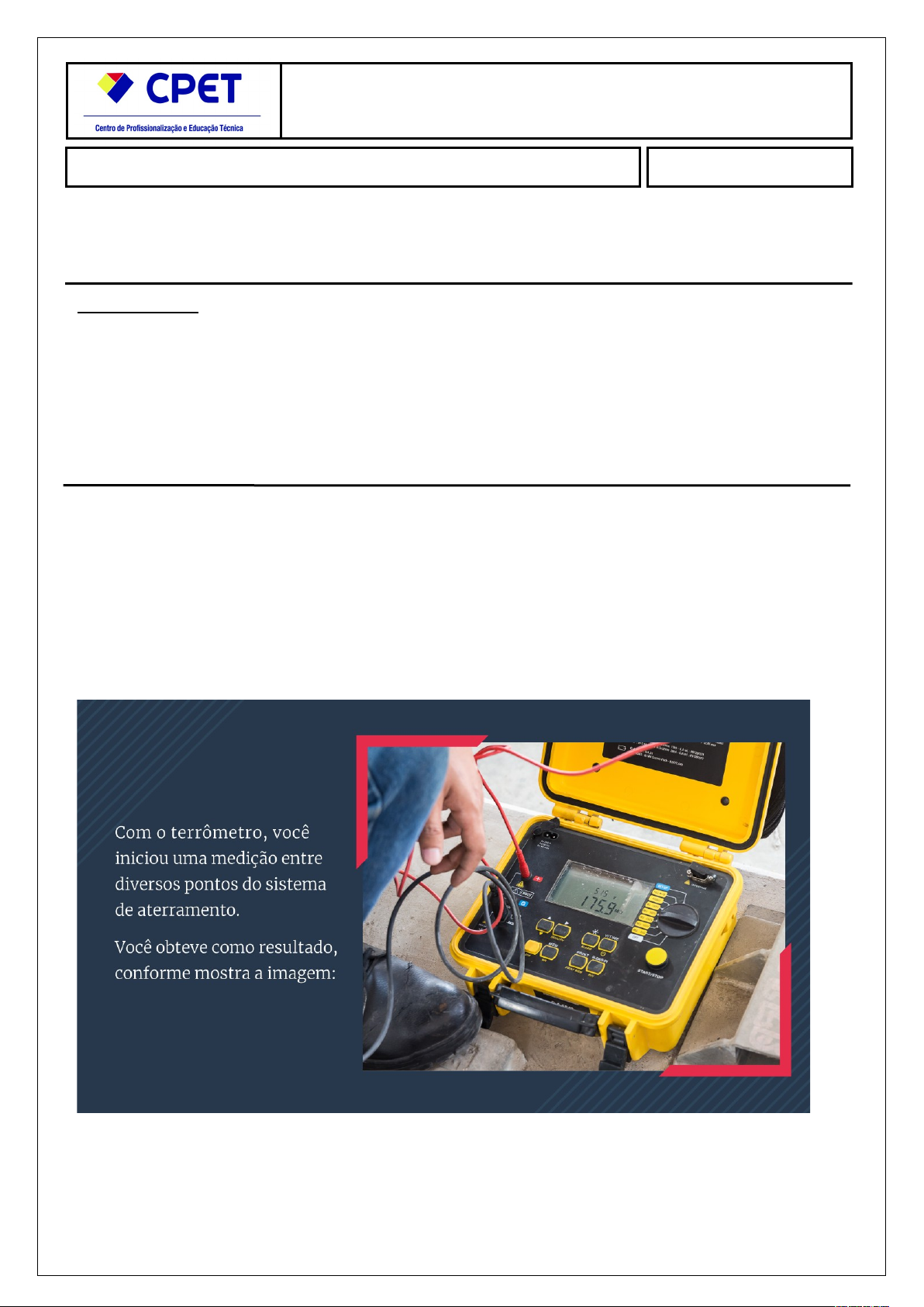 Sistemas de Aterramento e Proteção Elétrica - SG - ELE Data: 04/06/25 Aluno(a): Adriano Parodi Atividade Prática INSTRUÇÕES: · Esta Atividade contém uma ou mais questões totalizando 10 (dez) pontos; · Você deve preencher dos dados no Cabeçalho para sua identificação: · Nome / Data de entrega. · As respostas devem ser digitadas abaixo de cada pergunta; · Ao terminar salve o arquivo no formato PDF ou DOC; · Envie o arquivo pelo sistema no local indicado; · Em caso de dúvidas, consulte o seu Tutor. O aterramento elétrico visa a interligar equipamentos, dispositivos ou qualquer parte metálica diretamente à terra, garantindo uma diferença de potencial quase nula entre esses dois pontos. Ele é realizado para garantir a segurança das pessoas e, também, descarregar cargas eletrostáticas armazenadas nas carcaças de equipamento. Ou, ainda, para conduzir descargas atmosféricas direto para a terra, evitando maiores danos às pessoas ou às instalações. Em determinada empresa, a presença de correntes de fuga em pontos específicos da instalação estava ocasionando choques elétricos e/ou a ação repentina de dispositivos de proteção, que eram acionados, desligando os circuitos de alimentação.Você foi contratado para fazer algumas verificações no sistema de aterramento dessa empresa. Inicialmente, você realizou uma inspeção visual em todas as hastes de aterramento, pelas caixas de inspeção, a fim de verificar a sua integridade.Veja, na imagem a seguir, o resultado da medição realizada com um terrômetro, equipamento adequado para medir a resistencia eletrica. a) Em termos de resistência elétrica, ao comparar os pontos de conexão desse sistema de aterramento, qual(is) deveria(m) ser o(s) valor(es) encontrado(s), idealmente, entre os pontos do sistema de aterramento? b) b) O que indica a leitura feita pelo terrômetro e qual seria a ação necessária após esses resultados? Explique a sua resposta. No Brasil, a NBR 5410 determina que a resistência de aterramento deve ser inferior a 10 ohms para sistemas de baixa tensão, tendo em vista garantir a eficácia na proteção de pessoas e equipamentos. Entre os pontos de aterramento interligados, a resistência deve ser próxima de zero ou muito baixa, pois os pontos estão conectados eletricamente e devem estar equipotenciais. Resistências mais altas indicam problemas como oxidação, quebra de hastes ou solo inadequado. b) O que indica a leitura feita pelo terrômetro e qual seria a ação necessária após esses resultados? No terrômetro a leitura 515 V e 175.9 MΩ, sugere valores irregulares e fora das normas aceitáveis. Essa leitura de tensão indica a fuga de correntes ou potenciais elétricos no sistema, apontando um problema no aterramento. Essa leitura de 175.9 MΩ é extremamente alta e indica que não há conexão elétrica efetiva entre os pontos medidos e a terra. Estes problemas ocorrem por diversos fatores como: Corrosão ou oxidação nos condutores e conexões, A resistência do solo elevada ou inadequada para o aterramento, Hastes de aterramento desconectadas ou danificadas, Procedimentos a seguir: Revisar a integridade das conexões, caixas de inspeção e cabos, Substituir as peças oxidadas, corroídas e danificados, Após, verificar a resistência com novo procedimento, Usar o terrômetro para novas medições em diferentes pontos com o sistema desenergizado Suporte no sistema de aterramento reforçando-o Instalar novas hastes se necessário, para reduzir a resistência pode ser usado a associação em paralelo, Isolação e proteção Identificar se existe ainda fuga de corrente e corrigir problemas no sistema de alimentação e dispositivos de proteção, Para o Teste final: Garantir que a resistência entre os pontos de aterramento fique abaixo de 10 Ohms e o sistema esteja equipotencial. Concluindo: Com a leitura obtida é notado falha grave no aterramento. Deve se tomar a ação imediata de investigar e reparar o sistema para garantir a segurança das pessoas e a integridade das instalações. image1.png image2.jpg
