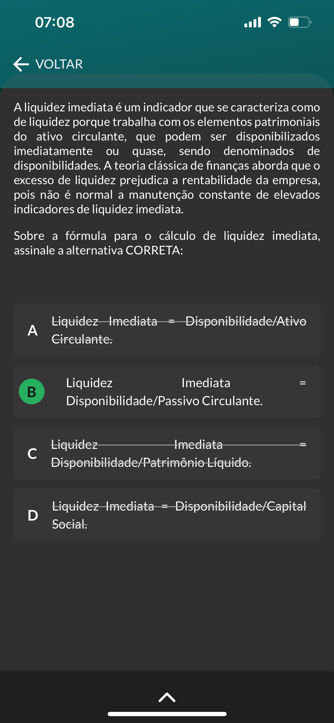 07:08 VOLTAR A liquidez imediata é um indicador que se caracteriza como de liquidez porque trabalha com os elementos patrimoniais do ativo circulante, que podem ser disponibilizados imediatamente ou quase, sendo denominados de disponibilidades. A teoria clássica de finanças aborda que excesso de liquidez prejudica a rentabilidade da empresa, pois não é normal a manutenção constante de elevados indicadores de liquidez imediata. Sobre a fórmula para cálculo de liquidez imediata, assinale a alternativa CORRETA: Liquidez Imediata = Disponibilidade/Ativo A Circulante. Liquidez Imediata = B Disponibilidade/Passivo Circulante. Liquidez Imediata = c Líquido. Liquidez Imediata = D Social.