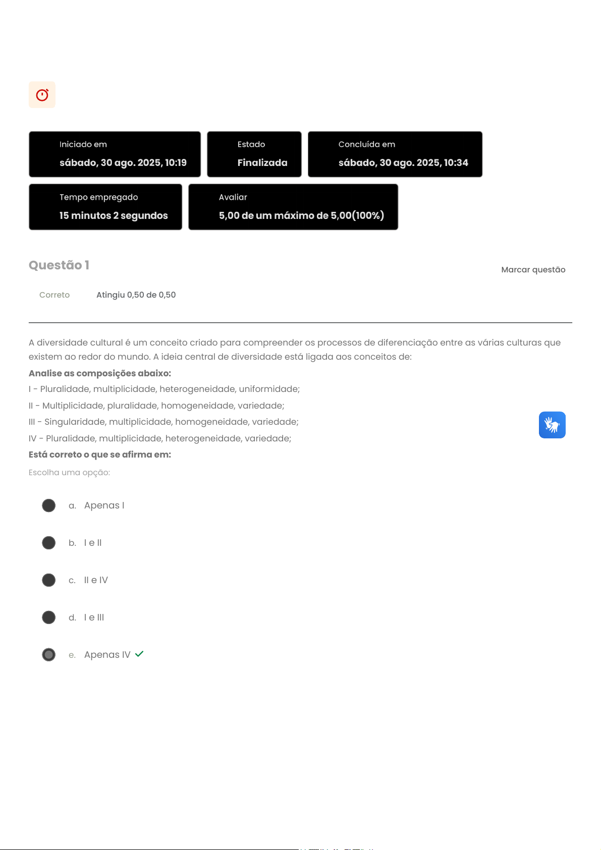 Questão 1 Correto Atingiu 0,50 de 0,50 A diversidade cultural é um conceito criado para compreender os processos de diferenciação entre as várias culturas que existem ao redor do mundo. A ideia central de diversidade está ligada aos conceitos de: Analise as composições abaixo: I - Pluralidade, multiplicidade, heterogeneidade, uniformidade; II - Multiplicidade, pluralidade, homogeneidade, variedade; III - Singularidade, multiplicidade, homogeneidade, variedade; IV - Pluralidade, multiplicidade, heterogeneidade, variedade; Está correto o que se afirma em: Escolha uma opção: a. Apenas I b. I e II c. II e IV d. I e III e. Apenas IV ✓ Marcar questão 30/08/2025, 10:34 Questionário 01 - 5,0 pts Grau A: Revisão da tentativa | AVA Uniftec https://ava.uniftec.com.br/mod/quiz/review.php?attempt=761431&cmid=975190 1/10 Questão 2 Correto Atingiu 0,50 de 0,50 O seu maior sentido é a representação figurativa de um povo, no que tange a construção simbólica que organiza um sistema compreensivo a partir da ideia de pertencimento do seu meio e da sua cultura. Também age como uma construção imaginária que produz a coesão social, permitindo a identificação das partes com o todo, do indivíduo frente ao coletivo. A esse fenômeno denominamos: Escolha uma opção: a. Diversidade cultural. b. Cultura e diversidade c. Identidade cultural ✓ d. Representação figurativa e. Identidade criativa Marcar questão 30/08/2025, 10:34 Questionário 01 - 5,0 pts Grau A: Revisão da tentativa | AVA Uniftec https://ava.uniftec.com.br/mod/quiz/review.php?attempt=761431&cmid=975190 2/10 Questão 3 Correto Atingiu 0,50 de 0,50 A diversidade cultural diz respeito à existência de uma grande variedade de culturas antrópicas, ou seja, que se refere a tudo aquilo que resulta da atuação humana. Esse é um conceito advindo da: La diversidad cultural se refiere a la existencia de una gran variedad de culturas antrópicas, o sea, que se refiere a todo aquello que resulta de la actuación humana. Éste es un concepto venido de la: Escolha uma opção: a. Arqueologia Arqueología b. Filosofia Filosofía c. Sociologia Sociología ✓ d. Antropologia Antropología e. Psicologia Psicología Marcar questão 30/08/2025, 10:34 Questionário 01 - 5,0 pts Grau A: Revisão da tentativa | AVA Uniftec https://ava.uniftec.com.br/mod/quiz/review.php?attempt=761431&cmid=975190 3/10 Questão 4 Correto Atingiu 0,50 de 0,50 A diversidade significa pluralidade e diferenciação, conceito que é considerado o oposto total da homogeneidade. Atualmente, devido aos processos migratórios e a miscigenação cultural entre a maioria das nações do planeta, quase todos os países possuem a sua diversidade cultural, ou seja, um pedacinho das tradições e costumes de várias culturas diferentes convivendo em um mesmo território. I. Algumas pessoas consideram a globalização um perigo para a preservação da diversidade cultural. PORQUE II. Acreditam na perda de costumes tradicionais de algumas sociedades, dando lugar às características globais advindas de culturas dominadoras A respeito dessas asserções, assinale a opção correta: La diversidad significa pluralidad y diferenciación, concepto que es considerado lo opuesto total de la homogeneidad. Actualmente, debido a los procesos migratorios y el mestizaje cultural entre la mayoría de las naciones del planeta, casi todos los países poseen su diversidad cultural, o sea, un pedacito de las tradiciones y costumbres de varias culturas diferentes conviviendo en un mismo territorio. I. Algunas personas consideran la globalización un peligro para la preservación de la diversidad cultural. PORQUE II. Creen en la pérdida de costumbres tradicionales de algunas sociedades, dando lugar a las características globales venidas de culturas dominadoras Sobre estas afirmaciones, señale la opción correcta. Escolha uma opção: a. As asserções I e II são proposições verdadeiras, mas a II não é uma justificativa da I. Las afirmaciones I y II son proposiciones verdaderas, pero, la II no es una justificativa de la I. b. As asserções I e II são proposições falsas. Las afirmaciones I y II son proposiciones falsas. c. A asserção I é uma proposição verdadeira, e a II é uma proposição falsa. La afirmación I es una proposición verdadera, y la II es una proposición falsa. d. As asserções I e II são proposições verdadeiras, e a II é uma justificativa da I. Las afirmaciones I y II son proposiciones verdaderas, y la II es una justificativa de la I. ✓ e. A asserção I é uma proposição falsa, e a II é uma proposição verdadeira. La afirmación I es una proposición falsa, y la II es una proposición verdadera. Marcar questão 30/08/2025, 10:34 Questionário 01 - 5,0 pts Grau A: Revisão da tentativa | AVA Uniftec https://ava.uniftec.com.br/mod/quiz/review.php?attempt=761431&cmid=975190 4/10 Questão 5 Correto Atingiu 0,50 de 0,50 A partir da perspectiva temática apontada na charge de Angeli, analise os seguintes artigos da Declaração Universal dos Direitos Humanos, verificando a possível relação entre eles e a charge. I. Todo ser humano tem direito a um padrão de vida capaz de assegurar-lhe saúde e bem-estar, inclusive alimentação, vestuário, habitação, cuidados médicos e os serviços sociais indispensáveis. II. A maternidade e a infância têm direito a cuidados e assistência especiais. Todas as crianças, nascidas dentro ou fora do matrimônio gozarão da mesma proteção social. III. Os pais têm prioridade de direito na escolha do gênero de instrução que será ministrado a seus filhos. IV. A família é o núcleo natural e fundamental da sociedade e tem direito à proteção da sociedade e do Estado. É correto apenas o que se afirma em: - Padre, dígame la verdad, ¿existe gente que come lo que quiere a cualquier hora? - ¡Existe sí! - ¿Y gente que duerme en una cama, tiene TV, cuarto de baño para bañarse y se cambia de ropa todos
