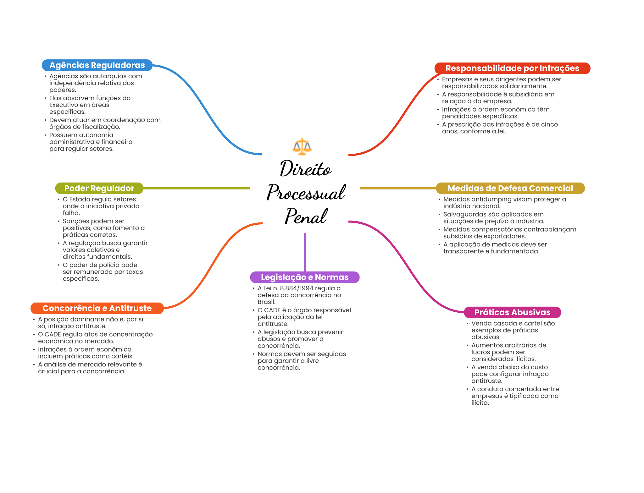 Agências Reguladoras Responsabilidade por Infrações Agências são autarquias com independência relativa dos Empresas e seus dirigentes podem ser responsabilizados solidariamente. poderes. A responsabilidade é subsidiária em Elas absorvem funções do Executivo em áreas relação à da empresa. específicas. Infrações à ordem econômica têm Devem atuar em coordenação com penalidades específicas. órgãos de fiscalização. A prescrição das infrações é de cinco anos, conforme a lei. Possuem autonomia administrativa e financeira para regular setores. Direito Poder Regulador Processual Medidas de Defesa Comercial Estado regula setores Medidas antidumping visam proteger a onde a iniciativa privada indústria nacional. falha. Penal Salvaguardas são aplicadas em Sanções podem ser situações de prejuízo à indústria. positivas, como fomento a Medidas compensatórias contrabalançam práticas corretas. subsídios de exportadores. A regulação busca garantir A aplicação de medidas deve ser valores coletivos e transparente e fundamentada. direitos fundamentais. poder de polícia pode ser remunerado por taxas específicas. Legislação e Normas A Lei n. 8.884/1994 regula a defesa da concorrência no Brasil. Concorrência e Antitruste O CADE é órgão responsável Práticas Abusivas A posição dominante não é, por si pela aplicação da lei só, infração antitruste. antitruste. Venda casada e cartel são CADE regula atos de concentração A legislação busca prevenir exemplos de práticas econômica no mercado. abusos e promover a abusivas. concorrência. Aumentos arbitrários de Infrações à ordem econômica Normas devem ser seguidas lucros podem ser incluem práticas como cartéis. A análise de mercado relevante é para garantir a livre considerados ilícitos. concorrência. A venda abaixo do custo crucial para a concorrência. pode configurar infração antitruste. A conduta concertada entre empresas é tipificada como ilícita.