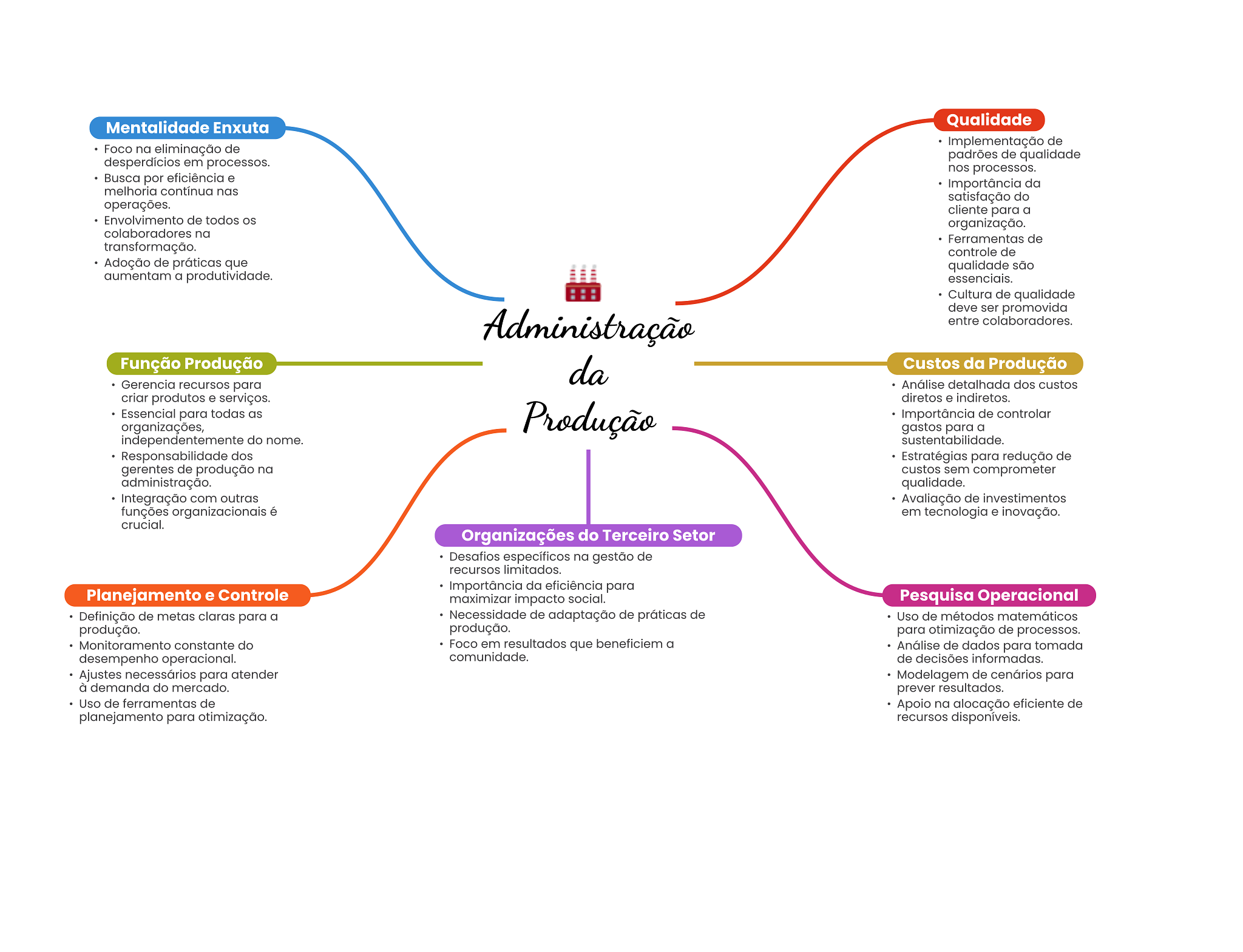 Mentalidade Enxuta Qualidade Implementação de Foco na eliminação de padrões de qualidade desperdícios em processos. nos processos. Busca por eficiência e Importância da melhoria contínua nas satisfação do operações. cliente para a Envolvimento de todos organização. colaboradores na Ferramentas de transformação. controle de Adoção de práticas que qualidade são aumentam a produtividade. essenciais. Cultura de qualidade deve ser promovida Administração entre colaboradores. Função Produção da Custos da Produção Gerencia recursos para Análise detalhada dos custos criar produtos e serviços. diretos e indiretos. Essencial para todas as organizações, Produção Importância de controlar gastos para a independentemente do nome. sustentabilidade. Responsabilidade dos Estratégias para redução de gerentes de produção na custos sem comprometer administração. qualidade. Integração com outras Avaliação de investimentos funções organizacionais é em tecnologia e inovação. crucial. Organizações do Terceiro Setor Desafios específicos na gestão de recursos limitados. Importância da eficiência para Planejamento e Controle maximizar impacto social. Pesquisa Operacional Definição de metas claras para a Necessidade de adaptação de práticas de Uso de métodos matemáticos produção. produção. para otimização de processos. Monitoramento constante do Foco em resultados que beneficiem a Análise de dados para tomada desempenho operacional. comunidade. de decisões informadas. Ajustes necessários para atender Modelagem de cenários para à demanda do mercado. prever resultados. Uso de ferramentas de Apoio na alocação eficiente de planejamento para otimização. recursos disponíveis.