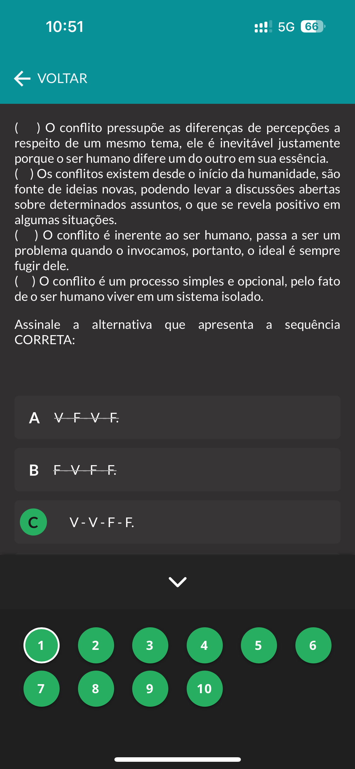 10:51 5G 66 VOLTAR ( ) conflito pressupõe as diferenças de percepções a respeito de um mesmo tema, ele é inevitável justamente porque ser humano difere um do outro em sua essência. Os conflitos existem desde início da humanidade, são fonte de ideias novas, podendo levar a discussões abertas sobre determinados assuntos, que se revela positivo em algumas situações. ( ) conflito é inerente ao ser humano, passa a ser um problema quando invocamos, portanto, ideal é sempre fugir dele. conflito é um processo simples e opcional, pelo fato de ser humano viver em um sistema isolado. Assinale a alternativa que apresenta a sequência CORRETA: A V-V-F-F. 1 2 3 4 5 6 7 8 9 10