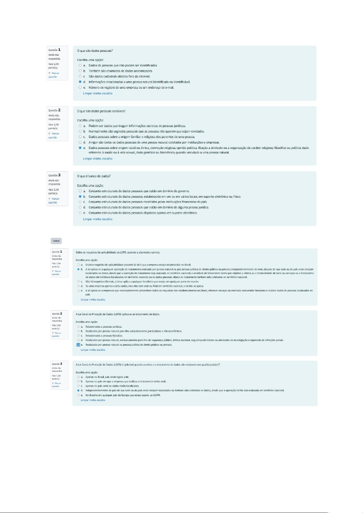 Questão 1 que são dados pessoais? Ainda não respondida Escolha uma opção: Vale 1,00 Dados de pessoas que não podem ser identificadas ponto(s) b. Também são chamados de dados P Marcar questão C. São dados cadastrais obtidos fora da d. Informações relacionadas a uma pessoa natural identificada ou identificável. e. Número de registro de uma empresa ou um endereço de Limpar minha escolha Questão 2 que são dados pessoais sensíveis? Ainda não respondida Escolha uma opção: Vale 1,00 Podem ser dados que tragam informações secretas de pessoas ponto(s). b. Normalmente são segredos pessoais que as pessoas não querem que sejam revelados. Marcar questão C. Dados pessoais sobre a origem familiar e religiosa dos parentes de uma pessoa. d. A rigor são todos dados pessoais de uma pessoa natural coletados por instituições e empresas. e. Dados pessoais sobre origem racial ou étnica, convicção religiosa, opinião política, filiação a sindicato ou a organização de caráter religioso, filosófico ou político, dado referente à saúde ou à vida sexual, dado genético ou biométrico, quando vinculado a uma pessoa Limpar minha escolha Questão 3 que é banco de dados? Ainda não respondida Escolha uma opção: Vale Conjunto estruturado de dados pessoais que estão em domínio do governo. ponto(s). Conjunto estruturado de dados pessoais, estabelecido em um ou em vários locais, em suporte eletrônico ou físico. Marcar questão C. Conjunto estruturado de dados pessoais recolhidos pelas instituições financeiras do país. d. Conjunto estruturado de dados pessoais que estão em domínio de alguma pessoa jurídica. e. Conjunto estruturado de dados pessoais dispostos apenas em suporte eletrônico. Limpar minha escolha Voltar Questão 1 Sobre requisitos de aplicabilidade da LGPD, assinale alternativa correta: Ainda não respondida Escolha uma opção: Vale a. único requisito de aplicabilidade possível da lei é que a empresa esteja estabelecida no Brasil. b. A lei aplica-se a qualquer operação de tratamento realizada por pessoa natural ou por pessoa jurídica de direito público ou privado, independentemente do meio, do país de sua sede ou do país onde estejam P Marcar questão localizados dados, desde que operação de tratamento seja realizada no território nacional; atividade de tratamento tenha por objetivo a oferta ou fornecimento de bens ou serviços ou 0 tratamento de dados de indivíduos localizados no território nacional; ou dados pessoais objeto do tratamento tenham sido coletados no território nacional Não há requisitos formais, lei se aplica a qualquer brasileiro que esteja em qualquer parte do mundo. d. Se uma empresa apenas coleta dados, mas não tem sede ou filial em território nacional, lei não se aplica. A lei aplica- a empresas que necessariamente preencham todos requisitos: ter estabelecimento no Brasil, oferecer serviços ao mercado consumidor brasileiro e coletar dados de pessoas localizadas no país. Limpar minha escolha Questão 2 A Lei Geral de Proteção de Dados (LGPD) aplica-se ao tratamento de dados: Ainda não respondida Escolha uma opção: Vale 1.00 a. Relacionados pessoas ponto(s) b. Realizados por pessoa natural para fins exclusivamente particulares e não P Marcar questão Relacionados a pessoas d. Realizados por pessoa natural, exclusivamente para fins de segurança pública, defesa nacional, segurança do Estado ou atividades de investigação repressão de infrações e. Realizados por pessoa natural ou pessoa jurídica de direito público ou privado. Limpar minha escolha Questão A Lei Geral de Proteção de Dados (LGPD) aplicável quando a coleta tratamento de dados são realizados em qual(is) país(es)? Ainda não respondida Escolha uma opção: Vale a. Apenas no Brasil, país onde vigora a b. Apenas no país em que empresa que realizou 0 tratamento tenha sede. P Marcar questão Apenas no país onde dados estão d. Independentemente do país de sua sede ou do país onde estejam localizados ou tenham sido coletados dados, desde que operação tenha sido realizada em território nacional No Brasil e em qualquer país da Europa que esteja sujeito ao GDPR. Limpar minha escolhaQuestão 1 Quais são princípios fundamentais para a proteção de dados pessoais? Correto Atingiu de Escolha uma opção: a moralidade, impessoalidade responsabilização Marcar b. adequação, necessidade, livre acesso, qualidade dos dados, transparência, prevenção, não discriminação questão Publicidade, eficiência, qualidade dos dados, segurança e d. Veracidade, adequação, livre acesso, prevenção segurança finalidade, não discriminação e Sua resposta está art da Lei Geral de Proteção de Dados (LGPD) determina que as atividades de tratamento de dados pessoais deverão observar boa fé, além dos 10 princípios norteadores para a proteção de dados, os quais estão elencad regulação do tratamento de dados A resposta correta é: Finalidade, adequação, livre acesso, qualidade dos dados, transparência, não discriminação e Questão 2 Qual principal função dos princípios norteadores da Lei Geral de Proteção de Dados (LGPD)? Correto Atingiu 1,00 de Escolha uma opção: a Estabelecer disposições mínimas que devem reger todo processo de coleta e tratamento de dados, assim como a boa Marcar b. Sugerir critérios de atuação às empresas, que podem optar por acatá los ou não questão C. Os princípios norteadores nada mais são que ordens aos agentes de tratamento d. Salvaguardar direitos dos titulares Estabelecer, de forma normas procedimentais às empresas e instituições que coletam tratam dados. Sua resposta está Os princípios norteadores devem ser observados como exigência mínima para uma boa atividade de tratamento de dados pessoais, conforme estabelecem caput e os 10 incisos do da Lei Geral de Proteção de Dados (LG mais específicas para A resposta correta é Estabelecer disposições mínimas que devem reger todo