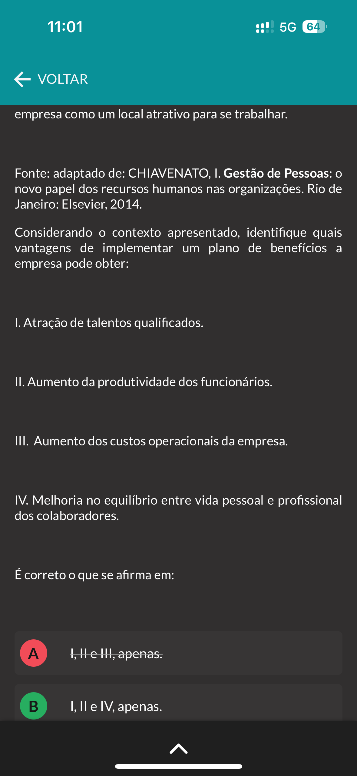 11:01 5G 64 VOLTAR empresa como um local atrativo para se trabalhar. Fonte: adaptado de: CHIAVENATO, I. Gestão de Pessoas: novo papel dos recursos humanos nas organizações. Rio de Janeiro: Elsevier, 2014. Considerando contexto apresentado, identifique quais vantagens de implementar um plano de benefícios a empresa pode obter: I. Atração de talentos qualificados. II. Aumento da produtividade dos funcionários. III. Aumento dos custos operacionais da empresa. IV. Melhoria no equilíbrio entre vida pessoal e profissional dos colaboradores. É correto que se afirma em: A e III, apenas. B I, e IV, apenas.