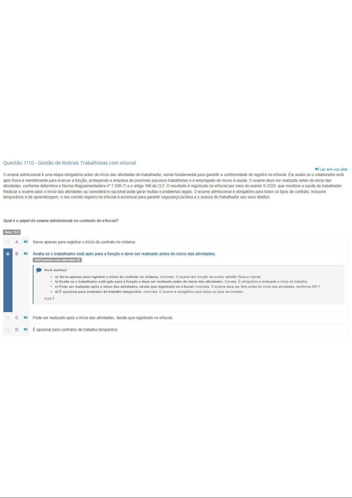 Questão 7/10 Gestão de Rotinas Trabalhistas com eSocial Ler em alta exame admissional é uma etapa obrigatória antes do das atividades do trabalhador, sendo fundamental para garantir a conformidade do registro no eSocial. Ele avalia se colaborador está apto física e mentalmente para exercer a função, protegendo a empresa de possíveis passivos trabalhistas e empregado de riscos à saúde. exame deve ser realizado antes do início das atividades, conforme determina a Norma Regulamentadora n° 7 (NR-7) e artigo 168 da CLT. resultado é registrado no eSocial por meio do evento S-2220, que monitora a saúde do trabalhador. Realizar 0 exame após 0 início das atividades ou considerá-lo opcional pode gerar multas e problemas legais. exame admissional é obrigatório para todos tipos de contrato, inclusive temporários e de aprendizagem, e seu correto registro eSocial é essencial para garantir segurança jurídica e 0 acesso do trabalhador aos seus direitos. Qual papel do exame admissional no contexto do eSocial? Nota: 10.0 A Serve apenas para registrar início do contrato no sistema. Avalia se trabalhador está apto para a função e deve ser realizado antes do início das atividades. Você assinalou essa (B) Você acertou! a) Serve apenas para registrar inicio do contrato no sistema. exame tem função de avaliar aptidão física e b) Avalia se trabalhador está apto para a função e deve ser realizado antes do das atividades. È obrigatório e antecede início do trabalho. c) Pode ser realizado após início das atividades, desde que registrado no e Social. exame deve ser feito antes do início das atividades, conforme NR-7. d) É opcional para contratos de trabalho temporário. exame é obrigatório para todos tipos de contrato. Aula 3 C Pode ser realizado após 0 das atividades, desde que registrado no D É opcional para contratos de trabalho temporário.Questão 1/10 Gestão de Rotinas Trabalhistas com eSocial Ler em voz alta Uma empresa do setor varejista sofreu autuação após deixar de informar no eSocial, por dois meses consecutivos, a rescisão contratual de três funcionários. Como consequência, ex-empregados não conseguiram acessar 0 seguro-desemprego nem 0 saque do FGTS. responsável pelo setor de pessoal alegou que 0 desligamento foi feito corretamente no sistema da empresa, mas reconheceu que os eventos S-2299 não foram transmitidos por falha de comunicação entre sistemas. fiscal do trabalho ressaltou que 0 eSocial permite fiscalização em tempo real, tornando 0 descumprimento das obrigações passível de multa. A atitude mais adequada da empresa para evitar autuações e proteger os direitos dos trabalhadores seria... Nota: 10.0 A efetuar pagamentos das verbas rescisórias e registrar a apenas internamente. B enviar os dados da rescisão no mês seguinte e incluir justificativa de atraso. C manter controle interno dos desligamentos e reportá-los ao INSS diretamente. D registrar desligamento no eSocial dentro do prazo legal, por meio do evento S-2299. Você assinalou essa alternativa (D) Você acertou! A alternativa D está correta porque evento S-2299 é obrigatório para comunicar a rescisão no o não envio impede 0 acesso a direitos como FGTS e seguro-desemprego e pode resultar em multas por omissão, conforme previsto na legislação trabalhista. Justificativa das Incorretas: A) Errada: controle interno não substitui 0 envio B) Errada: envio fora do prazo acarreta ainda que justificado. C) Errada: A comunicação obrigatoriamente feita via eSocial, e não diretamente ao INSS. Base conceitual: Aula 2Questão 3/10 Gestão de Rotinas Trabalhistas com eSocial Ler em voz alta Durante a contratação de um novo funcionário para 0 setor de logística, 0 gestor solicitou que 0 profissional de RH coletasse apenas 0 número do CPF do candidato, alegando que não havia necessidade de apresentar a Carteira de Trabalho física. analista responsável, recém-integrado à equipe, demonstrou dúvida sobre a legalidade da prática. Para garantir a conformidade com a legislação vigente, buscou esclarecimentos sobre a validade do CPF como substituto da apresentação da CTPS, especialmente com a implementação da CTPS digital e sua integração ao Com base na legislação atual, 0 procedimento correto para registro do vínculo empregaticio é... Nota: 10.0 A exigir a apresentação da CTPS física para fins de anotação obrigatória. preencher manualmente dados da CTPS e entregá-la ao trabalhador. utilizar 0 número do CPF do trabalhador como forma válida de apresentação da CTPS digital. Você assinalou essa altemativa (C) Você acertou! A alternativa C está correta pois, com a Lei a apresentação do CPF pelo trabalhador equivale à apresentação da CTPS em formato sendo desnecessária a versão registro se dá eletronicamente pelo eSocial e trabalhador pode consultar suas anotações em até 48 horas após 0 envio. Justificativa das Incorretas: A) Errada: A apresentação da CTPS física não mais B) Errada: preenchimento manual não é exigido nem D) Errada: A emissão da CTPS física não é mais condição para registro. Base conceitual: Aula 2 D aguardar a emissão da CTPS física para iniciar 0 registro no sistema.Questão 8/10 Gestão de Rotinas Trabalhistas com eSocial Ler em voz alta Uma funcionária foi admitida em uma rede de farmácias e, logo após completar um ano de contrato, verificou no aplicativo "Meu INSS" que não constava nenhum dado sobre seus vínculos ou contribuições. Ao procurar 0 setor de RH, foi informada de que 0 envio dos dados ao eSocial havia sofrido atrasos por falhas técnicas no sistema da empresa. Como consequência, a trabalhadora não pôde solicitar 0 mesmo estando em condição de gestação de risco. A conduta legal e ética da empresa, nesse cenário, seria... Nota: 10.0 A justificar 0 atraso no envio ao eSocial com base em dificuldades operacionais. realizar 0 envio das informações quando solicitado pela funcion