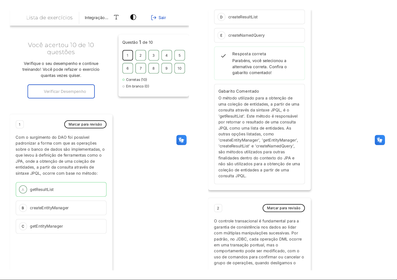 Você acertou 10 de 10 questões Verifique o seu desempenho e continue treinando! Você pode refazer o exercício quantas vezes quiser. Verificar Desempenho A B C 1 Marcar para revisão Com o surgimento do DAO foi possível padronizar a forma com que as operações sobre o banco de dados são implementadas, o que levou à definição de ferramentas como o JPA, onde a obtenção de uma coleção de entidades, a partir da consulta através de sintaxe JPQL, ocorre com base no método: getResultList createEntityManager getEntityManager Questão 1 de 10 Corretas �10� Em branco �0� 1 2 3 4 5 6 7 8 9 10 Lista de exercícios Integração… Sair D E createResultList createNamedQuery Resposta correta Parabéns, você selecionou a alternativa correta. Confira o gabarito comentado! Gabarito Comentado O método utilizado para a obtenção de uma coleção de entidades, a partir de uma consulta através da sintaxe JPQL, é o 'getResultList'. Este método é responsável por retornar o resultado de uma consulta JPQL como uma lista de entidades. As outras opções listadas, como 'createEntityManager', 'getEntityManager', 'createResultList' e 'createNamedQuery', são métodos utilizados para outras finalidades dentro do contexto do JPA e não são utilizados para a obtenção de uma coleção de entidades a partir de uma consulta JPQL. 2 Marcar para revisão O controle transacional é fundamental para a garantia de consistência nos dados ao lidar com múltiplas manipulações sucessivas. Por padrão, no JDBC, cada operação DML ocorre em uma transação pontual, mas o comportamento pode ser modificado, com o uso de comandos para confirmar ou cancelar o grupo de operações, quando desligamos o A B C D E modo automático, o que é viabilizado pelo método: getConnection setAutoCommit executeUpdate rollback executeQuery Resposta correta Parabéns, você selecionou a alternativa correta. Confira o gabarito comentado! Gabarito Comentado A resposta certa é: setAutoCommit 3 Marcar para revisão O padrão DAO surgiu para resolver um problema recorrente em sistemas cadastrais, onde comandos SQL dispersos, em meio ao código do aplicativo, diminuem o reuso e aumentam a dificuldade de manutenção. Esse padrão tem como objetivo concentrar os comandos SQL em classes específicas, onde o método alterar, por exemplo, receberia uma A B C D E entidade como parâmetro e invocaria um comando do tipo: CREATE INSERT DELETE SELECT UPDATE Resposta correta Parabéns, você selecionou a alternativa correta. Confira o gabarito comentado! Gabarito Comentado O padrão DAO �Data Access Object) é uma estratégia para isolar a aplicação da lógica de acesso aos dados. No contexto da questão, o método "alterar" provavelmente estaria atualizando algum registro existente no banco de dados. Nesse caso, o comando SQL mais apropriado para realizar essa operação seria o "UPDATE". Portanto, a alternativa correta é a "E", que indica o comando "UPDATE". 4 Marcar para revisão A B C D E Quando adotamos o mapeamento objeto- relacional com base no JPA, temos apenas um arquivo de configuração para definir as conexões com o banco de dados e qual driver de persistência será utilizado. Qual o nome do arquivo? web.xml database.xml jdbc.xml persistence.xml orm.xml Resposta correta Parabéns, você selecionou a alternativa correta. Confira o gabarito comentado! Gabarito Comentado O arquivo de configuração utilizado para definir as conexões com o banco de dados e o driver de persistência no mapeamento objeto-relacional baseado em JPA é chamado de "persistence.xml". Este arquivo é fundamental para a configuração do ambiente de persistência, pois é nele que são definidos os detalhes de conexão com o banco de dados, as classes de entidade e as propriedades específicas do provedor de persistência. Portanto, a A B C D E alternativa correta é a letra D� "persistence.xml". 5 Marcar para revisão Trabalhando com JPA, as instruções DML ficam transparentes para o programador, sendo executadas a partir de métodos específicos da classe EntityManager. Qual seria o método utilizado para encapsular uma instrução do tipo INSERT? merge getReference persist getResultList remove Resposta correta Parabéns, você selecionou a alternativa correta. Confira o gabarito comentado! Gabarito Comentado O método utilizado para encapsular uma instrução do tipo INSERT no JPA é o 'persist'. Este método é responsável por tornar a entidade passada como A B C D E argumento em uma entidade gerenciada pelo contexto de persistência, ou seja, qualquer alteração feita nessa entidade será automaticamente sincronizada com o banco de dados quando a transação for confirmada. Portanto, o método 'persist' é o equivalente à instrução INSERT em SQL. 6 Marcar para revisão Atualmente temos diversas opções de sistemas para gerenciamento de bancos de dados �SGBDs�, como Oracle e SQL Server, por exemplo. A grande maioria dos sistemas de gerenciamento exige a instalação de um servidor apropriado e uma sequência de ações de configuração, mas a plataforma Java traz uma opção de banco de dados relacional simples, na distribuição do JDK, que não precisa de um servidor, sendo totalmente construído na linguagem Java. Qual o nome desse banco de dados? MySQL SQLite PostgreSQL Firebase Derby A B C Resposta correta Parabéns, você selecionou a alternativa correta. Confira o gabarito comentado! Gabarito Comentado O banco de dados relacional simples, que vem na distribuição do JDK e não necessita de um servidor, sendo totalmente construído na linguagem Java, é chamado de Derby. Portanto, a alternativa correta é a E. 7 Marcar para revisão De forma geral, quando criamos aplicativos para acesso ao banco de dados, com base no JDBC, temos instruções SQL em meio ao código Java, onde algumas são comandos para manipulação de dados �DML) e outras fazem consultas aos dados armazenados. Para efetivar um comando DML, como In