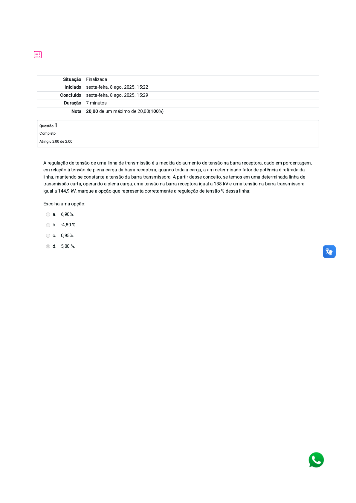 Situação Finalizada Iniciado sexta-feira, 8 ago. 2025, 15:22 Concluído sexta-feira, 8 ago. 2025, 15:29 Duração 7 minutos Nota 20,00 de um máximo de 20,00(100%) Questão 1 Completo Atingiu 2,00 de 2,00 A regulação de tensão de uma linha de transmissão é a medida do aumento de tensão na barra receptora, dado em porcentagem, em relação à tensão de plena carga da barra receptora, quando toda a carga, a um determinado fator de potência é retirada da linha, mantendo-se constante a tensão da barra transmissora. A partir desse conceito, se temos em uma determinada linha de transmissão curta, operando a plena carga, uma tensão na barra receptora igual a 138 kV e uma tensão na barra transmissora igual a 144,9 kV, marque a opção que representa corretamente a regulação de tensão % dessa linha: Escolha uma opção: a. 6,90%. b. -4,80 %. c. 0,95%. d. 5,00 %. Questão 2 Completo Atingiu 2,00 de 2,00 Questão 3 Completo Atingiu 2,00 de 2,00 Um gerador monofásico alimenta, por meio de uma linha, um transformador, o qual alimenta, por outra linha, uma carga, conforme figura a seguir: São conhecidas: · A impedância que liga o gerador ao transformador: (2 + j4)Ω; · A impedância que liga o transformador à carga: (290 + j970)Ω; · A potência absorvida pela carga: 1 MVA, fator de potência 0,8 indutivo; · A tensão aplicada à carga: 200 kV; · Os dados de placa do transformador: 13,8 kV – 220 kV, 1,5 MVA, r = 3% e x = 8%. Para as condições dadas anteriormente, a tensão e corrente no gerador são, respectivamente: Escolha uma opção: a. 13,8 kV e 72,5 A. b. 12,54 kV e 88,1 A. c. 13,87 kV e 79,7 A. d. 12,60 kV e 79,3 A. eq eq Uma determinada linha possui impedância de z = (0,03 + j0,04) pu, para os valores base: S = 100 MVA e V = 230 kV. Essa mesma impedância em pu, utilizando os valores base: S = 50 MVA e V = 200 kV, é: Escolha uma opção: a. z’ = (0,0113 + j0,0151) pu. b. z’ = (0,0454 + j0,0605) pu. c. z’ = (0,0690 + j0,0920) pu. d. z’ = (0,0198 + j0,0264) pu. base base base base Questão 4 Completo Atingiu 2,00 de 2,00 Questão 5 Completo Atingiu 2,00 de 2,00 Sobre os sistemas elétricos de potência é INCORRETO afirmar que: Escolha uma opção: a. Os sistemas de geração são formados pelas centrais elétricas que convertem alguma forma de energia (cinética, calor, luz etc) em energia elétrica. b. Os sistemas elétricos de potência (SEP) são sistemas complexos que englobam geração, transmissão, distribuição e utilização de energia elétrica. c. O sistema de produção e transmissão de energia elétrica do Brasil ocorre por meio da interconexão dos sistemas elétricos, formando um sistema único conhecido como: Sistema Interligado Nacional (SIN). d. Os sistemas de distribuição interligam os sistemas de geração de energia elétrica aos centros de carga. Considere as afirmativas a seguir sobre os sistemas elétricos de potência: I. Os sistemas de subtransmissão de energia são uma extensão da transmissão, que visam ao atendimento de pequenas cidades e consumidores industriais de grande porte. II. Uma das vantagens do Sistema Interligado Nacional (SIN) é explorar a diversidade entre os regimes hidrológicos das bacias, permitindo a integração dos recursos de geração e transmissão de forma a garantir o fornecimento de energia elétrica com segurança e eficiência. III. Em um sistema elétrico típico temos, junto às usinas, subestações abaixadoras que reduzem a tensão a níveis mais baixos e próximo aos centros de carga, os níveis de tensão são elevados por subestações elevadoras, dando origem aos sistemas de subtransmissão e distribuição. IV. No Sistema Interligado Nacional (SIN) é fundamental manter o sincronismo entre as máquinas geradoras. V. As redes com tensões nominais iguais ou superiores a 230 kV formam a “rede básica de transmissão”. Conclui-se que: Escolha uma opção: a. Apenas as afirmativas I, III e V estão corretas; b. Apenas as afirmativas I, II, IV e V estão corretas; c. Apenas as afirmativas II, III e IV estão corretas; d. Apenas as afirmativas II e IV estão corretas; Questão 6 Completo Atingiu 2,00 de 2,00 Questão 7 Completo Atingiu 2,00 de 2,00 Assinale a alternativa INCORRETA sobre a modelagem de equipamentos: Escolha uma opção: a. A representação da carga depende muito do tipo de estudo realizado. Por isso, a carga pode ser representada por potência constante, corrente constante ou impedância constante. b. No modelo de um transformador, a impedância em vazio é representada através dos elementos que estão em série com o transformador ideal e representa as perdas e a magnetização do núcleo. c. No modelo de um gerador síncrono, as reatâncias de regime transitório são fundamentais para modelar o comportamento dinâmico do gerador em resposta a eventos transitórios e distúrbios no sistema elétrico. d. O modelo do gerador síncrono, é formado por fonte de tensão em série com uma resistência que representa a resistência de armadura e uma reatância que representa a soma da reatância da reação da armadura e a reatância de dispersão. Considere uma linha de transmissão trifásica típica, cuja impedância série em cada fase é representada por uma reatância indutiva de j800Ω, operando em regime permanente com tensão de linha na barra transmissora de 235∠10° kV e tensão de linha na barra receptora de 230∠0° kV. Nessas condições, o fluxo de potência ativa total trifásica da barra transmissora para a barra receptora é de aproximadamente: Escolha uma opção: a. 3,9 MW. b. 22,5 MW. c. 11,7 MW. d. 66,5 MW. Questão 8 Completo Atingiu 2,00 de 2,00 Questão 9 Completo Atingiu 2,00 de 2,00 Considere as afirmativas a seguir sobre o fluxo de potência em linhas de transmissão: I. Em uma linha de transmissão com impedância série predominantemente indutiva, o fluxo de potência ativa sempre será da barra cuja tensão possui maior módulo para a bar