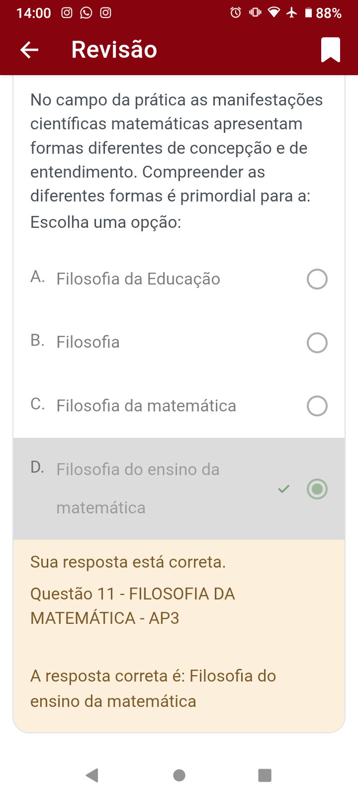 14:00 88% Revisão No campo da prática as manifestações científicas matemáticas apresentam formas diferentes de concepção e de entendimento. Compreender as diferentes formas é primordial para a: Escolha uma opção: Filosofia da Educação B. Filosofia C. Filosofia da matemática D. Filosofia do ensino da matemática Sua resposta está correta. Questão 11 - FILOSOFIA DA MATEMÁTICA - AP3 A resposta correta é: Filosofia do ensino da matemática