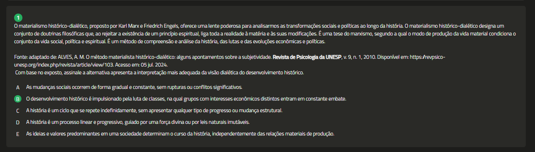 0 materialismo histórico-dialético, proposto por Karl Marx e Friedrich Engels, oferece uma lente poderosa para analisarmos as transformações sociais e políticas ao longo da 0 materialismo histórico-dialético designa um conjunto de doutrinas filosóficas que, ao rejeitar a existência de um princípio espiritual, liga toda a realidade a matéria e suas modificações. uma tese do marxismo, segundo a qual modo de produção da vida material condiciona 0 conjunto da vida social, política e espiritual. E um método de compreensão e analise da das lutas e das evoluções econômicas e Fonte: adaptado de: ALVES, A M. 0 método materialista histórico-dialético: alguns apontamentos sobre a subjetividade. Revista de Psicologia da UNESP, 2010. Disponível em: https:/revpsico- unesp.org/index.php/revista/article/view/103. Acesso em: 05 jul. 2024. Com base no exposto, assinale a alternativa apresenta a interpretação mais adequada da visão dialética do desenvolvimento A As mudanças sociais ocorrem de forma gradual e constante, sem rupturas ou conflitos significativos. 0 desenvolvimento é impulsionado pela luta de classes, na qual grupos com interesses econômicos distintos entram em constante embate. C A história é um ciclo que se repete indefinidamente, sem apresentar qualquer tipo de progresso ou mudança estrutural. D A história é um processo linear e progressivo, guiado por uma força divina ou por leis naturais E As ideias e valores predominantes em uma sociedade determinam 0 curso da história, independentemente das relações materiais de produção.