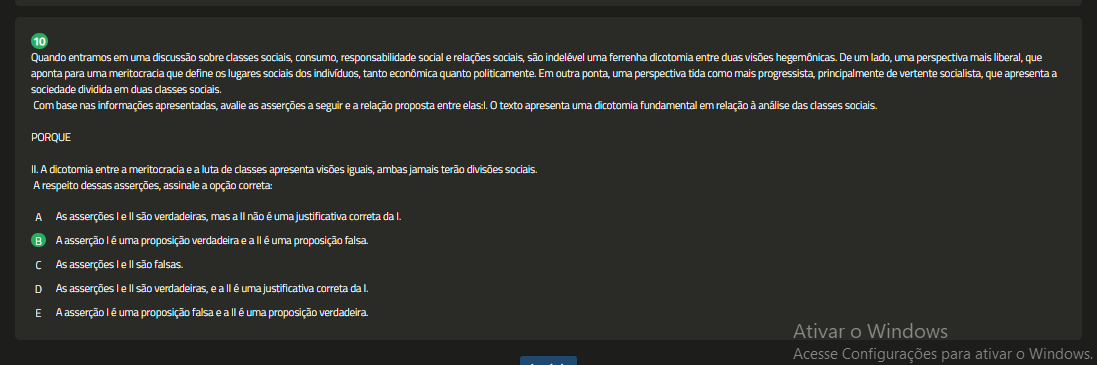 Quando entramos em uma discussão sobre classes sociais, consumo, responsabilidade social e relações sociais, são indelével uma ferrenha dicotomia entre duas visões hegemônicas. De um lado, uma perspectiva mais liberal, que aponta para uma meritocracia que define lugares sociais dos indivíduos, tanto econômica quanto politicamente. Em outra ponta, uma perspectiva tida como mais progressista, principalmente de vertente socialista, que apresenta a sociedade dividida em duas classes sociais. Com base nas informações apresentadas, avalie as asserções a seguir e a relação proposta entre 0 texto apresenta uma dicotomia fundamental em relação das classes sociais. PORQUE II. A dicotomia entre a meritocracia e a luta de classes apresenta visões iguais, ambas jamais terão divisões sociais. A respeito dessas asserções, assinale a opção correta: A As asserções e II são verdadeiras, mas a não é uma justificativa correta da A asserção uma proposição verdadeira e a é uma proposição falsa. C As asserções le II são D As asserções II são verdadeiras, e a é uma justificativa correta da E A asserção uma proposição falsa e a II é uma proposição verdadeira. Ativar Windows Acesse Configurações para ativar Windows.