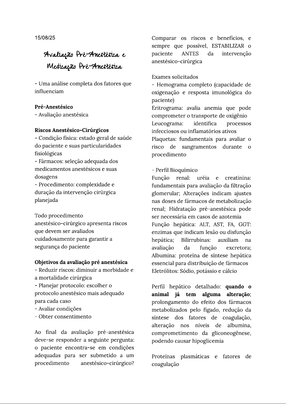 15/08/25 Comparar os riscos e benefícios, e sempre que possível, ESTABILIZAR o Avaliação Pré-Anestésica e paciente ANTES da intervenção anestésico-cirúrgica Medicação Pré-Anestésica Exames solicitados Uma análise completa dos fatores que Hemograma completo (capacidade de influenciam oxigenação e resposta imunológica do paciente) Pré-Anestésico Eritrograma: avalia anemia que pode Avaliação anestésica comprometer o transporte de oxigênio Leucograma: identifica processos Riscos Anestésico-Cirúrgicos infecciosos ou inflamatórios ativos Condição física: estado geral de saúde Plaquetas: fundamentais para avaliar o do paciente e suas particularidades risco de sangramentos durante o fisiológicas procedimento Fármacos: seleção adequada dos medicamentos anestésicos e suas Perfil Bioquímico dosagens Função renal: uréia e creatinina: Procedimento: complexidade e fundamentais para avaliação da filtração duração da intervenção cirúrgica glomerular; Alterações indicam ajustes planejada nas doses de fármacos de metabolização renal; Hidratação pré-anestésica pode Todo procedimento ser necessária em casos de azotemia anestésico-cirúrgico apresenta riscos Função hepática: ALT, AST, FA, GGT: que devem ser avaliados enzimas que indicam lesão ou disfunção cuidadosamente para garantir a hepática; Bilirrubinas: auxiliam na segurança do paciente avaliação da função excretora; Albumina: proteína de síntese hepática Objetivos da avaliação pré anestésica essencial para distribuição de fármacos Reduzir riscos: diminuir a morbidade e Eletrólitos: Sódio, potássio e cálcio a mortalidade cirúrgica Planejar protocolo: escolher o Perfil hepático detalhado: quando o protocolo anestésico mais adequado animal já tem alguma alteração; para cada caso prolongamento do efeito dos fármacos Avaliar condições metabolizados pelo fígado, redução da Obter consentimento síntese dos fatores de coagulação, alteração nos níveis de albumina, Ao final da avaliação pré-anestésica comprometimento da gliconeogênese, deve-se responder a seguinte pergunta: podendo causar hipoglicemia o paciente encontra-se em condições adequadas para ser submetido a um Proteínas plasmáticas e fatores de procedimento anestésico-cirúrgico? coagulaçãoProteínas totais: fundamental para Indicações específicas: avaliar estado nutricional e hidratação Sopros cardíacos grau III/VI ou do paciente superior Albumina: principal proteína de Cardiomegalia identificada em transporte de fármacos radiografias Globulinas: importantes marcadores Arritmias significativas no ECG de inflamação crônica Protocolo de decisão: interpretação dos Fatores de coagulação exames Essenciais para procedimentos com 1) Triagem inicial: hemograma e risco aumentado de sangramento bioquímico básico para todos os Tempo de Protrombina (TP): avalia via pacientes, independente da idade ou extrínseca da coagulação condição física Tempo de Tromboplastina Parcial 2) Avaliação secundária: perfil hepático Ativada (TTPA): avalia via intrínseca completo e proteínas plasmáticas para Fibrinogênio pacientes com alterações iniciais ou idade >5 anos Eletrocardiograma 3) Avaliação especializada: fatores de Indicações específicas: coagulação Animais com idade avançada (>7 anos 4) Avaliação cardiovascular em cães de grande porte) 5) Avaliação cardíaca avançada Raças predispostas a cardiopatas Pacientes com sopros cardíacos * A análise integrada dos resultados detectados no exame físico permite classificação ASA mais precisa e Histórico de síncope ou intolerância personalização do protocolo anestésico, exercícios minimizando riscos durante os riscos Presença de tosse crônica ou dispneia durante o procedimento Raio X Identificação do paciente Tórax: avalia campos pulmonares, silhueta cardíaca e grandes vasos. Particularidade dos Felinos Fundamental em pacientes com Difícil contenção (preferência por histórico de tosse, dispneia ou sopros administração IM) cardíacos Função metabólica hepática limitada Abdômen: identifica organomegalias e (redução do ácido glicurônico) presença de massas que podem Dependência da função renal para interferir na ventilação ou comprometer eliminação de certos fármacos órgãos vitais Maior suscetibilidade à hipotermia * Radiografias são especialmente durante os procedimentos importantes em pacientes geriátricos e obesos Particularidade dos caninos EcocardiogramaA grande variedade de raças e Podem apresentar comportamento temperamento influencia diretamente agressivo e defensivo na resposta aos anestésicos: Contenção física pode ser arriscada Diferente metabolismo entre raças em alguns indivíduos Variações de temperamento afetam - A avaliação comportamental prévia é dosagens essencial Necessidade de protocolos personalizados Particularidades de Pequenos Ruminantes Cães galgos: BARBITÚRICOS Temperamento excitação e recuperação prolongada Contenção Braquicefálicos: SÍNDROME Anestesia respondem bem a BRAQUIOCEFÁLICA ruido inspiratorio, protocolos anestésicos dispneia, cianose, hipoxemia; Cuidado da recuperação anestésica (monitorar Influência da idade nas primeiras 24h, manter paciente em Neonatos decúbito esternal), remoção da sonda Temperamento frequentemente agitado com o paciente consciente, sustenta a Massa corpórea reduzida cabeça e com reflexo de deglutição e Sistema microssomal hepático imaturo mastigação Predisposição à hipoglicemia Neonatos requerem protocolos Particularidade dos equinos específicos com doses reduzidas e Temperamento e comportamento monitoramento excessivos variável conforme a raça e manejo Alta suscetibilidade ao estresse Pediátricos Reações rápidas e bruscas a estímulos Faixa etária: 6 semanas a 12 meses externos Metabolismo: sistema enzimático em Maior sensibilidade aos efeitos desenvolvimento, com capac