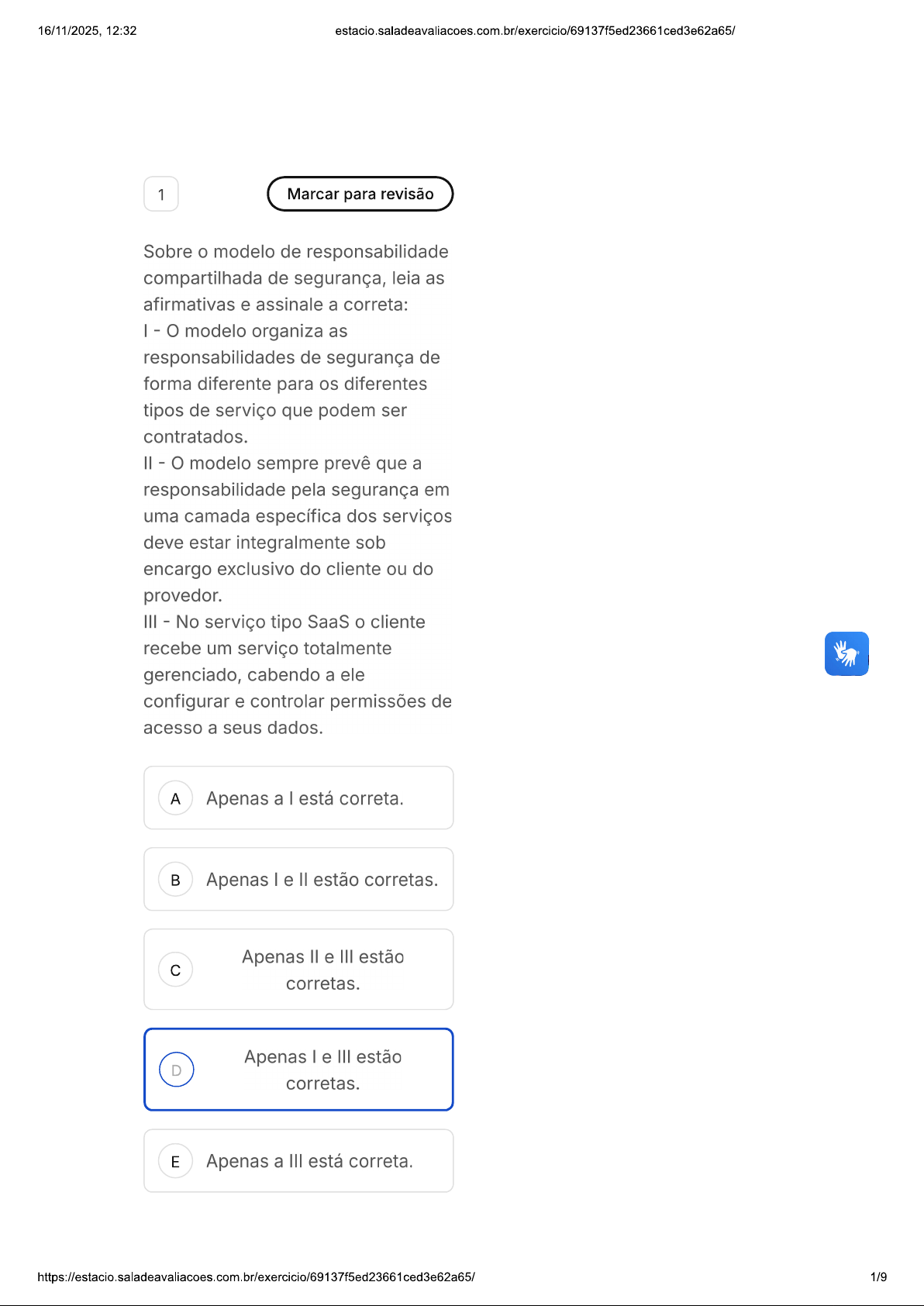 16/11/2025, 12:32 1 Marcar para revisão Sobre modelo de responsabilidade compartilhada de segurança, leia as afirmativas e assinale a correta: I - modelo organiza as responsabilidades de segurança de forma diferente para os diferentes tipos de serviço que podem ser contratados. modelo sempre prevê que a responsabilidade pela segurança em uma camada específica dos serviços deve estar integralmente sob encargo exclusivo do cliente ou do provedor. III No serviço tipo SaaS cliente recebe um serviço totalmente gerenciado, cabendo a ele configurar e controlar permissões de acesso a seus dados. A Apenas a está correta. Apenas I e estão corretas. Apenas e III estão c corretas. Apenas I e III estão D corretas. E Apenas a III está correta. https://estacio.saladeavaliacoes.com.br/exercicio/69137f5ed23661ced3e62a65/ 1/916/11/2025, 12:32 2 Marcar para revisão Das cinco características essenciais dos serviços em nuvem, qual delas refere-se à capacidade do cliente poder, por conta própria, provisionar o hardware, selecionar um sistema operacional e outros sistemas a ser instalado no ambiente, tudo com pouco esforço de recurso humano e tempo? A Resource Pooling. Broad Network Access. c Rapid Elastic. D On-Demand Self-Service. E Measured Service. 3 Marcar para revisão Qual a ordem (da inferior, mais concreta para a superior, mais abstrata) das camadas na arquitetura funcional de acordo com a visão do CSA? 1. Apliestrutura 2. Infraestrutura 3. Infoestrutura 4. Metaestrutura https://estacio.saladeavaliacoes.com.br/exercicio/69137f5ed23661ced3e62a65/ 2/916/11/2025, 12:32 estacio.saladeavaliacoes.com.br/exercicio/69137f5ed23661ced3e62a65/ A 4; 2; 1; 3. 2; 4; 1; 3. c 2; 3; 4; 1. D 1; 2; 3; 4. E 4; 3; 2; 1. 4 Marcar para revisão Leia as afirmações a seguir. I armazenamento de objetos foi criado para tratar um tipo específico de dado chamado de objeto, não sendo capaz de lidar com dados não estruturados. O armazenamento em bloco é um esquema usado em Storage Area Network (SAN) preferencialmente quando usuário precisa recuperar os dados rapidamente. III armazenamento de arquivos é modelo mais transparente para os usuários, baseado nos sistemas de arquivo amplamente usados nos principais sistemas operacionais dos computadores pessoais, que oferece organização dos dados de forma intuitiva. Marque a alternativa correta. https://estacio.saladeavaliacoes.com.br/exercicio/69137f5ed23661ced3e62a65/ 3/916/11/2025, 12:32 estacio.saladeavaliacoes.com.br/exercicio/69137f5ed23661ced3e62a65/ A Apenas a está correta. Apenas a está correta. Apenas a le III estão c corretas. Apenas a e III estão D corretas. E Apenas a III está correta. 5 Marcar para revisão Com relação aos serviços comerciais nos três principais provedores de serviços em nuvem, AWS, Azure e GCP, marque a alternativa correta. AWS Elastic Beanstalk, Azure Web Apps e Google A App Engine são exemplos de SaaS. AWS Elastic Beanstalk, Azure Web Apps e Google App Engine são exemplos de laaS. AWS Elastic Beanstalk, Azure Web Apps e Google c App Engine são exemplos de PaaS. https://estacio.saladeavaliacoes.com.br/exercicio/69137f5ed23661ced3e62a65/ 4/916/11/2025, 12:32 estacio.saladeavaliacoes.com.br/exercicio/69137f5ed23661ced3e62a65/ Microsoft Office 365 e D Google Workspace são um exemplo de laaS. Google Kubernetes Engine é a implementação do GCP E para funções como serviço (serverless). 6 Marcar para revisão Acerca dos conceitos de segurança da computação em nuvem, assinale a opção que completa corretamente a lacuna da sentença abaixo. O é um serviço que se presta a alertar condições associadas de logs em mais de um serviço conjuntamente. MFA - Autenticação A Multifator. LB Load Balancer. DNS Domain Name c Server. SIEM Security Information D and Event Management. VPN - Virtual Private E Network. https://estacio.saladeavaliacoes.com.br/exercicio/69137f5ed23661ced3e62a65/ 5/916/11/2025, 12:32 7 Marcar para revisão Leia as afirmações a seguir. Um serviço WAF é um firewall de Lista de exercícios Segurança. Sair e finalizar depois protocolo HTTP/HTTPS expostos publicamente. Nenhum provedor de serviço em Questão 10 de 10 nuvem criou, até o momento, serviços para mitigar ataques do tipo 1 2 3 4 5 DDoS. III serviço de balanceamento de 6 7 8 9 10 carga provê entrega de conteúdo com base na abordagem de Respondidas (5) Em branco (5) proximidade do cliente. Marque a alternativa correta. Finalizar exercícios A Apenas a está correta. Apenas a está correta. Apenas a e III estão corretas. Apenas a e III estão D corretas. E I, e III estão corretas. 8 Marcar para revisão Acerca dos conceitos de segurança da computação em nuvem, assinale https://estacio.saladeavaliacoes.com.br/exercicio/69137f5ed23661ced3e62a65/ 6/916/11/2025, 12:32 estacio.saladeavaliacoes.com.br/exercicio/69137f5ed23661ced3e62a65/ a opção que completa corretamente as lacunas da sentença abaixo. A é uma técnica que surgiu como evolução da virtualização tradicional, a partir da qual I se fazia possível aos clientes empregar dos recursos, ficando eles responsáveis pela operação conjunta. A Orquestração e isolamento. Orquestração e abstração. Orquestração e c adestramento. D Segregação e isolamento. E Segregação e abstração. 9 Marcar para revisão Leia as afirmativas a seguir e assinale a alternativa correta sobre elas. - Sempre cabe ao cliente, como responsabilidade, visitar ambiente de nuvem do provedor para verificar os mecanismos de segurança física para controle de acesso. Pelo novo paradigma de computação em nuvem, é possível que dado do cliente esteja localizado em qualquer lugar do planeta. III Na resposta a incidentes e no cumprimento a regulamentações normativas e 7/916/11/2025, 12:32 estacio.saladeavaliacoes.com.br/exercicio/69137f5ed23661ced3e62a65/ legais, cabe responsabilidades tanto ao cliente como ao provedor. A Apenas a está correta. Apenas e III estão corretas. c Apenas e 