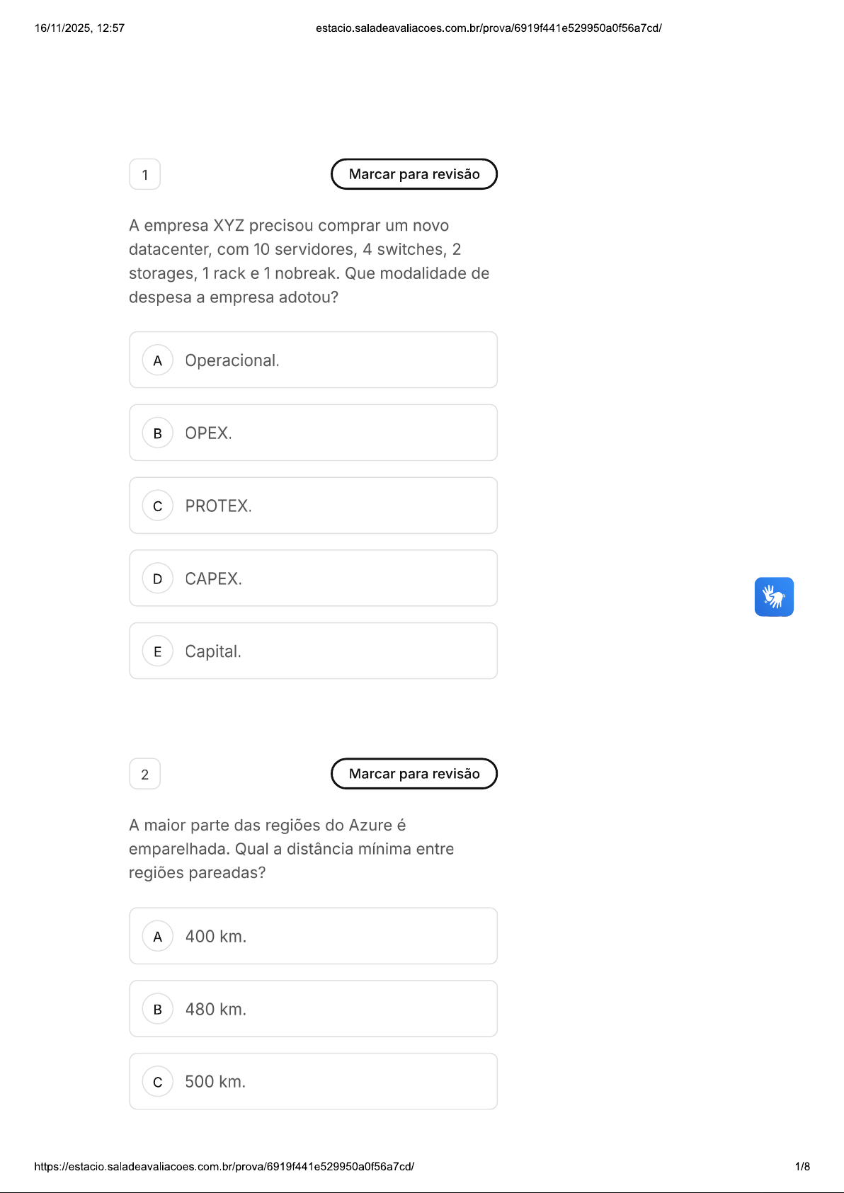 16/11/2025, 12:57 estacio.saladeavaliacoes.com.br/prova/6919f441e529950a0f56a7cd/ 1 Marcar para revisão A empresa XYZ precisou comprar um novo datacenter, com 10 servidores, 4 switches, 2 storages, 1 rack e 1 nobreak. Que modalidade de despesa a empresa adotou? A Operacional. OPEX. c PROTEX. D E Capital. 2 Marcar para revisão A maior parte das regiões do Azure é emparelhada. Qual a distância mínima entre regiões pareadas? A 400 km. 480 km. c 500 km. 1/816/11/2025, 12:57 D 550 km. E 600 km. 3 Marcar para revisão A nuvem de internet, também conhecida como nuvem computacional, é uma tecnologia que permite armazenamento, gerenciamento e processamento de dados em servidores remotos via internet. No modelo de responsabilidade compartilhada, provedor de nuvem será sempre responsável por? A Aplicativos. B Dados armazenados na nuvem. c Atualização do sistema operacional. D Datacenter físico. E Identidade e infraestrutura. 4 Marcar para revisão A Microsoft se preocupa com a utilização dos dados dos seus clientes, Portal de Confiança (Service Trust) da Microsoft ajuda nesse processo. Qual URL é responsável por oferecer recursos sobre práticas de segurança, privacidade e conformidade da Microsoft? 2/816/11/2025, 12:57 A https://portaldeconfianca.microsoft.com https://servicetrust.azure.com c D https://portaldeconfianca.azure.com E 5 Marcar para revisão EBS possui duas principais divisões, os discos SSD e os HDD, que atendem as mais variadas demandas de armazenamento na nuvem. No contexto da escolha para sua carga de trabalho, o io1 é um tipo de EBS recomendado para seguinte caso de uso: Volumes de boot, aplicativos interativos A de baixa latência, desenvolvimento e teste. NoSQL com uso intensivo de e bancos de dados relacionais. Big data, data warehouses, c processamento de logs. https://estacio.saladeavaliacoes.com.br/prova/6919f441e529950a0f56a7cd/ 3/816/11/2025, 12:57 estacio.saladeavaliacoes.com.br/prova/6919f441e529950a0f56a7cd/ Dados mais frios que exigem menos D varreduras por dia. Backups e armazenamento de longo E prazo. 6 Marcar para revisão Para reduzir os índices de carbono, a Amazon desenvolveu os processadores Graviton que chegam a usar 60% menos energia para oferecer a mesma performance do que as instâncias do EC2 similares. Qual dos tipos de instância EC2 abaixo, possui processadores Graviton? A c5 m4 c m6i D t4g E t3 S 7 Marcar para revisão Uma empresa formada majoritariamente de programadores jovens, está desenvolvendo uma aplicação em Python com características de API, com arquitetura de microsserviços. Na equipe, não há profissionais com experiência em 4/816/11/2025, 12:57 estacio.saladeavaliacoes.com.br/prova/6919f441e529950a0f56a7cd/ infraestrutura de servidores ou rede, e nem desejam contratar ou treinar alguém para assumir essa responsabilidade. Que solução de computação na AWS você recomendaria para a empresa estudar a adoção? A Amazon EC2. Amazon ECS. c Amazon EKS. D AWS Lambda. E Amazon S3. 8 Marcar para revisão IAM (Gestão de acessos e identidades) é um componente extremamente importante para a segurança em nuvem. Qual é sua principal função? É um processo de identidade onde A todos os usuários possuem o mesmo nível de acesso. É um processo que visa a igualdade e compartilhamento de responsabilidades no ambiente. É uma tecnologia de ajuda na criação c de telas de login. 5/816/11/2025, 12:57 estacio.saladeavaliacoes.com.br/prova/6919f441e529950a0f56a7cd/ É gerenciamento de usuários e D senhas. SM2 Computação Em Nuvem T E acesso às informações e ações com base no nível de acesso do usuário. 00 : 48 : 23 Ocultar hora min seg 9 Marcar para revisão Questão 10 de 10 Como é realizada a comunicação entre os 1 2 3 4 5 diversos data centers do Google que estão espalhados ao redor do mundo? 6 7 8 9 10 Respondidas (1) Em branco (9) Finland Finalizar prova Frankfurt Oregon Toronto Zurich Salt Lake City Columbus Madrid Los Angeles Osaka Dammam Delhi Hong Kong Mumbai Jakarta Johannesburg Sydney Santiago Melbourne 6/816/11/2025, 12:57 A comunicação entre os data centers é A dada por meio de Via Satélite. Diferente de outros provedores de nuvem, Google não possui rede própria de cabos de rede interligando todas as regiões. Google utiliza apenas infraestruturas e cabos compartilhados com outras c nuvens para comunicação entre seus data centers. Google possui uma rede própria de microondas que se comunica atravez D de repetidores localizados em pontos estratégicos nos oceanos. Diferente de outros provedores de nuvem, Google possui rede própria de E cabos submarinos interligando todas as regiões. 10 Marcar para revisão Em um cenário de computação em nuvem, uma empresa precisa hospedar uma aplicação web corporativa. Ela deseja ter controle sobre sistema operacional, as aplicações e os dados, mas não quer se preocupar com a infraestrutura física (servidores, armazenamento, rede). Considerando os modelos de serviço em nuvem, assinale a alternativa correta: 7/816/11/2025, 12:57 estacio.saladeavaliacoes.com.br/prova/6919f441e529950a0f56a7cd/ modelo mais adequado é SaaS, pois A provê tudo pronto para uso, incluindo a aplicação. modelo mais adequado é laaS, pois oferece recursos de infraestrutura sob demanda, permitindo que a empresa gerencie dados e aplicações. modelo mais adequado é PaaS, pois a empresa precisa gerenciar SO, c aplicações e dados, enquanto a nuvem provê apenas os recursos de infraestrutura. modelo mais adequado é PaaS, pois a nuvem gerencia e infraestrutura, e a D empresa foca apenas na aplicação e dados. modelo mais adequado é laaS, pois neste modelo a nuvem gerencia E aplicação, so e dados, liberando a empresa de qualquer responsabilidade. 8/8