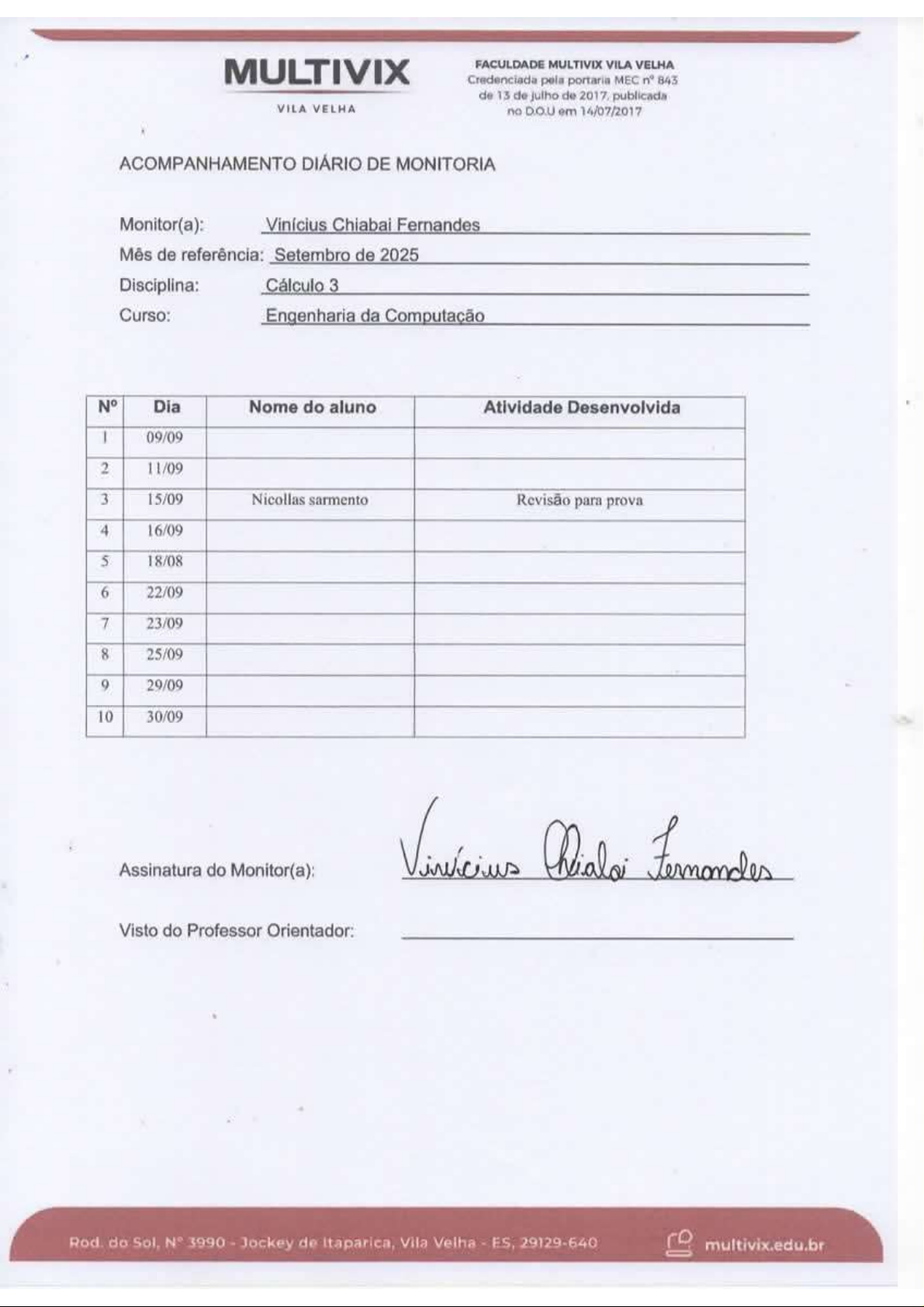 MULTIVIX FACULDADE MULTIVIX VILA VELHA Credenciada pela portaria MEC 843 de 13 de julho de publicada VILA VELHA no D.O.U em 14/07/2017 ACOMPANHAMENTO DIÁRIO DE MONITORIA Monitor(a): Vinícius Chiabai Fernandes Mês de referência: Setembro de 2025 Disciplina: Cálculo 3 Curso: Engenharia da Computação N° Dia Nome do aluno Atividade Desenvolvida 09/09 2 11/09 3 15/09 Nicollas sarmento Revisão para prova 4 16/09 5 18/08 6 22/09 7 23/09 8 25/09 9 29/09 10 30/09 Riala Fernandes Assinatura do Monitor(a): Visto do Professor Orientador: Rod. do Sol, 3990 Jockey de Itaparica, Vila Velha ES, 29129-640 multivix.edu.br
