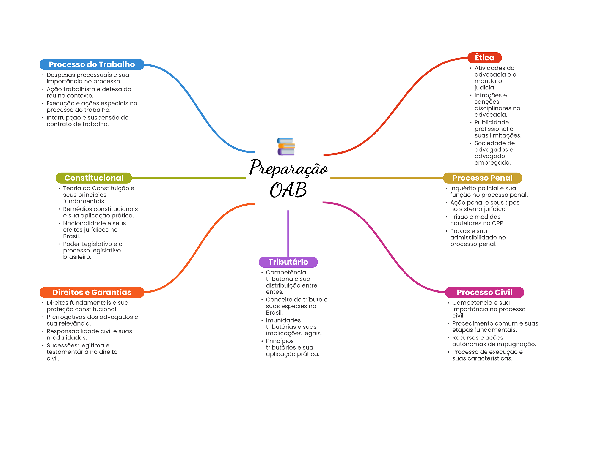 Ética Processo do Trabalho Atividades da Despesas processuais e sua advocacia e O importância no processo. mandato Ação trabalhista e defesa do judicial. réu no contexto. Infrações e Execução e ações especiais no sanções processo do trabalho. disciplinares na advocacia. Interrupção e suspensão do contrato de trabalho. Publicidade profissional e suas limitações. Sociedade de advogados e advogado Preparação empregado. Constitucional Processo Penal Teoria da Constituição e seus princípios OAB Inquérito policial e sua função no processo penal. fundamentais. Ação penal e seus tipos Remédios constitucionais no sistema jurídico. e sua aplicação prática. Prisão e medidas Nacionalidade e seus cautelares no CPP. efeitos jurídicos no Provas e sua Brasil. admissibilidade no Poder Legislativo e processo penal. processo legislativo brasileiro. Tributário Competência tributária e sua distribuição entre Direitos e Garantias entes. Processo Civil Conceito de tributo e Direitos fundamentais e sua proteção constitucional. suas espécies no Competência e sua Brasil. importância no processo Prerrogativas dos advogados e civil. Imunidades relevância. Procedimento comum e suas tributárias e suas Responsabilidade civil e implicações legais. etapas fundamentais. modalidades. Princípios Recursos e ações Sucessões: legítima e tributários e sua autônomas de impugnação. testamentária no direito aplicação prática. Processo de execução e civil. suas características.