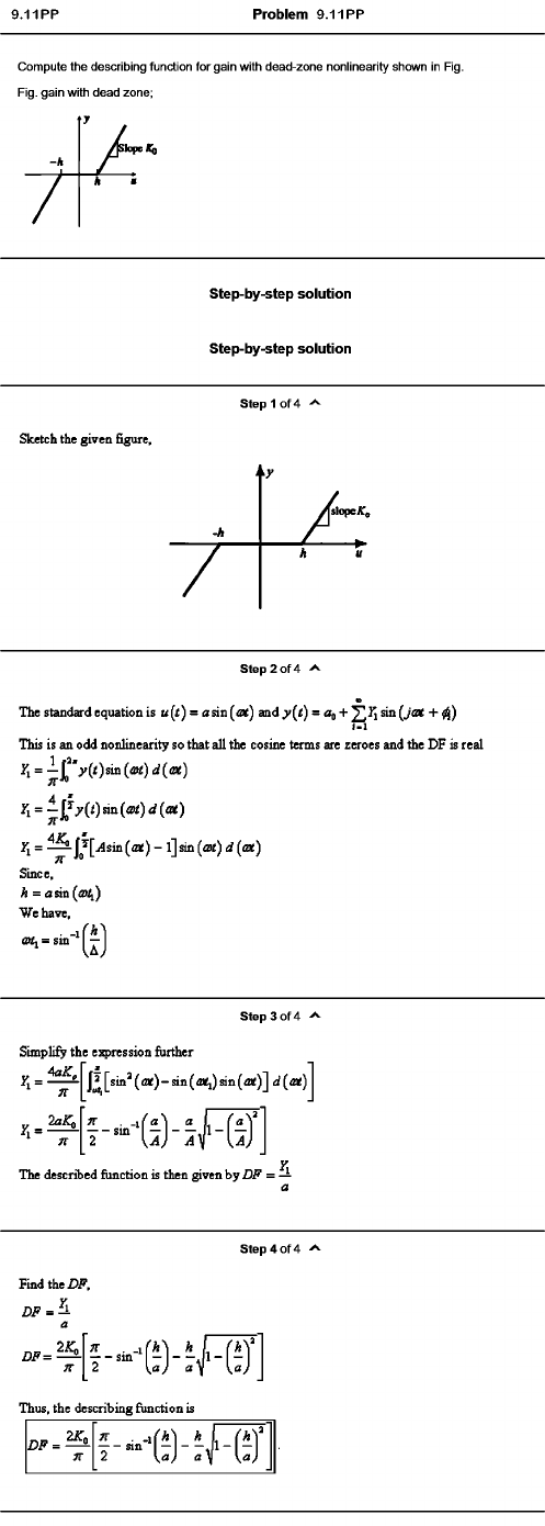 Problem 9.11 PP Compute the describing function for gain with dead-zone nonlinearity shown in Fig. Fig. gain with dead zone; f j IkpeXb -k 7 Step-by-step solution Step-by-step solution Sketch the given figure. Step 1 of 4 Step 2 of 4 ^ The standard equation is u ( t) - asin(ression further ?r y The described function is then given by DF = — Step 4 of 4 Find the DF, D F : DF = 2K, Thus, the describing function is DF = 2K^