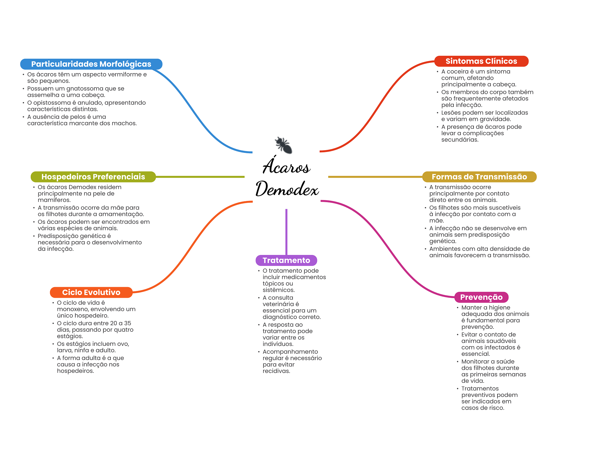 Particularidades Morfológicas Sintomas Clínicos A coceira é um sintoma Os ácaros têm um aspecto vermiforme e são pequenos. comum, afetando principalmente a cabeça. Possuem um gnatossoma que se assemelha a uma cabeça. Os membros do corpo também são frequentemente afetados opistossoma é anulado, apresentando pela infecção. características distintas. Lesões podem ser localizadas A ausência de pelos é uma e variam em gravidade. característica marcante dos machos. A presença de ácaros pode levar a complicações secundárias. Ácaros Hospedeiros Preferenciais Formas de Transmissão Os ácaros Demodex residem principalmente na pele de Demodex A transmissão ocorre principalmente por contato mamíferos. direto entre animais. A transmissão ocorre da mãe para Os filhotes são mais suscetíveis OS filhotes durante a amamentação. à infecção por contato com a Os ácaros podem ser encontrados em mãe. várias espécies de animais. A infecção não se desenvolve em Predisposição genética é animais sem predisposição necessária para desenvolvimento genética. da infecção. Ambientes com alta densidade de animais favorecem a transmissão. Tratamento tratamento pode incluir medicamentos tópicos ou Ciclo Evolutivo sistêmicos. A consulta Prevenção ciclo de vida é veterinária é monoxeno, envolvendo um essencial para um Manter a higiene único hospedeiro. diagnóstico correto. adequada dos animais ciclo dura entre 20 a 35 é fundamental para A resposta ao dias, passando por quatro prevenção. tratamento pode estágios. Evitar contato de variar entre animais saudáveis Os estágios incluem ovo, indivíduos. com infectados é larva, ninfa e adulto. Acompanhamento essencial. A forma adulta é a que regular é necessário Monitorar a saúde causa a infecção nos para evitar dos filhotes durante hospedeiros. recidivas. as primeiras semanas de vida. Tratamentos preventivos podem ser indicados em casos de risco.