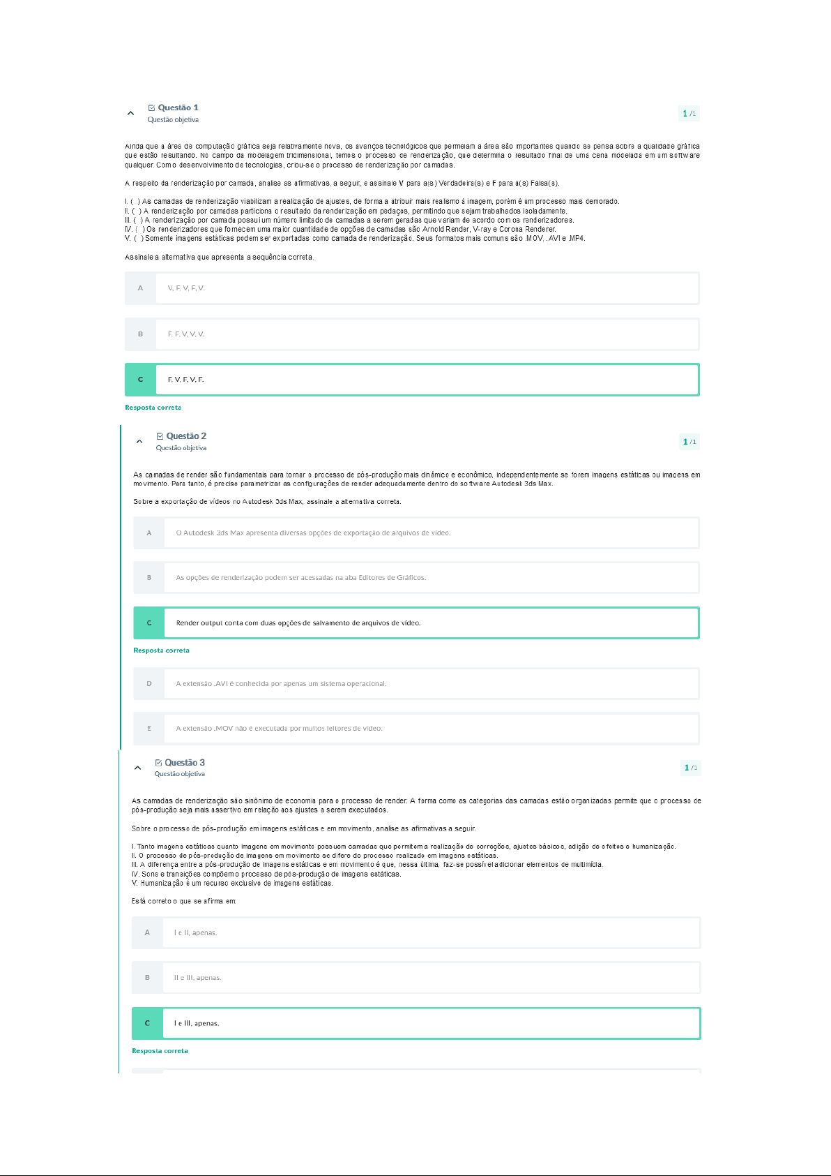 Questão 1 1/1 Questão objetiva Ainda que a área de computação gráfica seja relativamente nova, avanços tecnológicos que permeiam a área são importantes quando se pensa sobre a qualidade gráfica que estão No campo da modelagem temos 0 processo de renderização, que determina 0 resultado final de uma cena modelada em um software qualquer. Com 0 desenvolvimento de tecnologias, criou-se 0 processo de renderização por A respeito da renderização por camada, analise as afirmativas, a seguir, e assinale V para a(s) Verdadeira(s) e F para a(s) Falsa(s). As camadas de renderização viabilizam a realização de ajustes, de forma a atribuir mais realismo à imagem, porém é um processo mais demorado. II. )A renderização por camadas particiona 0 resultado da renderização em pedaços, permitindo que sejam trabalhados isoladamente. III. A renderização por camada possui um número limitado de camadas a serem geradas que variam de acordo com Os renderizadores que fornecem uma maior quantidade de opções de camadas são Arnold Render, V-ray e Corona V. Somente imagens estáticas podem ser exportadas como camada de renderização. Seus formatos mais comuns são MOV, AVI e MP4 Assinale a alternativa que apresenta a sequência correta. A V.F.V.F.V. F.F.V.V.V. c Resposta correta Questão 2 1/1 Questão objetiva As camadas de render são fundamentais para tornar 0 processo de pós-produção mais dinâmico e econômico, se forem imagens estáticas ou imagens em movimento. Para tanto, é preciso parametrizar as configurações de render adequadamente dentro do software Autodesk 3ds Max. Sobre a exportação de vídeos no Autodesk 3ds Max, assinale a alternativa correta. A Autodesk 3ds Max apresenta diversas opções de exportação de arquivos de As opções de renderização podem ser acessadas na aba Editores de c Render output conta com duas opções de salvamento de arquivos de Resposta correta D A extensão AVI é conhecida por apenas um sistema operacional. E A extensão .MOV não é executada por muitos leitores de Questão 3 1/1 Questão objetiva As camadas de renderização são sinônimo de economia para 0 processo de render. A forma como as categorias das camadas estão organizadas permite que 0 processo de pós-produção seja mais assertivo em relação aos ajustes a serem Sobre 0 processo de pós-produção em imagens estáticas e em movimento, analise as afirmativas a seguir. Tanto imagens estáticas quanto imagens em movimento possuem camadas que permitem a realização de correções, ajustes básicos, adição de feitos e humanização. processo de pós-produção de imagens em movimento se difere do processo realizado em imagens estáticas. III. A diferença entre a pós-produção de imagens estáticas e em movimento é que, nessa última, faz-se adicionar elementos de Sons e transições 0 processo de pós-produção de imagens V. Humanização é um recurso de imagens correto 0 que se afirma em: A apenas. III, apenas. c apenas. Resposta corretaQuestão 4 1/1 Questão objetiva Uma cena modelada em software tridimensional só representa suas qualidades gráficas ao passo em que a cena é Além desse processo, de câmeras na definição do ponto de vista do observador em relação à cena. Sobre 0 de câmeras em softwares analise as afirmativas a seguir. A câmera é responsável por definir a perspectiva da posicionando observador em um ponto determinado no II. uso de câmera em cenas tridimensionais permite determinar foco ea profundidade de campo em uma III. Os parâmetros de câmeras se diferem das câmeras do mundo real, pois elas não são baseadas em luz real, e sim em uma luz simulada IV. A distância focal abertura do diafragma não interferem nas camadas de V.O diafragma da câmera virtual é responsável pela quantidade de luz que atinge 0 sensor digital. Está correto 0 que se afirma em: A apenas. IV. apenas. IV V. D apenas. V. apenas. E Resposta correta Questão 5 1/1 Questão objetiva Photoshop é uma ferramenta de grande potencial quando se pretende trabalhar na pós-produção de imagens Dentre seus destacam-se modos de mesclagem entre camadas que, realizam controle da interação das camadas superiores em relação às Considerando modos de mesclagem de camadas no analise as afirmativas, a seguir, e assinale V para a(s) Verdadeira(s) F para a(s) Photoshop possui 27 modos de mesclagem agrupados em 6 categorias de Apenas modo de mesclagem normal pode ser considerado básico, uma vez que interfere apenas na granulação entre as III. Os modos de mesclagem para clareamento possibilitam que tudo aquilo que for preto fique transparente na imagem. IV. Os modos diferença, exclusão, subtração e divisão fazem parte do modo de mesclagem de composição entre as cores das V.( ) Os modos que a mesclagem de comparação entre camadas são sobrepor, luz direta, luz luz do pino e mistura Assinale a alternativa que apresenta a sequência A F.F.F.V.V. D E V.F.V.F.F. Resposta corretaQuestão 6 1/1 Questão objetiva Para agilizar processo de correção e ajustes nas imagens é possi vel separar as imagens em camadas de render. Estas, por sua recebem nomenclaturas especificas que denotam foco da correção ou do ajuste, fazendo com que qualquer profissional que tenha de atuar sobre essas imagens consiga entendê-las de forma assertiva. No que tange ao exposto, assinale a alternativa que apresenta corretamente a realização de ajustes na composição da cena. A No a as sombras e reflexos são manipulados Na utilidade, os rebatimentos podem ser ajustados e ruídos minimizados. Na seleção, dividem-se em materials ou objetos ea cena é em software adequado. D No minimizam os ruídos da aperfeiçoando a aparência em geral. E Na informação ou pode-se atuar na profundidade de desfoque nos relevos. Resposta correta Questão 7 1/1 Questão objetiva Tudo aquilo que nos possui propriedades afetadas pela iluminação dos ambientes, denotando as características particular