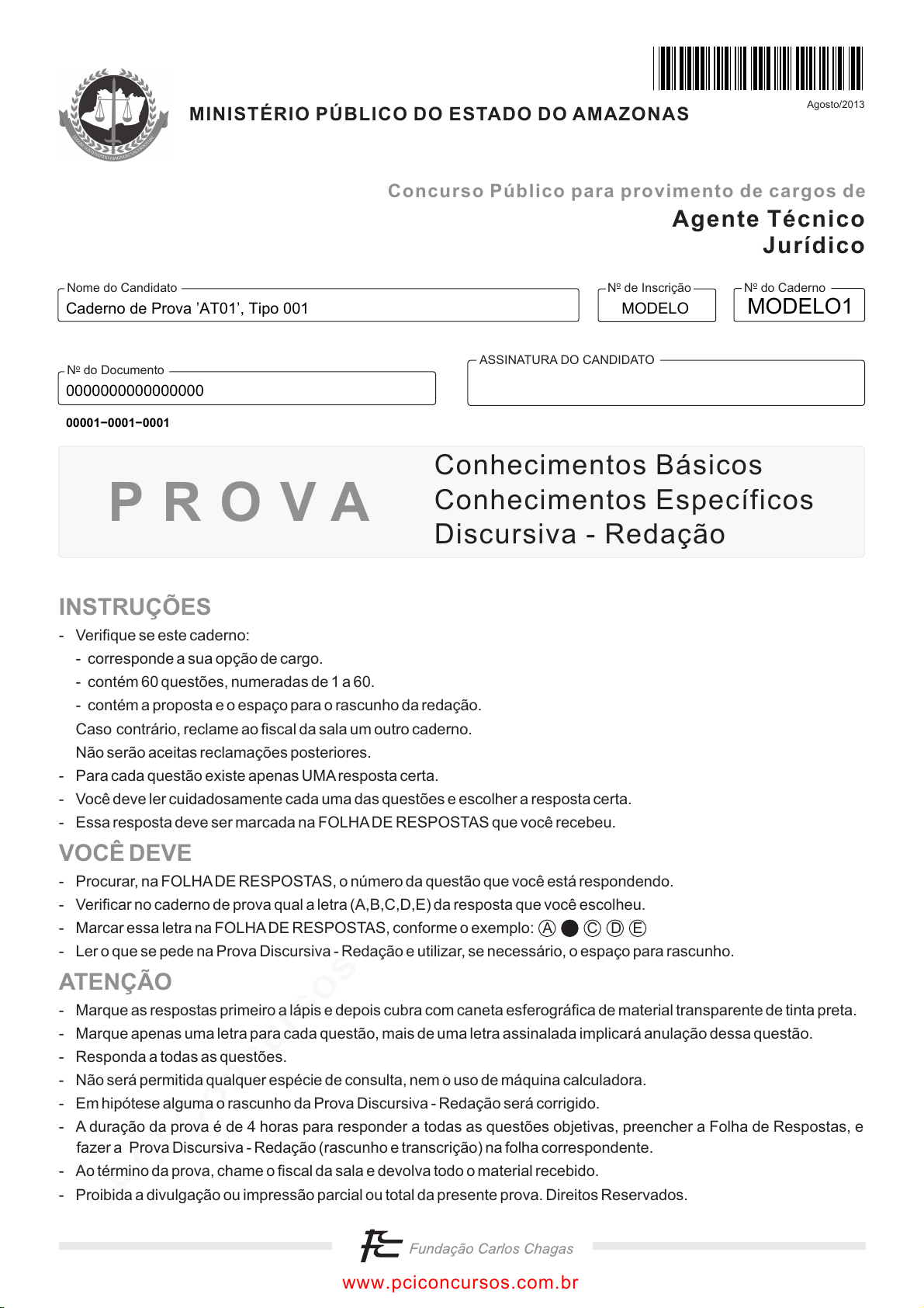 pcimarkpci MDAwMDowMDAwOjAwMDA6MDAwMDowMDAwOmZmZmY6YmFmYTo3NjMy:V2VkLCAxOSBOb3YgMjAyNSAwOToyNTozMiAtMDMwMA== www.pciconcursos.com.br N do CadernooN de Inscriçãoo ASSINATURA DO CANDIDATO N do Documentoo Nome do Candidato P R O V A A C D E Agosto/2013 MINISTÉRIO PÚBLICO DO ESTADO DO AMAZONAS Agente Técnico Jurídico Concurso Público para provimento de cargos de Conhecimentos Básicos Conhecimentos Específicos Discursiva - Redação INSTRUÇÕES VOCÊ DEVE ATENÇÃO - Verifique se este caderno: - corresponde a sua opção de cargo. - contém 60 questões, numeradas de 1 a 60. - contém a proposta e o espaço para o rascunho da redação. Caso contrário, reclame ao fiscal da sala um outro caderno. Não serão aceitas reclamações posteriores. - Para cada questão existe apenas UMAresposta certa. - Você deve ler cuidadosamente cada uma das questões e escolher a resposta certa. - Essa resposta deve ser marcada na FOLHADE RESPOSTAS que você recebeu. - Procurar, na FOLHADE RESPOSTAS, o número da questão que você está respondendo. - Verificar no caderno de prova qual a letra (A,B,C,D,E) da resposta que você escolheu. - Marcar essa letra na FOLHADE RESPOSTAS, conforme o exemplo: - Ler o que se pede na Prova Discursiva - Redação e utilizar, se necessário, o espaço para rascunho. - Marque as respostas primeiro a lápis e depois cubra com caneta esferográfica de material transparente de tinta preta. - Marque apenas uma letra para cada questão, mais de uma letra assinalada implicará anulação dessa questão. - Responda a todas as questões. - Não será permitida qualquer espécie de consulta, nem o uso de máquina calculadora. - Em hipótese alguma o rascunho da Prova Discursiva - Redação será corrigido. - A duração da prova é de 4 horas para responder a todas as questões objetivas, preencher a Folha de Respostas, e fazer a Prova Discursiva - Redação (rascunho e transcrição) na folha correspondente. - Ao término da prova, chame o fiscal da sala e devolva todo o material recebido. - Proibida a divulgação ou impressão parcial ou total da presente prova. Direitos Reservados. Caderno de Prova ’AT01’, Tipo 001 MODELO 0000000000000000 MODELO1 00001−0001−0001 www.pciconcursos.com.br pcimarkpci MDAwMDowMDAwOjAwMDA6MDAwMDowMDAwOmZmZmY6YmFmYTo3NjMy:V2VkLCAxOSBOb3YgMjAyNSAwOToyNTozMiAtMDMwMA== www.pciconcursos.com.br 2 MPAMD-Conhecimentos Básicos1 CONHECIMENTOS BÁSICOS Língua Portuguesa Atenção: Considere o texto abaixo para responder às questões de números 1 a 8. Seria verdade que o homem, ao ser expulso do paraíso, sofreu como condenação ter de trabalhar? O trabalho é um cas- tigo? Seria o ócio uma dádiva? Independentemente da necessi- dade de trabalhar para ganhar o sustento, muitas vezes enfren- tando tarefas enfadonhas e repetitivas, impondo-se o desloca- mento de casa até a fábrica ou o escritório, com horas de sacrifício dentro do metrô ou do ônibus, penso que o trabalho dá sentido à vida. Somos condenados a viver. Nascemos, e nas condições que se apresentam, devendo enfrentar a situação de filho de beltrano e de sicrana, rico ou pobre, brasileiro, suíço ou ango- lano. Viver é uma aventura que de plano enfrenta o barulho depois do confortável silêncio do útero materno. Inicia-se o per- curso e cabe a cada qual afirmar sua individualidade. Cada qual se põe na vida diante desta empreitada: obter sua realização pessoal. Pela via do trabalho a pessoa marca sua individualidade, assinala sua passagem por esta vida, ocu- pa as horas do cotidiano visando a construir sua autoestima e a conquista importante do reconhecimento dos demais. O trabalho atua em duas frentes: permite, de um lado, que as pessoas se afirmem perante si mesmas, motivando a busca de realização, podendo trazer orgulho no sucesso ou dor diante de eventual fracasso; e, de outro lado, faz surgir entre os consorciados o reconhecimento de uma condição própria como sapateiro, mecânico, médico, professor, cozinheiro. Esse espa- ço na sociedade causa satisfação ou desilusão, se reconhecido como o melhor sapateiro do bairro ou o pior cozinheiro da região. Assim, fracassar na execução de uma profissão ou ofício é do jogo da vida. Mais frustrante mesmo é nem sequer entrar no jogo para fazer algo com sua cara, com seu jeito, da sua for- ma, esperando infantilmente contar com acontecimentos exter- nos para conseguir preencher o vazio de uma existência sem rosto. Dois fenômenos da atual sociedade digital, na qual mais se mexem os dedos no iPhone do que se ativam os neurônios, indicam uma falsa felicidade não derivada da efetivação de um projeto, mas sim de fatores marcadamente efêmeros, visivel- mente enganosos: os relacionamentos pela rede Facebook e o culto às celebridades. A urgência hoje vivida de compartilhar imediatamente todos os acontecimentos (ouvir uma música, comprar uma rou- pa, deliciar-se com um vinho, trocar um olhar) retira a vivência da realidade do âmbito individual, pois o essencial é antes divi- dir com alguém o sucedido para receber imediatamente o as- sentimento elogioso do que sentir isoladamente o prazer do fato, transformando-se, dessa maneira, o mundo numa grande academia do elogio mútuo. A satisfação, então, vem de fora, pois algo só vale se outrem vier a curtir. Instala-se um novo car- tesianismo: eu compartilho, logo, existo. Outra futilidade alienante domina os espíritos: a cele- bração das celebridades, os famosos, a mais perfeita criação artificial da mídia. Ídolos passageiros, sem conteúdo, apenas virtuais, povoam a fantasia. A existência perde consistência. Muitos são os espíritos empreendedores, porém, infelizmente, repetem-se hoje jovens para os quais a conquista árdua, a afirmação profissional deixa de ser importante para que even- tuais fracassos não sejam sofridos, mas disfarçados, driblados pelo compartilhamento elogioso de momentos irrelevantes ou pelo consumismo desenfreado, que s