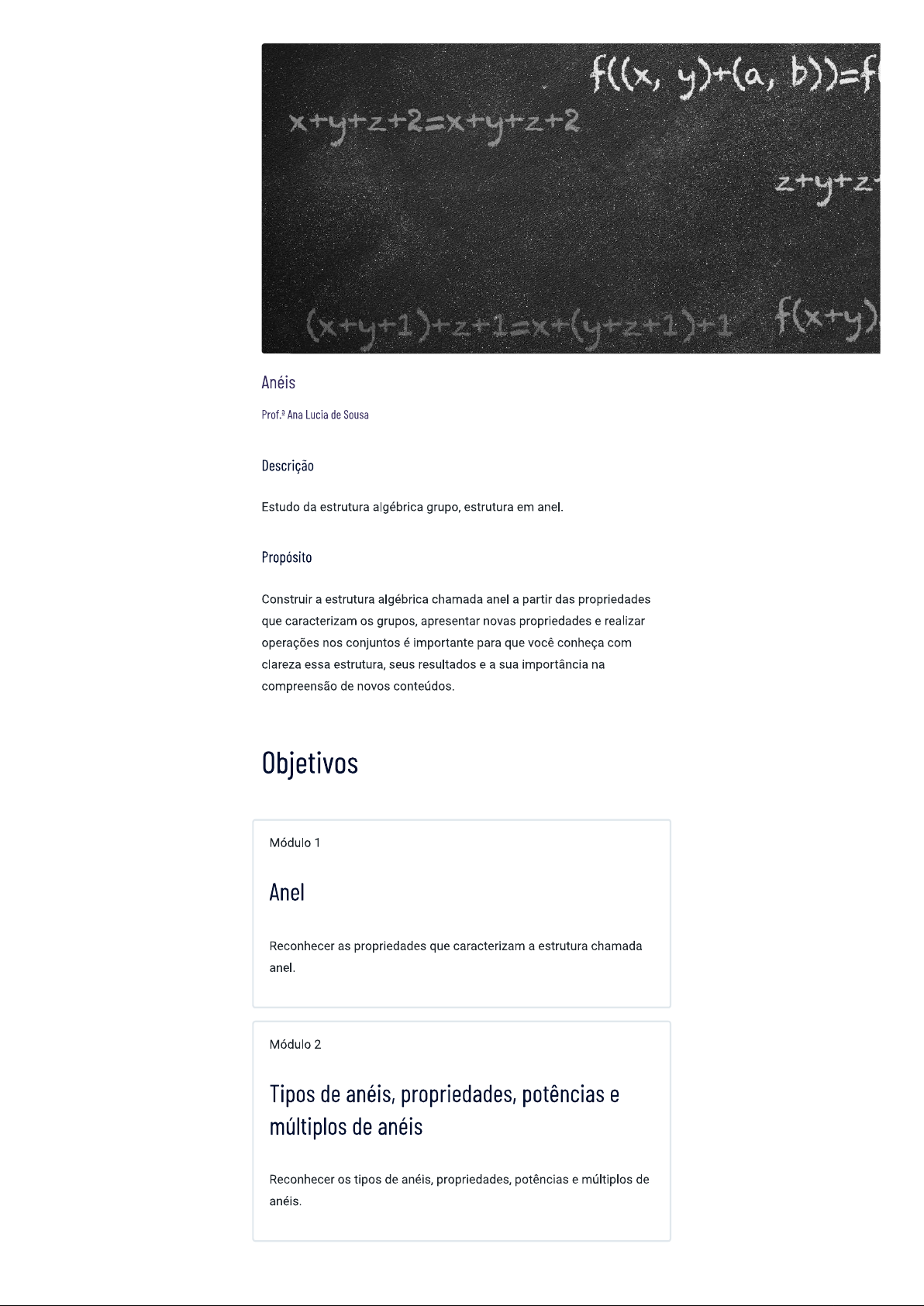 f((x, y)+(a, b))=f f(x+y) Anéis Ana Lucia de Sousa Descrição Estudo da estrutura algébrica grupo, estrutura em anel. Propósito Construir a estrutura algébrica chamada anel a partir das propriedades que caracterizam os grupos, apresentar novas propriedades e realizar operações nos conjuntos é importante para que você conheça com clareza essa estrutura, seus resultados ea sua importância na compreensão de novos conteúdos. Objetivos Módulo 1 Anel Reconhecer as propriedades que caracterizam a estrutura chamada anel. Módulo 2 Tipos de anéis, propriedades, potências e múltiplos de anéis Reconhecer os tipos de anéis, propriedades, potências e múltiplos de anéis.Módulo 3 Subanéis e anéis de integridade Identificar subanel, anel de integridade e divisores de um anel. Módulo 4 Homomorfismo de anéis Analisar os homomorfismos de anéis. Introdução Olá! Antes de começarmos, assista ao vídeo e entenda os principais aspectos que serão abordados neste conteúdo. Para assistir a um vídeo sobre assunto, acesse a versão online deste conteúdo. 1 AnelAo final deste módulo, você será capaz de reconhecer as propriedades que caracterizam a estrutura chamada anel. Vamos começar! As propriedades que caracterizam a estrutura chamada anel Conheça a seguir as propriedades da estrutura chamada anel. Para assistir a um vídeo sobre assunto, acesse a versão online deste conteúdo. Anel Anel é uma estrutura algébrica um conjunto não vazio onde estão definidas duas composições internas: adição (+) e multiplicação (·). Devemos lembrar que o grupo possui apenas uma operação: (G,+). As operações de adição (+) e a multiplicação (·) em um anel devem satisfazer propriedades bem-definidas. Atenção! Seja A um conjunto não vazio, com as operações usuais de adição e multiplicação indicadas por: e e A adição e a multiplicação são funções de em A. Sendo assim, a operação de adição associa para cada par (x, y) um único elemento A operação de multiplicação associa a cada par (x,y) X A um único elemento x Denotamos o anel A com as operações de usuais de adição (+) e multiplicação (.), por ou simplesmente anel A.Comentário Também podemos representar as operações do anel através de outros símbolos, por exemplo, * e Assim, teremos (A, *, ), cuja primeira operação * é chamada de adição e a segunda operação é a multiplicação. A estrutura algébrica denominada anel se: I) (A,+) é um grupo comutativo ou abeliano; II) é um semigrupo; III) valem as propriedades distributivas da multiplicação em relação à adição. Agora vamos entender melhor essas afirmações. I) (A,+) é um grupo comutativo ou abeliano, ou seja, devemos verificar as propriedades/os axiomas de grupo. A1: Propriedade associativa para a adição: tem-se A2: Existência do elemento neutro para a adição: Existe um elemento e A tal que para todo x em Atenção: 0A representa o elemento neutro do anel para a operação de adição. Ou seja, ele não necessariamente é o número zero. A3: Existência do elemento simétrico para a adição: A4: Propriedade comutativa para a adição: II) é um semigrupo, ou seja, devemos verificar a propriedade associativa para a multiplicação. Propriedade associativa para a multiplicação: tem-se III) Valem as propriedades distributivas da multiplicação em relação à adição.Se satisfaz essas condições, então dizemos que um anel. Comentário 0 elemento (-x) é chamado de elemento simétrico de x. Assim, se então x e podemos efetuar a operação Chamamos de operação subtração em a operação que cada associa o elemento Exemplos de anéis a) anel dos números inteiros b) anel dos números reais c) anel dos números racionais d) anel dos números complexos e) anel formado pelos números múltiplos de n, em que n é um número natural É importante reconhecer, a partir das propriedades (ou dos axiomas, como veremos a seguir), se determinado conjunto apresenta uma estrutura de anel com as operações usuais. Todas as propriedades devem ser verificadas. Exemplo Mostre que o conjunto Z dotado das leis de composição + e X a seguir definidas é um anel. Devemos verificar os seis axiomas já apresentados. Solução: a) Propriedade associativa para a adição tem-se A propriedade associativa para a adição foi verificada.b) Existência do elemento neutro para a adição Existe um elemento (-1) tal que x (-1) (-1) = para todo x em Z Existência do elemento simétrico para a adição: d) Propriedade comutativa para a adição x+y+1=y+x+1 A propriedade comutativa para a adição foi verificada. e) Propriedade associativa para a multiplicação: A propriedade associativa para a multiplicação foi verificada. f) Valem as propriedades distributivas da multiplicação em relação à adição:Conclusão: um anel. Exemplo Mostre que o conjunto Z dotado das leis de composição * e a seguir definidas é um anel. Solução a) Propriedade associativa para adição: tem-se A propriedade associativa para a adição foi verificada. b) Existência do elemento neutro para a adição: Existe um elemento 1 Z tal que x para todo x em Z.c) Existência do elemento simétrico para a adição: Neste caso o conjunto Z com as operações dadas não é um anel, pois não é um grupo com a operação *, uma vez que não possui inverso. Logo, Z dotado das leis de composição * e não é um anel. Exemplo Verifique se o conjunto Z dotado das leis de composição * e a seguir definidas é um anel. Solução Propriedade associativa para a adição: y, Z, tem-se A propriedade associativa para a adição não foi verificada. Portanto, não é um anel. Anéis importantes Anel de funções Considere K um conjunto não vazio e um anel. Denotamos por conjunto de todas as funções de K em A, ou Dizemos que as funções f e g são iguais se possuem mesmo domínio, a mesma imagem e o mesmo contradomínio. Sendo assim, se considerarmos essas funções em dizemos