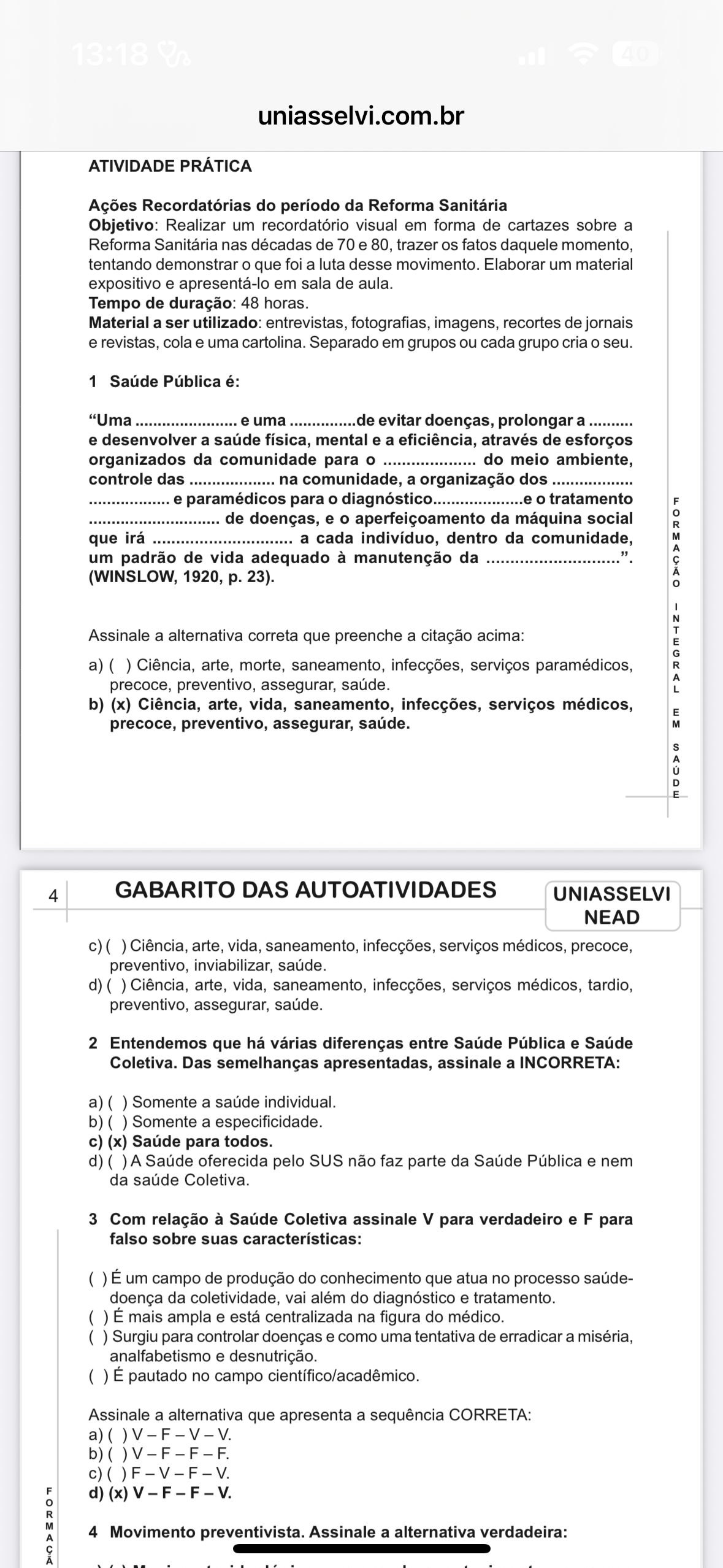 uniasselvi.com.br ATIVIDADE PRÁTICA Ações Recordatórias do período da Reforma Sanitária Objetivo: Realizar um recordatório visual em forma de cartazes sobre a Reforma Sanitária nas décadas de 70 e 80, trazer os fatos daquele momento, tentando demonstrar o que foi a luta desse movimento. Elaborar um material expositivo e apresentá-lo em sala de aula. Tempo de duração: 48 horas. Material a ser utilizado: entrevistas, fotografias, imagens, recortes de jornais e revistas, cola e uma cartolina. Separado em grupos ou cada grupo cria o seu. 1 Saúde Pública é: "Uma e uma de evitar doenças, prolongar a e desenvolver a saúde física, mental e a eficiência, através de esforços organizados da comunidade para o do meio ambiente, controle das na comunidade, a organização dos e paramédicos para o diagnóstico e tratamento de doenças, e o aperfeiçoamento da máquina social que irá a cada indivíduo, dentro da comunidade, um padrão de vida adequado à manutenção da (WINSLOW, 1920, 23). Assinale a alternativa correta que preenche a citação acima: a) Ciência, arte, morte, saneamento, infecções, serviços paramédicos, precoce, preventivo, assegurar, saúde. b) (x) Ciência, arte, vida, saneamento, infecções, serviços médicos, precoce, preventivo, assegurar, saúde. EM A G R L E T 4 GABARITO DAS AUTOATIVIDADES UNIASSELVI NEAD c) Ciência, arte, vida, saneamento, infecções, serviços médicos, precoce, preventivo, inviabilizar, saúde. d) Ciência, arte, vida, saneamento, infecções, serviços médicos, tardio, preventivo, assegurar, saúde. 2 Entendemos que há várias diferenças entre Saúde Pública e Saúde Coletiva. Das semelhanças apresentadas, assinale a INCORRETA: a) Somente a saúde individual. b) Somente a especificidade. c) (x) Saúde para todos. d) A Saúde oferecida pelo SUS não faz parte da Saúde Pública e nem da saúde Coletiva. 3 Com relação à Saúde Coletiva assinale V para verdadeiro e F para falso sobre suas características: É um campo de produção do conhecimento que atua no processo saúde- doença da coletividade, vai além do diagnóstico e É mais ampla e está centralizada na figura do médico. Surgiu para controlar doenças e como uma tentativa de erradicar a miséria, analfabetismo e desnutrição. É pautado no campo Assinale a alternativa que apresenta a sequência CORRETA: b) d) 4 Movimento preventivista. Assinale a alternativa verdadeira: