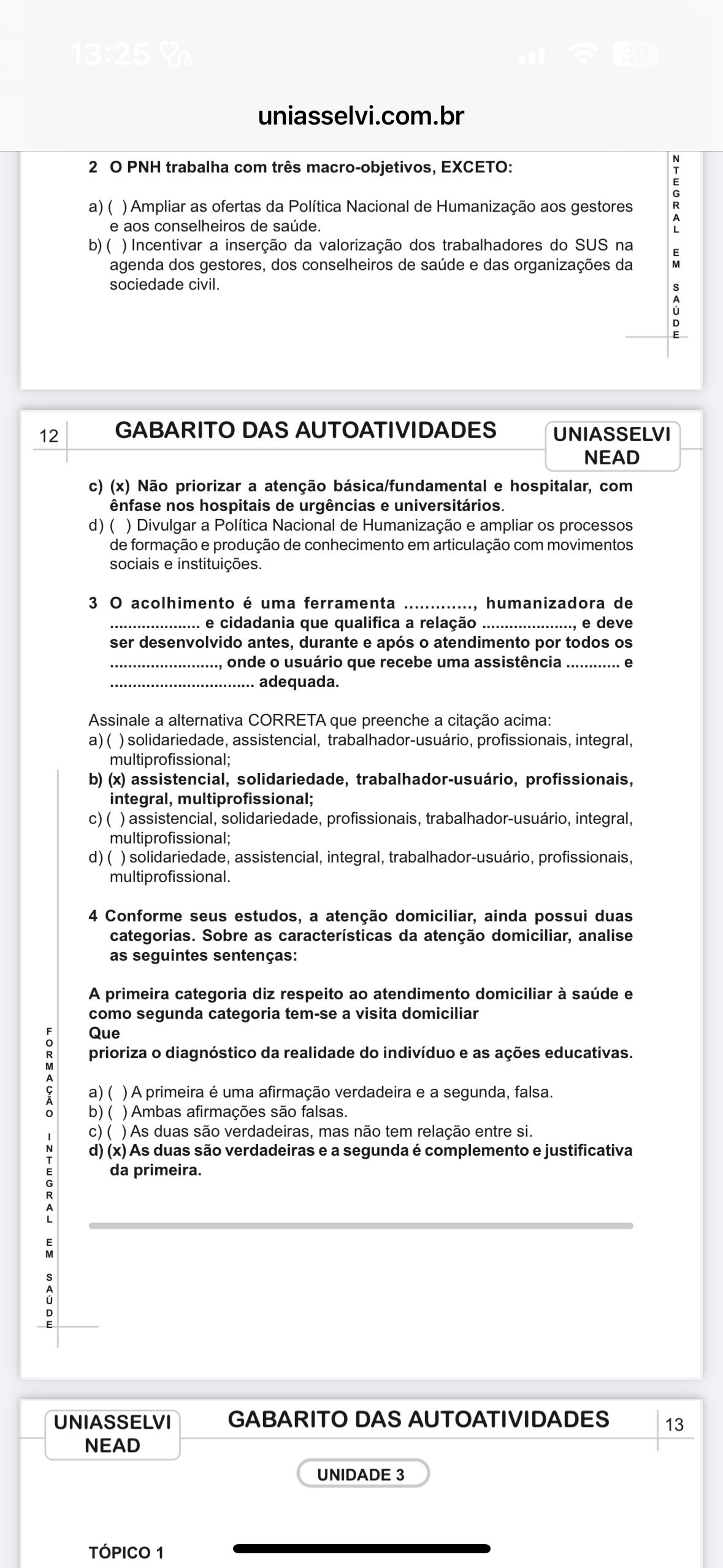 uniasselvi.com.br 2 o PNH trabalha com três macro-objetivos, EXCETO: a) Ampliar as ofertas da Política Nacional de Humanização aos gestores e aos conselheiros de saúde. b) Incentivar a inserção da valorização dos trabalhadores do SUS na agenda dos gestores, dos conselheiros de saúde e das organizações da sociedade civil. M A E D S Ú E 12 GABARITO DAS AUTOATIVIDADES UNIASSELVI NEAD c) (x) Não priorizar a atenção básica/fundamental e hospitalar, com ênfase nos hospitais de urgências e universitários. d) Divulgar a Política Nacional de Humanização e ampliar os processos de formação e produção de conhecimento em articulação com movimentos sociais e instituições. 3 o acolhimento é uma ferramenta humanizadora de e cidadania que qualifica a relação e deve ser desenvolvido antes, durante e após o atendimento por todos os onde o usuário que recebe uma assistência e adequada. Assinale a alternativa CORRETA que preenche a citação acima: a) solidariedade, assistencial, trabalhador-usuário, profissionais, integral, multiprofissional; b) (x) assistencial, solidariedade, trabalhador-usuário, profissionais, integral, multiprofissional; c) assistencial, solidariedade, profissionais, trabalhador-usuário, integral, multiprofissional; d) solidariedade, assistencial, integral, trabalhador-usuário, profissionais, multiprofissional. 4 Conforme seus estudos, a atenção domiciliar, ainda possui duas categorias. Sobre as características da atenção domiciliar, analise as seguintes sentenças: A primeira categoria diz respeito ao atendimento domiciliar à saúde e como segunda categoria tem-se a visita domiciliar Que prioriza diagnóstico da realidade do indivíduo e as ações educativas. a) A primeira é uma afirmação verdadeira e a segunda, falsa. b) Ambas afirmações são falsas. c) As duas são verdadeiras, mas não tem relação entre si. d) (x) As duas são verdadeiras e a segunda é complemento e justificativa da primeira. EM UNIASSELVI GABARITO DAS AUTOATIVIDADES 13 NEAD UNIDADE 3 TÓPICO 1