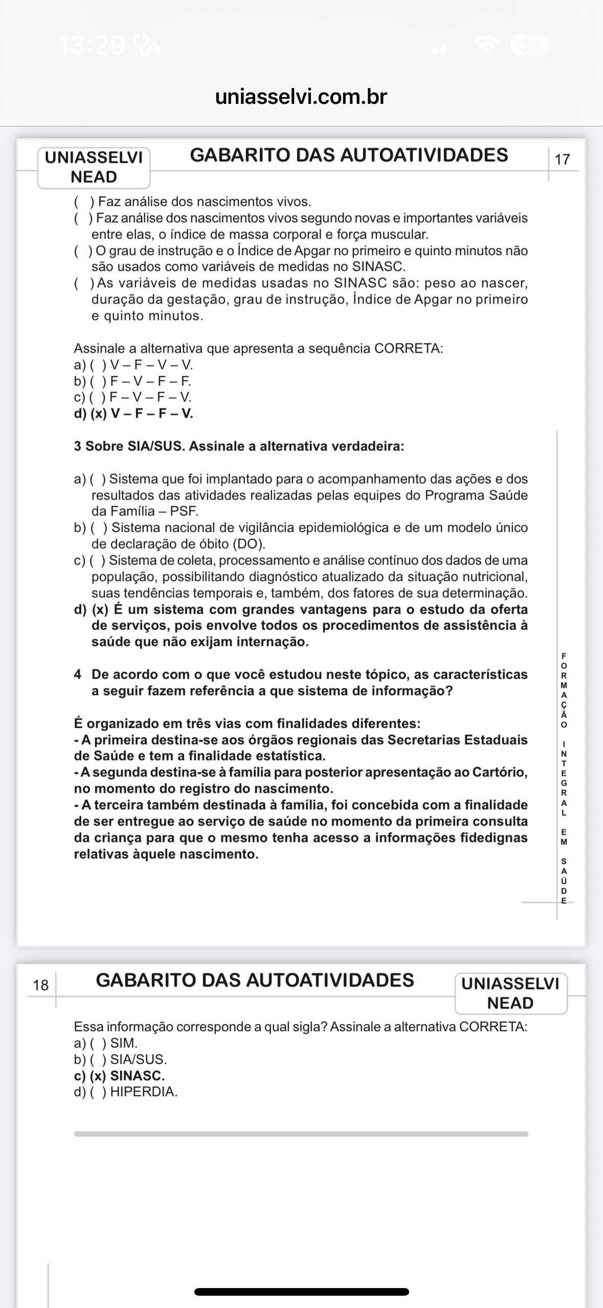 13:29 uniasselvi.com.br UNIASSELVI GABARITO DAS AUTOATIVIDADES 17 NEAD ( ) Faz análise dos nascimentos vivos. Faz análise dos nascimentos vivos segundo novas e importantes variáveis entre elas, o índice de massa corporal e força muscular. ( ) grau de instrução e o Índice de Apgar no primeiro e quinto minutos não são usados como variáveis de medidas no SINASC. ( ) As variáveis de medidas usadas no SINASC são: peso ao nascer, duração da gestação, grau de instrução, Índice de Apgar no primeiro e quinto minutos. Assinale a alternativa que apresenta a sequência CORRETA: b)()F-V-F-F. d) 3 Sobre SIA/SUS. Assinale a alternativa verdadeira: a) Sistema que foi implantado para o acompanhamento das ações e dos resultados das atividades realizadas pelas equipes do Programa Saúde da Família - PSF. b) Sistema nacional de vigilância epidemiológica e de um modelo único de declaração de óbito (DO). c) Sistema de coleta, processamento e análise contínuo dos dados de uma população, possibilitando diagnóstico atualizado da situação nutricional, suas tendências temporais e, também, dos fatores de sua determinação. d) (x) É um sistema com grandes vantagens para o estudo da oferta de serviços, pois envolve todos os procedimentos de assistência à saúde que não exijam internação. 4 De acordo com que você estudou neste tópico, as características a seguir fazem referência a que sistema de informação? É organizado em três vias com finalidades diferentes: A primeira destina-se aos órgãos regionais das Secretarias Estaduais de Saúde e tem a finalidade estatística. A segunda destina-se à família para posterior apresentação ao Cartório, no momento do registro do nascimento. A terceira também destinada à família, foi concebida com a finalidade de ser entregue ao serviço de saúde no momento da primeira consulta da criança para que o mesmo tenha acesso a informações fidedignas M A N E G E R E L T relativas àquele nascimento. 18 GABARITO DAS AUTOATIVIDADES UNIASSELVI NEAD Essa informação corresponde a qual sigla? Assinale a alternativa CORRETA: a) ( ) SIM. b) SIA/SUS. c) (x) SINASC. d) ( ) HIPERDIA.