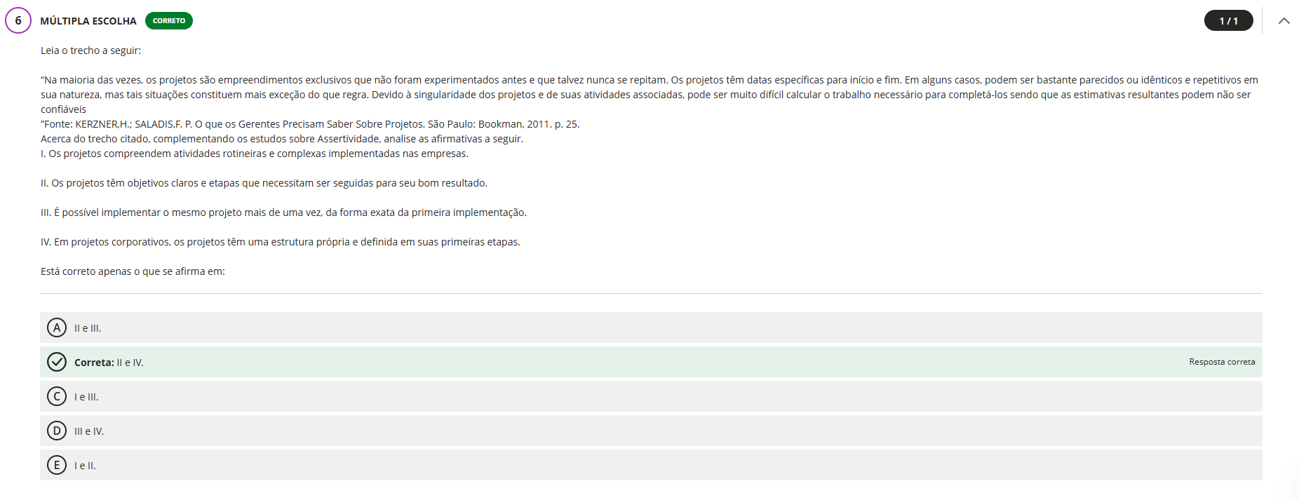 6 MÚLTIPLA ESCOLHA CORRETO 1/1 Leia trecho a seguir: "Na maioria das vezes, os projetos são empreendimentos exclusivos que não foram experimentados antes e que talvez nunca se repitam. Os projetos têm datas específicas para início e fim. Em alguns casos, podem ser bastante parecidos ou idênticos e repetitivos em sua natureza, mas tais situações constituem mais exceção do que regra. Devido à singularidade dos projetos e de suas atividades associadas, pode ser muito difícil calcular 0 trabalho necessário para completá-los sendo que as estimativas resultantes podem não ser confiáveis "Fonte: KERZNER,H.; SALADIS,F. P. que os Gerentes Precisam Saber Sobre Projetos. São Paulo: Bookman, 2011. p. 25. Acerca do trecho citado, complementando os estudos sobre Assertividade, analise as afirmativas a seguir. I. Os projetos compreendem atividades rotineiras e complexas implementadas nas empresas. II. Os projetos têm objetivos claros e etapas que necessitam ser seguidas para seu bom resultado. III. É possível implementar O mesmo projeto mais de uma vez, da forma exata da primeira implementação. IV. Em projetos corporativos, os projetos têm uma estrutura própria e definida em suas primeiras etapas. Está correto apenas O que se afirma em: A II III. Correta: II e IV. Resposta correta C III. D III IV. E II.