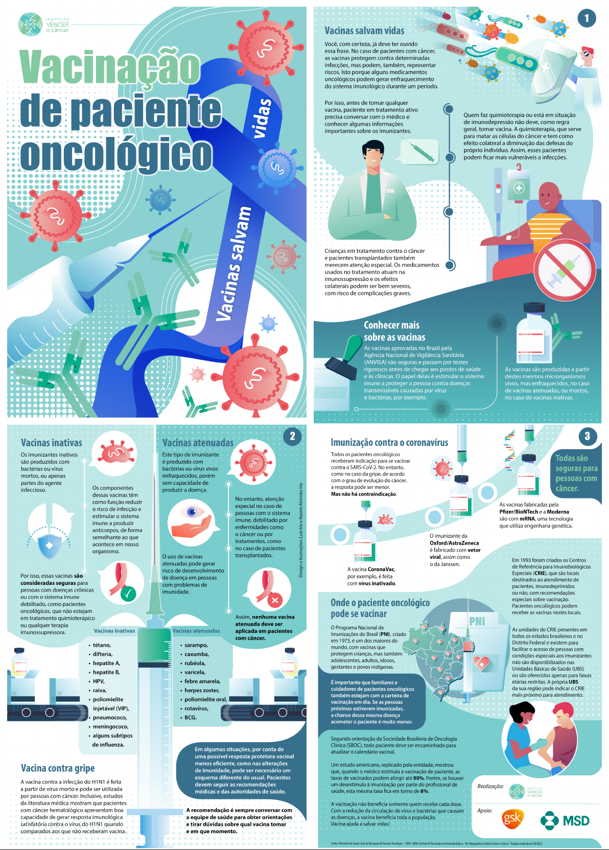 INSTITUTO 1 VENCER câncer Vacinas salvam vidas Você, com certeza, já deve ter ouvido essa frase. No caso de pacientes com câncer, as vacinas protegem contra determinadas infecções, mas podem, também, representar riscos. Isto porque alguns medicamentos oncológicos podem gerar enfraquecimento do sistema imunológico durante um período. de paciente Por isso, antes de tomar qualquer vidas vacina, paciente em tratamento ativo precisa conversar com médico e Quem faz quimioterapia ou está em situação conhecer algumas informações de imunodepressão não deve, como regra importantes sobre os imunizantes. geral, tomar vacina. A quimioterapia, que serve para matar as células do câncer e tem como oncológico efeito colateral a diminuição das defesas do próprio indivíduo. Assim, esses pacientes podem ficar mais vulneráveis a infecções. Vacinas salvam Crianças em tratamento contra câncer e pacientes transplantados também merecem atenção especial. Os medicamentos usados no tratamento atuam na imunossupressão e os efeitos colaterais podem ser bem severos, com risco de complicações graves. Conhecer mais sobre as vacinas As vacinas aprovadas no Brasil pela Agência Nacional de Vigilância Sanitária (ANVISA) são seguras e passam por testes rigorosos antes de chegar aos postos de saúde As vacinas são produzidas a partir e às clínicas. papel delas é estimular sistema destes mesmos microrganismos imune a proteger a pessoa contra doenças vivos, mas enfraquecidos, no caso transmissíveis causadas por vírus de vacinas atenuadas, ou mortos, e bactérias, por exemplo. no caso de vacinas inativas. 2 3 Vacinas inativas Vacinas atenuadas Imunização contra 0 coronavírus Os imunizantes inativos Este tipo de imunizante Todos pacientes oncológicos são produzidos com é produzido com receberam indicação para se vacinar Todas são bactérias ou vírus bactérias ou vírus vivos contra SARS-CoV-2. No entanto, seguras para mortos, ou apenas enfraquecidos, porém como no caso da gripe, de acordo partes do agente sem capacidade de com grau de evolução do câncer, pessoas com infeccioso. Os componentes produzir doença. a resposta pode ser menor. câncer. dessas vacinas têm Mas não há contraindicação. como função reduzir No entanto, atenção risco de infecção e especial no caso de estimular o sistema o câncer ou por semelhante ao que tratamentos, como acontece em nosso no caso de pacientes Design ilustrações: Luiz Iria Naomi Akimoto Iria As vacinas fabricadas pela pessoas com sistema Pfizer/BioNTech e a Moderna imune, debilitado por são com mRNA, uma tecnologia imune produzir enfermidades como que utiliza engenharia genética. anticorpos, de forma imunizante da Oxford/AstraZeneca organismo. é fabricado com vetor uso de vacinas transplantados. viral, assim como Em 1993 foram criados os Centros atenuadas pode gerar da Janssen. de Referência para Imunobiológicos risco de desenvolvimento A vacina CoronaVac, Por isso, essas vacinas são Especiais (CRIE), que são locais de doença em pessoas por exemplo, é feita destinados ao atendimento de consideradas seguras para com problemas de com vírus pacientes, imunodeprimidos pessoas com doenças crônicas imunidade. ou não, com recomendações ou com sistema imune debilitado, como pacientes Onde 0 paciente oncológico especiais sobre vacinação. Pacientes oncológicos podem oncológicos, que não estejam em tratamento quimioterápico Assim, nenhuma vacina pode se vacinar receber as vacinas nestes locais. atenuada deve ser PNI ou qualquer terapia Programa Nacional de imunossupressora. Vacinas inativas Vacinas atenuadas aplicada em pacientes As unidades do CRIE presentes em Imunizações do Brasil (PNI), criado com câncer. todos os estados brasileiros e no em 1973, é um dos maiores do tétano, Distrito Federal e existem para sarampo, mundo, com vacinas que facilitar acesso de pessoas com difteria, caxumba, protegem crianças, mas também condições especiais aos imunizantes hepatite rubéola, adolescentes, adultos, idosos, não são disponibilizados nas gestantes e povos indígenas. Unidades Básicas de Saúde (UBS) hepatite B, varicela, ou são oferecidos apenas para faixas HPV, febre amarela, É importante que familiares e etárias restritas. A própria UBS raiva, herpes zoster, cuidadores de pacientes oncológicos da sua região pode indicar CRIE também estejam com a carteira de mais próximo para atendimento. poliomielite poliomielite oral, vacinação em dia. Se as pessoas injetável (VIP), rotavírus, próximas estiverem imunizadas, pneumococo, BCG. a chance dessa mesma doença acometer paciente é muito menor. meningococo, alguns subtipos Segundo orientação da Sociedade Brasileira de Oncologia de influenza. Clínica (SBOC), todo paciente deve ser encaminhado para Em algumas situações, por conta de atualizar calendário vacinal. uma possível resposta protetora vacinal menos eficiente, como nas alterações Vacina contra gripe Um estudo americano, replicado pela entidade, mostrou de imunidade, pode ser necessário um que, quando médico estimula a vacinação de paciente, as esquema diferente do usual. Pacientes taxas de vacinados podem atingir até 90%. Porém, se houver A vacina contra a infecção do H1N1 é feita devem seguir as recomendações um desestímulo à imunização por parte do profissional de a partir de vírus morto e pode ser utilizada Realização: médicas e das autoridades de saúde. saúde, esta mesma taxa fica em torno de 8% VENCER por pessoas com câncer. Inclusive, estudos da literatura médica mostram que pacientes A vacinação não beneficia somente quem recebe cada dose. com câncer hematológico apresentam boa A recomendação é sempre conversar com Com redução da circulação de vírus e bactérias que causam Apoio: capacidade de gerar resposta imunológica equipe de saúde para obter orientações as doenças, a vacina beneficia toda a população. gsk satisfatória contra