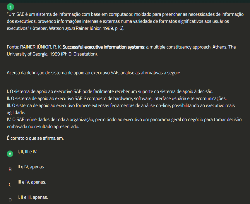 1 "Um SAE é um sistema de informação com base em computador, moldado para preencher as necessidades de informação dos executivos, provendo informações internas e externas numa variedade de formatos significativos aos usuários executivos" (Kroeber; Watson apud Rainer 1989, p. 6). Fonte: RAINER JÚNIOR, R. K. Successful executive information systems: a multiple constituency approach. Athens, The University of Georgia, 1989 (Ph.D. Dissetation). Acerca da definição de sistema de apoio ao executivo SAE, analise as afirmativas a seguir: I. 0 sistema de apoio ao executivo SAE pode facilmente receber um suporte do sistema de apoio à decisão. II. 0 sistema de apoio ao executivo SAE é composto de hardware, software, interface usuária e telecomunicações. III. 0 sistema de apoio ao executivo fornece extensas ferramentas de análise on-line, possibilitando ao executivo mais agilidade. IV. 0 SAE reúne dados de toda a organização, permitindo ao executivo um panorama geral do negócio para tomar decisão embasada no resultado apresentado. É correto que se afirma em: A I, II, III e IV. B e IV, apenas. III e IV, apenas. D I, II e III, apenas.