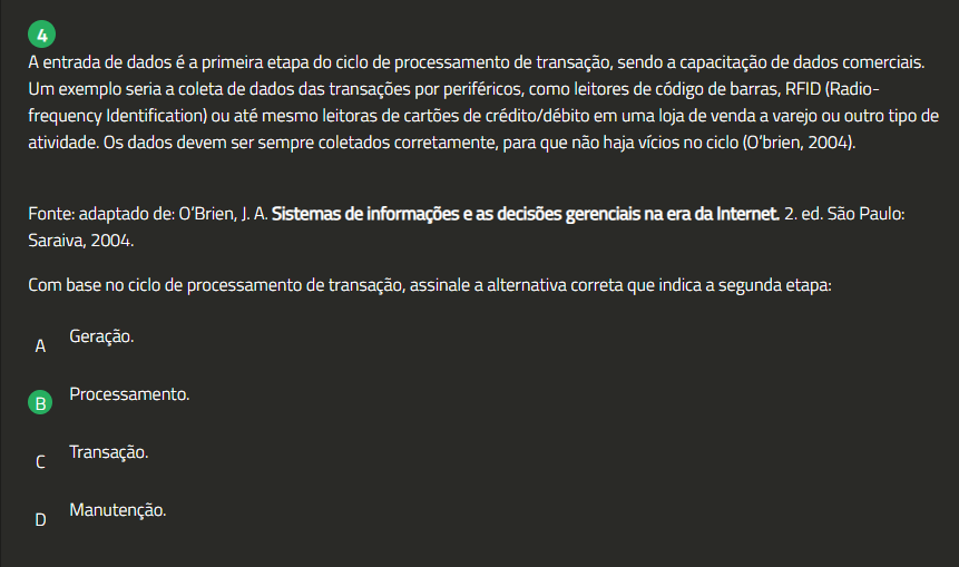 4 A entrada de dados é a primeira etapa do ciclo de processamento de transação, sendo a capacitação de dados comerciais. Um exemplo seria a coleta de dados das transações por periféricos, como leitores de código de barras, RFID (Radio- frequency Identification) ou até mesmo leitoras de cartões de crédito/débito em uma loja de venda a varejo ou outro tipo de atividade. Os dados devem ser sempre coletados corretamente, para que não haja vícios no ciclo (O'brien, 2004). Fonte: adaptado de: O'Brien, J.A. Sistemas de informações e as decisões gerenciais na era da Internet. 2. ed. São Paulo: Saraiva, 2004. Com base no ciclo de processamento de transação, assinale a alternativa correta que indica a segunda etapa: A Geração. Processamento. B Transação. D Manutenção.