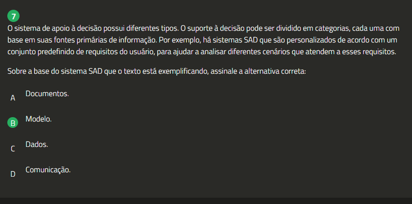 7 0 sistema de apoio à decisão possui diferentes tipos. 0 suporte à decisão pode ser dividido em categorias, cada uma com base em suas fontes primárias de informação. Por exemplo, há sistemas SAD que são personalizados de acordo com um conjunto predefinido de requisitos do usuário, para ajudar a analisar diferentes cenários que atendem a esses requisitos. Sobre a base do sistema SAD que 0 texto está exemplificando, assinale a alternativa correta: Documentos. A Modelo. Dados. D Comunicação.