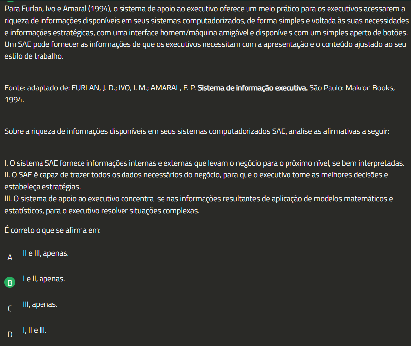 Para Furlan, Ivo e Amaral (1994), 0 sistema de apoio ao executivo oferece um meio prático para executivos acessarem a riqueza de informações disponíveis em seus sistemas computadorizados, de forma simples e voltada às suas necessidades e informações estratégicas, com uma interface homem/máquina amigável e disponíveis com um simples aperto de botões. Um SAE pode fornecer as informações de que executivos necessitam com a apresentação e 0 conteúdo ajustado ao seu estilo de trabalho. Fonte: adaptado de: FURLAN, J. D.; IVO, M.; AMARAL, F.P. Sistema de informação executiva. São Paulo: Makron Books, 1994. Sobre a riqueza de informações disponíveis em seus sistemas computadorizados SAE, analise as afirmativas a seguir: 0 sistema SAE fornece informações internas e externas que levam 0 negócio para 0 próximo nível, se bem interpretadas. II. 0 SAE é capaz de trazer todos dados necessários do negócio, para que 0 executivo tome as melhores decisões e estabeleça estratégias. III. 0 sistema de apoio ao executivo concentra-se nas informações resultantes de aplicação de modelos matemáticos e estatísticos, para executivo resolver situações complexas. É correto que se afirma em: A e III, apenas. B e II, apenas. III, apenas. D I, e III.