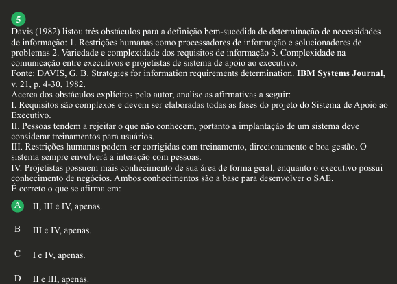 5 Davis (1982) listou três obstáculos para a definição bem-sucedida de determinação de necessidades de informação: 1. Restrições humanas como processadores de informação e solucionadores de problemas 2. Variedade e complexidade dos requisitos de informação 3. Complexidade na comunicação entre executivos e projetistas de sistema de apoio ao executivo. Fonte: DAVIS, G.B. Strategies for information requirements determination. IBM Systems Journal, V. 21, p. 4-30, 1982. Acerca dos obstáculos explicitos pelo autor, analise as afirmativas a seguir: I. Requisitos são complexos e devem ser elaboradas todas as fases do projeto do Sistema de Apoio ao Executivo. II. Pessoas tendem a rejeitar que não conhecem, portanto a implantação de um sistema deve considerar treinamentos para III. Restrições humanas podem ser corrigidas com treinamento, direcionamento e boa gestão. O sistema sempre a interação com pessoas. IV. Projetistas possuem mais conhecimento de sua area de forma geral, enquanto executivo possui conhecimento de negócios. Ambos conhecimentos são a base para desenvolver SAE. correto que se afirma em: A II, III e IV, apenas. B III e IV, apenas. C I e IV, apenas. D II e III, apenas.