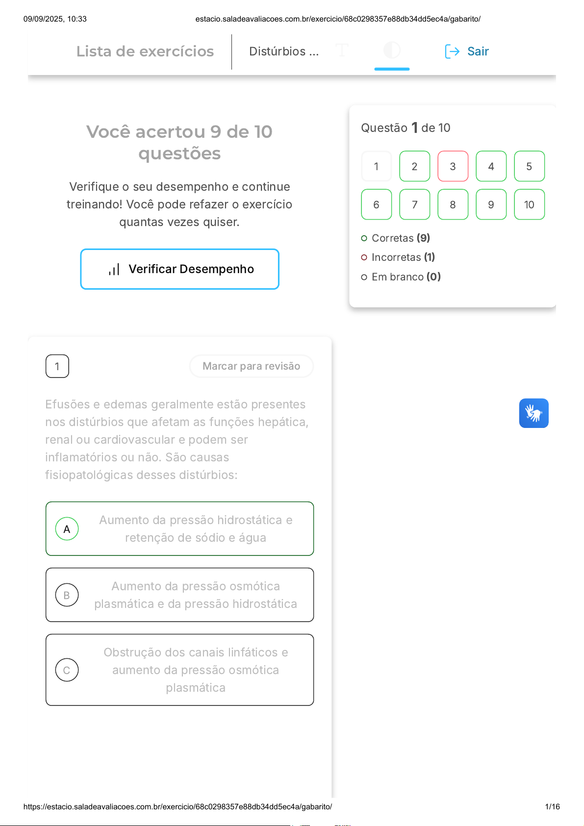 Você acertou 9 de 10 questões Verifique o seu desempenho e continue treinando! Você pode refazer o exercício quantas vezes quiser. Verificar Desempenho A B C 1 Marcar para revisão Efusões e edemas geralmente estão presentes nos distúrbios que afetam as funções hepática, renal ou cardiovascular e podem ser inflamatórios ou não. São causas fisiopatológicas desses distúrbios: Aumento da pressão hidrostática e retenção de sódio e água Aumento da pressão osmótica plasmática e da pressão hidrostática Obstrução dos canais linfáticos e aumento da pressão osmótica plasmática Questão 1 de 10 Corretas (9) Incorretas (1) Em branco (0) 1 2 3 4 5 6 7 8 9 10 Lista de exercícios Distúrbios … Sair 09/09/2025, 10:33 estacio.saladeavaliacoes.com.br/exercicio/68c0298357e88db34dd5ec4a/gabarito/ https://estacio.saladeavaliacoes.com.br/exercicio/68c0298357e88db34dd5ec4a/gabarito/ 1/16 D E Diminuição da pressão hidrostática e retenção de sódio e água Aumento da síntese de albumina e hiperperfusão renal Resposta correta Parabéns, você selecionou a alternativa correta. Confira o gabarito comentado! Gabarito Comentado O aumento da pressão hidrostática e a retenção de sódio e água são causas fisiopatológicas de distúrbios que afetam as funções hepática, renal ou cardiovascular e que podem resultar em efusões e edemas. A pressão hidrostática é a força que o sangue exerce contra as paredes dos vasos sanguíneos. Quando essa pressão aumenta, pode levar ao acúmulo de líquido nos tecidos, causando edema. Da mesma forma, a retenção de sódio e água no corpo pode aumentar o volume de fluido nos vasos sanguíneos, aumentando a pressão hidrostática e contribuindo para a formação de edema. 2 Marcar para revisão Além do coração e dos vasos linfáticos, o sistema circulatório é composto por uma extensa rede de transporte, formada pelas artérias, veias e capilares. Assinale a alternativa 09/09/2025, 10:33 estacio.saladeavaliacoes.com.br/exercicio/68c0298357e88db34dd5ec4a/gabarito/ https://estacio.saladeavaliacoes.com.br/exercicio/68c0298357e88db34dd5ec4a/gabarito/ 2/16 A B C D E que contenha a correta estrutura e a função dos vasos sanguíneos: As artérias são classificadas em três tipos, na ordem: artérias musculares, artérias elásticas e arteríolas. Comparativamente às veias, as artérias possuem paredes mais resistentes, além de diâmetro e luz maiores. A organização das artérias e veias se dá em três camadas, ao contrário dos capilares, que são formados apenas por uma camada de células endoteliais e pericitos. A camada adventícia é a camada em contato com o sangue circulante, formada por única camada de células endoteliais sobre sua membrana basal. A regulação do fluxo sanguíneo para os tecidos é realizada na microcirculação, em que as arteríolas possuem válvulas que impedem o fluxo retrógrado. Resposta correta Parabéns, você selecionou a alternativa correta. Confira o gabarito comentado! Gabarito Comentado As artérias e veias são formadas por três camadas: a íntima, a média e a adventícia. 09/09/2025, 10:33 estacio.saladeavaliacoes.com.br/exercicio/68c0298357e88db34dd5ec4a/gabarito/ https://estacio.saladeavaliacoes.com.br/exercicio/68c0298357e88db34dd5ec4a/gabarito/ 3/16 A íntima é a camada mais interna, composta por células endoteliais e uma camada de tecido conjuntivo. A média é a camada intermediária, composta por fibras musculares lisas e tecido conjuntivo. A adventícia é a camada mais externa, composta por tecido conjuntivo. Os capilares são formados apenas por uma camada de células endoteliais e pericitos. 3 Marcar para revisão Êmbolo é uma massa solta nos vasos sanguíneos, com capacidade de migrar para outros locais da árvore vascular e causar disfunções teciduais. Sobre esse assunto, analise as afirmativas a seguir: I. Êmbolos normalmente possuem natureza gasosa, já que massas sólidas resultam em trombose e massas líquidas, como gotículas de gordura, resultam em aterosclerose. II. Dependendo do local onde o êmbolo tenha se originado, ele pode se alojar em qualquer local da vasculatura. III. A forma mais comum de doença tromboembólica é a embolia pulmonar. IV. As embolias sistêmicas derivam principalmente de trombos cardíacos, murais ou valvares. V. As consequências da embolia variam de acordo com o local obstruído, tamanho e posição do êmbolo. É correto o que se afirma em: 09/09/2025, 10:33 estacio.saladeavaliacoes.com.br/exercicio/68c0298357e88db34dd5ec4a/gabarito/ https://estacio.saladeavaliacoes.com.br/exercicio/68c0298357e88db34dd5ec4a/gabarito/ 4/16 A B C D E I, II, III e IV I, III, IV e V II, III, IV e V III, IV e V II, IV e V Resposta incorreta Opa! A alternativa correta é a letra C. Confira o gabarito comentado! Gabarito Comentado A resposta correta é: II, III, IV e V O local de origem do êmbolo pode determinar sua rota de migração e, consequentemente, onde ele se alojará na vasculatura. A embolia pulmonar é uma das formas mais comuns de doença tromboembólica e pode resultar em graves complicações, como insuficiência respiratória aguda e morte. As embolias sistêmicas podem ter origem em trombos cardíacos, murais ou valvares, entre outras fontes. As consequências da embolia dependem de diversos fatores, incluindo o local onde o êmbolo se aloja, o tamanho do êmbolo e a posição em que ele se encontra na vasculatura. 09/09/2025, 10:33 estacio.saladeavaliacoes.com.br/exercicio/68c0298357e88db34dd5ec4a/gabarito/ https://estacio.saladeavaliacoes.com.br/exercicio/68c0298357e88db34dd5ec4a/gabarito/ 5/16 A B C D E 4 Marcar para revisão A classificação dos infartos é dada pela cor e presença ou não de infecção. Assinale a alternativa que contenha os aspectos associados ao infarto vermelho, ou hemorrágico: Ocorre em tecidos com circulação dupla, como coração e rins. São a regra em infartos pulmonares. Estão sempre associados à a