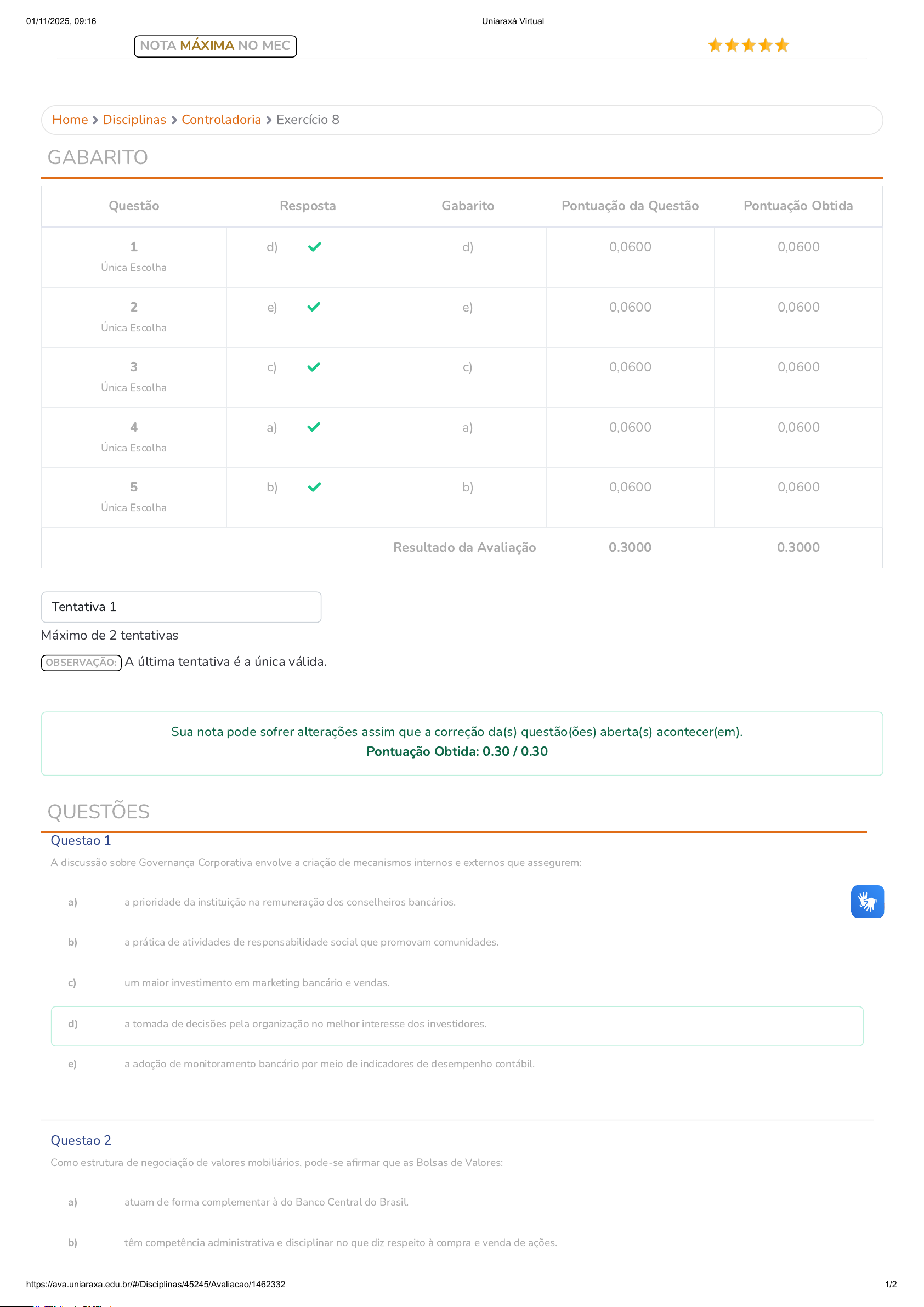 Home Disciplinas Controladoria Exercício 8 GABARITO Questão Resposta Gabarito Pontuação da Questão Pontuação Obtida 1 Única Escolha d) d) 0,0600 0,0600 2 Única Escolha e) e) 0,0600 0,0600 3 Única Escolha c) c) 0,0600 0,0600 4 Única Escolha a) a) 0,0600 0,0600 5 Única Escolha b) b) 0,0600 0,0600 Resultado da Avaliação 0.3000 0.3000 Tentativa 1 Máximo de 2 tentativas OBSERVAÇÃO: A última tentativa é a única válida. Sua nota pode sofrer alterações assim que a correção da(s) questão(ões) aberta(s) acontecer(em). Pontuação Obtida: 0.30 / 0.30 QUESTÕES Questao 1 A discussão sobre Governança Corporativa envolve a criação de mecanismos internos e externos que assegurem: a) a prioridade da instituição na remuneração dos conselheiros bancários. b) a prática de atividades de responsabilidade social que promovam comunidades. c) um maior investimento em marketing bancário e vendas. d) a tomada de decisões pela organização no melhor interesse dos investidores. e) a adoção de monitoramento bancário por meio de indicadores de desempenho contábil. Questao 2 Como estrutura de negociação de valores mobiliários, pode-se afirmar que as Bolsas de Valores: a) atuam de forma complementar à do Banco Central do Brasil. b) têm competência administrativa e disciplinar no que diz respeito à compra e venda de ações. NOTA MÁXIMA NO MEC 01/11/2025, 09:16 Uniaraxá Virtual https://ava.uniaraxa.edu.br/#/Disciplinas/45245/Avaliacao/1462332 1/2 c) devem promover a solução amigável para eventuais conflitos de interesse entre agentes que nelas operam. d) criam ambiente que dá liquidez às ações nelas admitidas. e) produzem informações relevantes e de interesse para a sociedade. Questao 3 No mundo corporativo, é de fundamental importância saber como agir quando o assunto é Sociedades de Capital Aberto. Sociedade de Capital Aberto, portanto, é: a) um tipo de sociedade empresarial que se caracteriza pela participação dos sócios através dos investimentos feitos proporcionalmente às cotas do capital social da empresa. b) é uma empresa constituída por uma única pessoa, na qual o empresário exerce em nome próprio uma atividade empresarial. Ao se formalizar como Empresa Individual terá que cumprir com obrigações tributárias e trabalhistas. c) uma sociedade anônima cujo capital social é formado por ações, ou seja, títulos que representam partes iguais, livremente negociadas no mercado sem necessidade de escrituração pública de propriedade. d) é uma aglutinação de esforços de diversos agentes, interessados nos lucros que uma atividade econômica complexa, de grande porte, que exige muitos investimentos e divergentes capacitações, promete propiciar. e) é a caracterizada pela existência de dois tipos de sócios: os sócios comanditários e os comanditados. Os sócios comanditários têm responsabilidade limitada em relação às obrigações contraídas pela sociedade empresária, respondendo apenas pela integralização das quotas subscritas. Questao 4 Assinale a alternativa que apresenta um dos princípios básicos da Governança Corporativa. a) Prestação de contas (Accountability). b) Segregação de pessoal. c) Responsabilidade de governança pública. d) Sigilo de informações. e) Acúmulo de funções. Questao 5 No exercício das suas funções, a CVM poderá impor penalidades aos infratores da Lei do Mercado de Valores Mobiliários, da Lei das Sociedades por Ações, das suas resoluções, bem como de outras normas legais cujo cumprimento lhe incumba fiscalizar. No exercício dessa atividade fiscalizadora, a CVM poderá, entre outras, aplicar a penalidade de: a) expulsão. b) advertência. c) censura pública. d) inquérito policial. e) alerta administrativo. NOTA MÁXIMA NO MEC 01/11/2025, 09:16 Uniaraxá Virtual https://ava.uniaraxa.edu.br/#/Disciplinas/45245/Avaliacao/1462332 2/2