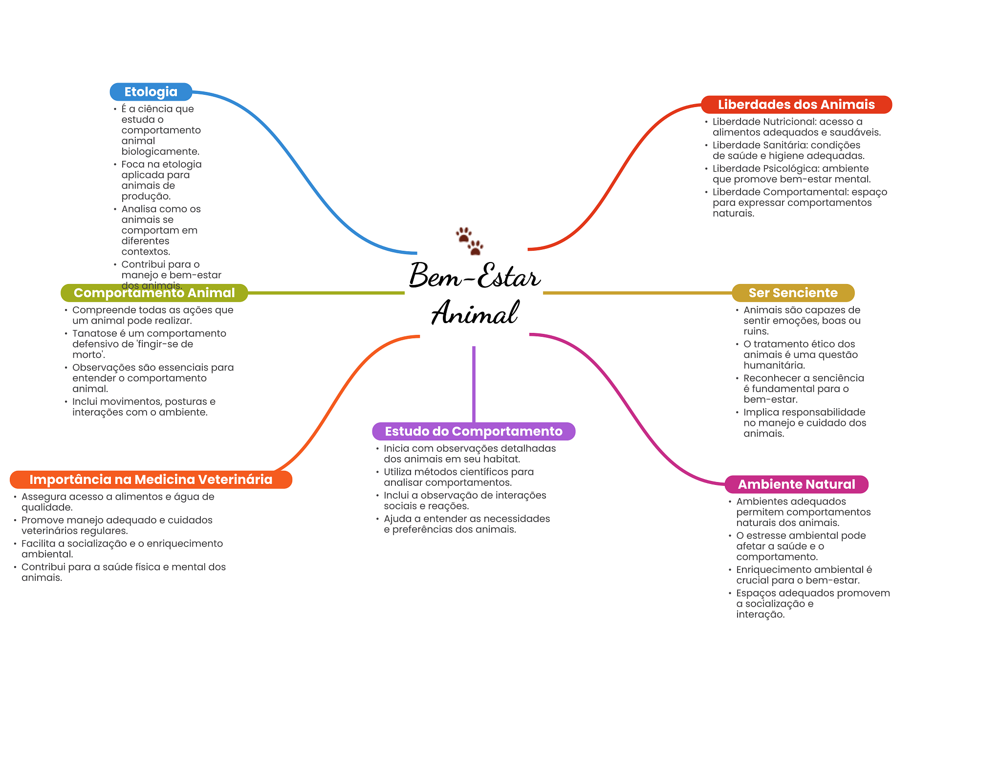 Etologia É a ciência que Liberdades dos Animais estuda Liberdade Nutricional: acesso a comportamento alimentos adequados e saudáveis. animal Liberdade Sanitária: condições biologicamente. de saúde e higiene adequadas. Foca na etologia Liberdade Psicológica: ambiente aplicada para que promove bem-estar mental. animais de produção. Liberdade Comportamental: espaço para expressar comportamentos Analisa como naturais. animais se comportam em diferentes contextos. Contribui para manejo e bem-estar Bem-Estar dos animais Comportamento Animal Ser Senciente Compreende todas as ações que um animal pode realizar. Animal Animais são capazes de sentir emoções, boas ou Tanatose é um comportamento ruins. defensivo de 'fingir-se de tratamento ético dos morto'. animais é uma questão Observações são essenciais para humanitária. entender O comportamento Reconhecer a senciência animal. é fundamental para O Inclui movimentos, posturas e bem-estar. interações com ambiente. Implica responsabilidade no manejo e cuidado dos Estudo do Comportamento animais. Inicia com observações detalhadas dos animais em seu habitat. Utiliza métodos científicos para Importância na Medicina Veterinária analisar comportamentos. Ambiente Natural Assegura acesso a alimentos e água de Inclui a observação de interações sociais e reações. Ambientes adequados qualidade. permitem comportamentos Promove manejo adequado e cuidados Ajuda a entender as necessidades naturais dos animais. veterinários regulares. e preferências dos animais. estresse ambiental pode Facilita a socialização e enriquecimento afetar a saúde e ambiental. comportamento. Contribui para a saúde física e mental dos Enriquecimento ambiental é animais. crucial para bem-estar. Espaços adequados promovem a socialização e interação.
