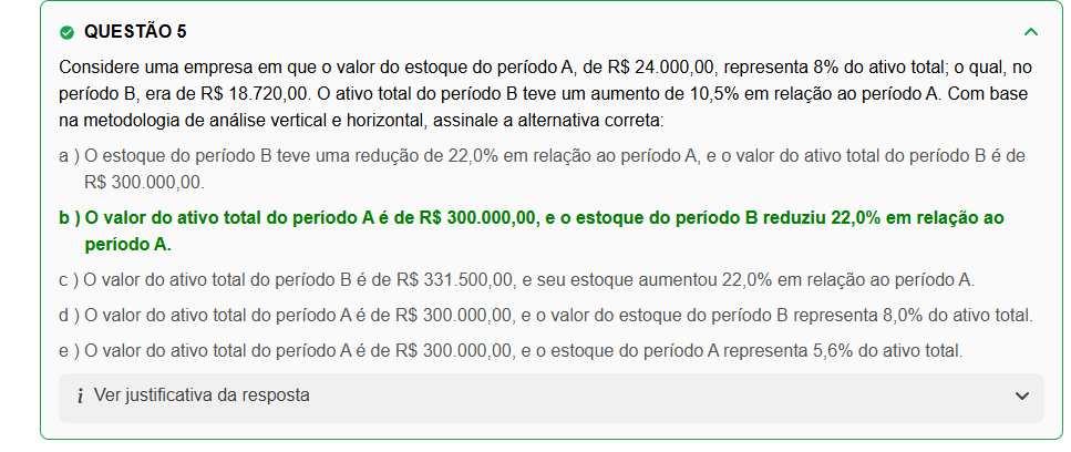 QUESTÃO 5 Considere uma empresa em que 0 valor do estoque do período A, de R$ 24.000,00, representa 8% do ativo total; 0 qual, no B, era de R$ 18.720,00. 0 ativo total do B teve um aumento de 10,5% em relação ao A. Com base na metodologia de análise vertical e horizontal, assinale a alternativa correta: a) estoque do B teve uma redução de 22,0% em relação ao A, e 0 valor do ativo total do B é de R$ 300.000,00. b) valor do ativo total do período A é de R$ 300.000,00, e estoque do período B reduziu 22,0% em relação ao período A. c) O valor do ativo total do período B é de R$ 331.500,00, e seu estoque aumentou 22,0% em relação ao período A. d) valor do ativo total do período A é de R$ 300.000,00, e 0 valor do estoque do período B representa 8,0% do ativo total. e) valor do ativo total do A é de R$ 300.000,00, e 0 estoque do período A representa 5,6% do ativo total. i Ver justificativa da resposta