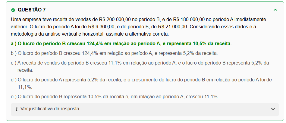 QUESTÃO 7 Uma empresa teve receita de vendas de R$ 200.000,00 no período B, e de R$ 180.000,00 no período A imediatamente anterior. lucro do período A foi de R$ 9.360,00, e do período B, de R$ 21.000,00. Considerando esses dados e a metodologia da análise vertical e horizontal, assinale a alternativa correta: a ) lucro do período B cresceu 124,4% em relação ao período A, e representa 10,5% da receita. b) O lucro do período B cresceu 124,4% em relação ao período A, e representa 5,2% da receita. c) A receita de vendas do período B cresceu 11,1% em relação ao período A, e lucro do período B representa 5,2% da receita. d) O lucro do período A representa 5,2% da receita, e O crescimento do lucro do período B em relação ao período A foi de 11,1%. e ) lucro do período B representa 10,5% da receita e, em relação ao período A, cresceu 11,1%. i Ver justificativa da resposta