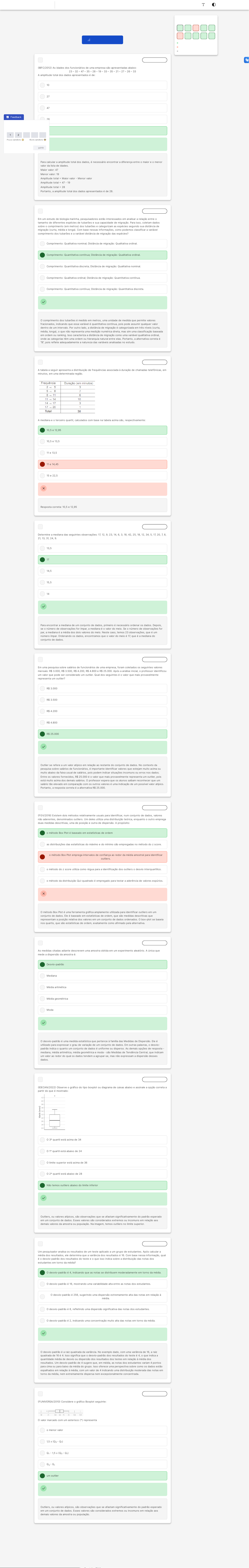 Você acertou 8 de 10 questões Verifique o seu desempenho e continue treinando! Você pode refazer o exercício quantas vezes quiser. Verificar Desempenho A B C D E A B C D E A B C D E A B C D E A B C D E A B C D E A B C D E A B C D E A B C D E A B C D E 1 Marcar para revisão �IBFC/2012� As idades dos funcionários de uma empresa são apresentadas abaixo: 23 � 32 � 47 � 35 � 28 � 19 � 33 � 35 � 21 � 27 � 26 � 33 A amplitude total dos dados apresentados é de: 10 27 47 26 28 Resposta correta Parabéns, você selecionou a alternativa correta. Confira o gabarito comentado! Gabarito Comentado Para calcular a amplitude total dos dados, é necessário encontrar a diferença entre o maior e o menor valor da lista de idades. Maior valor: 47 Menor valor: 19 Amplitude total � Maior valor � Menor valor Amplitude total � 47 � 19 Amplitude total � 28 Portanto, a amplitude total dos dados apresentados é de 28. 2 Marcar para revisão Em um estudo de biologia marinha, pesquisadores estão interessados em analisar a relação entre o tamanho de diferentes espécies de tubarões e sua capacidade de migração. Para isso, coletam dados sobre o comprimento (em metros) dos tubarões e categorizam as espécies segundo sua distância de migração (curta, média e longa). Com base nessas informações, como podemos classificar a variável comprimento dos tubarões e a variável distância de migração das espécies? Comprimento: Qualitativa nominal; Distância de migração: Qualitativa ordinal. Comprimento: Quantitativa contínua; Distância de migração: Qualitativa ordinal. Comprimento: Quantitativa discreta; Distância de migração: Qualitativa nominal. Comprimento: Qualitativa ordinal; Distância de migração: Quantitativa contínua. Comprimento: Quantitativa contínua; Distância de migração: Quantitativa discreta. Resposta correta Parabéns, você selecionou a alternativa correta. Confira o gabarito comentado! Gabarito Comentado O comprimento dos tubarões é medido em metros, uma unidade de medida que permite valores fracionados, indicando que essa variável é quantitativa contínua, pois pode assumir qualquer valor dentro de um intervalo. Por outro lado, a distância de migração é categorizada em três níveis (curta, média, longa), o que não representa uma medição numérica direta, mas sim uma classificação baseada em ordem ou ranking. Isso caracteriza a distância de migração como uma variável qualitativa ordinal, onde as categorias têm uma ordem ou hierarquia natural entre elas. Portanto, a alternativa correta é "B", pois reflete adequadamente a natureza das variáveis analisadas no estudo. 3 Marcar para revisão A tabela a seguir apresenta a distribuição de frequências associada à duração de chamadas telefônicas, em minutos, em uma determinada região. A mediana e o terceiro quartil, calculados com base na tabela acima são, respectivamente: 10,5 e 12,95 10,5 e 13,5 11 e 13,5 11 e 14,45 15 e 22,5 Resposta incorreta Opa! A alternativa correta é a letra A. Confira o gabarito comentado! Gabarito Comentado Resposta correta: 10,5 e 12,95 4 Marcar para revisão Determine a mediana das seguintes observações: 17, 12, 9, 23, 14, 6, 3, 18, 42, 25, 18, 12, 34, 5, 17, 20, 7, 8, 21, 13, 31, 24, 9. 13,5 17 14,5 15,5 14 Resposta correta Parabéns, você selecionou a alternativa correta. Confira o gabarito comentado! Gabarito Comentado Para encontrar a mediana de um conjunto de dados, primeiro é necessário ordenar os dados. Depois, se o número de observações for ímpar, a mediana é o valor do meio. Se o número de observações for par, a mediana é a média dos dois valores do meio. Neste caso, temos 23 observações, que é um número ímpar. Ordenando os dados, encontramos que o valor do meio é 17, que é a mediana do conjunto de dados. 5 Marcar para revisão Em uma pesquisa sobre salários de funcionários de uma empresa, foram coletados os seguintes valores mensais: R$ 3.000, R$ 3.500, R$ 4.200, R$ 4.800 e R$ 25.000. Após a análise inicial, o professor identificou um valor que pode ser considerado um outlier. Qual dos seguintes é o valor que mais provavelmente representa um outlier? R$ 3.000 R$ 3.500 R$ 4.200 R$ 4.800 R$ 25.000 Resposta correta Parabéns, você selecionou a alternativa correta. Confira o gabarito comentado! Gabarito Comentado Outlier se refere a um valor atípico em relação ao restante do conjunto de dados. No contexto da pesquisa sobre salários de funcionários, é importante identificar valores que estejam muito acima ou muito abaixo da faixa usual de salários, pois podem indicar situações incomuns ou erros nos dados. Entre os valores fornecidos, R$ 25.000 é o valor que mais provavelmente representa um outlier, pois está muito acima dos demais salários. O professor espera que os alunos saibam reconhecer que um salário tão elevado em comparação com os outros valores é uma indicação de um possível valor atípico. Portanto, a resposta correta é a alternativa R$ 25.000. 6 Marcar para revisão �FGV/2016� Existem dois métodos relativamente usuais para identificar, num conjunto de dados, valores não aderentes, denominados outliers. Um deles utiliza uma distribuição teórica, enquanto o outro emprega duas medidas descritivas, uma de posição e outra de dispersão. A propósito: o método Box Plot é baseado em estatísticas de ordem as distribuições das estatísticas do máximo e do mínimo são empregadas no método do z score. o método Box Plot emprega intervalos de confiança ao redor da média amostral para identificar outliers. o método do z score utiliza como régua para a identificação dos outliers o desvio interquartílico. o método da distribuição Qui-quadrado é empregado para testar a aderência de valores espúrios. Resposta incorreta Opa! A alternativa correta é a letra A. Confira o gabarito comentado! Gabarito Comentado O método Box Plot é uma ferramenta gráfica amp