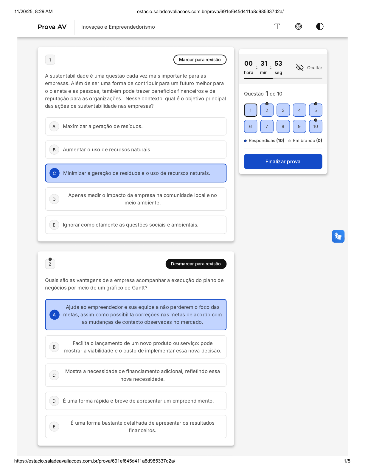A B C D E A B C D E 1 Marcar para revisão A sustentabilidade é uma questão cada vez mais importante para as empresas. Além de ser uma forma de contribuir para um futuro melhor para o planeta e as pessoas, também pode trazer benefícios financeiros e de reputação para as organizações. Nesse contexto, qual é o objetivo principal das ações de sustentabilidade nas empresas? Maximizar a geração de resíduos. Aumentar o uso de recursos naturais. Minimizar a geração de resíduos e o uso de recursos naturais. Apenas medir o impacto da empresa na comunidade local e no meio ambiente. Ignorar completamente as questões sociais e ambientais. 2 Desmarcar para revisão Quais são as vantagens de a empresa acompanhar a execução do plano de negócios por meio de um gráfico de Gantt? Ajuda ao empreendedor e sua equipe a não perderem o foco das metas, assim como possibilita correções nas metas de acordo com as mudanças de contexto observadas no mercado. Facilita o lançamento de um novo produto ou serviço: pode mostrar a viabilidade e o custo de implementar essa nova decisão. Mostra a necessidade de financiamento adicional, refletindo essa nova necessidade. É uma forma rápida e breve de apresentar um empreendimento. É uma forma bastante detalhada de apresentar os resultados financeiros. 00 hora : 31 min : 53 seg Ocultar Questão 1 de 10 Respondidas (10) Em branco (0) Finalizar prova 1 2 3 4 5 6 7 8 9 10 Prova AV Inovação e Empreendedorismo 11/20/25, 8:29 AM estacio.saladeavaliacoes.com.br/prova/691ef645d411a8d985337d2a/ https://estacio.saladeavaliacoes.com.br/prova/691ef645d411a8d985337d2a/ 1/5 A B C D E A B C D E 3 Marcar para revisão O trabalho em equipe é vantajoso para a inovação. Assinale a alternativa que indica uma das vantagens dessa forma de trabalho. Pessoas respondem menos por suas escolhas quando estão em grupo. Pode estimular níveis de competição não produtivos. Pessoas com personalidade dominante podem ter influência desigual em relação aos outros e aos resultados da equipe. Pressão para o consenso pode limitar a qualidade das soluções. Mais oportunidades de criar e melhorar ideias na interação de colegas de trabalho. 4 Marcar para revisão Após colher informações sobre o mercado, a empresa deve traçar uma estratégia de atuação. Sobre a estratégia de diferenciação de produto, podemos dizer que: É a estratégia que diferencia seu produto ou serviço em relação às empresas concorrentes. É a responsabilidade social ao escolher os consumidores-alvo. É a ferramenta de pesquisas de mercado para produtos e serviços de tecnologia. É a venda de produtos ou serviços considerada como uma substituição de compra. É a seleção do segmento de mercado que a empresa vai atuar. 5 Desmarcar para revisão Durante uma análise financeira, um empreendedor percebe que aumentar os investimentos em projetos de alta rentabilidade pode comprometer sua 11/20/25, 8:29 AM estacio.saladeavaliacoes.com.br/prova/691ef645d411a8d985337d2a/ https://estacio.saladeavaliacoes.com.br/prova/691ef645d411a8d985337d2a/ 2/5 A B C D E A B C D E capacidade de pagar fornecedores a curto prazo. Diante desse dilema, qual a principal implicação para a gestão financeira da empresa? A liquidez pode ser descartada em favor de maior lucratividade imediata. A ausência de liquidez impede a mensuração da rentabilidade real. A rentabilidade elevada garante, a saúde financeira da empresa. O equilíbrio entre liquidez e rentabilidade é crucial para decisões sustentáveis. O aumento da liquidez reduz automaticamente os riscos operacionais. 6 Marcar para revisão Na seção Plano Financeiro é apresentado o resultado financeiro esperado a partir do momento em que o Plano de negócios é colocado em prática. Um dos itens importantes desta seção é o ponto de equilíbrio. Assinale a alternativa que define ponto de equilíbrio. As receitas e despesas da empresa comparadas com o objetivo de estimar se a empresa vai operar com lucro ou prejuízo. O nível de faturamento (receitas) mínimo para que a empresa não tenha resultado negativo (prejuízo). O tempo necessário para o empreendedor ou investidor recuperar o capital (dinheiro) investido numa empresa. A relação (um quociente) entre lucro e receita bruta total - receita sem descontar os impostos e outras baixas de contabilidade. O lucro estimado da empresa após 5 anos de funcionamento comparado ao investimento feito. 7 Marcar para revisão O papiro foi uma planta de grande importância para os egípcios, pois foi com ela que esta civilização desenvolveu seu suporte para a escrita. O papiro se mostrou um suporte de grande qualidade, tanto em maleabilidade quanto em sensibilidade à tinta. Tal suporte proporcionou o grande triunfo 11/20/25, 8:29 AM estacio.saladeavaliacoes.com.br/prova/691ef645d411a8d985337d2a/ https://estacio.saladeavaliacoes.com.br/prova/691ef645d411a8d985337d2a/ 3/5 A B C D E A B C D E que foi a biblioteca de Alexandria e fez com que outros povos aderissem ao uso do mesmo material. MACIEL, J. História sobre o papel. UFMG, 2021 Considerando a importância do papiro para a difusão do conhecimento na antiguidade, podemos considerá-lo como: Uma forma de manter o conhecimento intangível. Uma forma de desvalorizar os saberes locais. Uma forma de infraestrutura de armazenamento do conhecimento. Uma forma de diminuir a comunicação entre os grupos. Uma forma de dissipar o conhecimento. 8 Marcar para revisão No planejamento das operações de uma empresa, três conceitos importantes devem estar no radar de atenção do gestor: o nível de estoque, a capacidade produtiva ou instalada e a previsão de vendas. Em relação ao conceito de previsão de vendas, é correto afirmar que: Depende do orçamento de publicidade estabelecido no planejamento estratégico. Representa a quantidade máxima de produtos ou serviços que uma empresa pode produzir num período. Não se aplica a empresas prestadoras de serviç