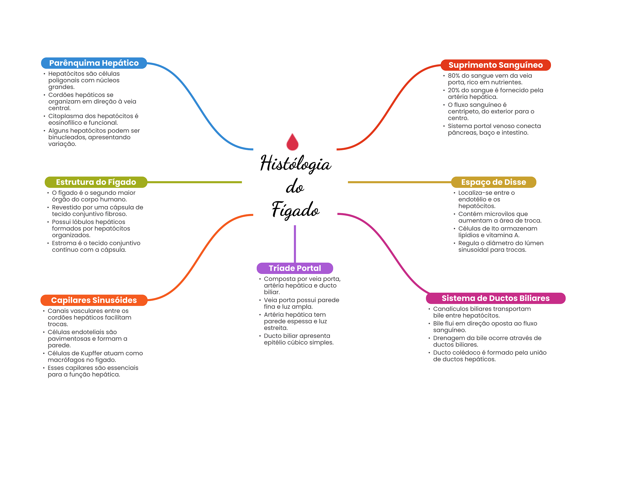 Parênquima Hepático Suprimento Sanguíneo Hepatócitos são células 80% do sangue vem da veia poligonais com núcleos porta, rico em nutrientes. grandes. 20% do sangue é fornecido pela Cordões hepáticos se artéria hepática. organizam em direção à veia central. fluxo sanguíneo é do exterior para Citoplasma dos hepatócitos é centro. eosinofílico e funcional. Sistema portal venoso conecta Alguns hepatócitos podem ser pâncreas, baço e intestino. binucleados, apresentando variação. Histólogia Estrutura do Fígado do Espaço de Disse fígado é segundo maior Localiza-se entre órgão do corpo humano. endotélio e Revestido por uma cápsula de tecido conjuntivo fibroso. Figado hepatócitos. Contém microvilos que Possui lóbulos hepáticos aumentam a área de troca. formados por hepatócitos Células de Ito armazenam organizados. lipídios e vitamina A. Estroma é O tecido conjuntivo Regula diâmetro do lúmen contínuo com a cápsula. sinusoidal para trocas. Tríade Portal Composta por veia porta, artéria hepática e ducto biliar. Capilares Sinusóides Veia porta possui parede Sistema de Ductos Biliares fina e luz ampla. Canais vasculares entre Canalículos biliares transportam cordões hepáticos facilitam Artéria hepática tem bile entre hepatócitos. trocas. parede espessa e luz Bile flui em direção oposta ao fluxo estreita. Células endoteliais são sanguíneo. pavimentosas e formam a Ducto biliar apresenta Drenagem da bile ocorre através de parede. epitélio cúbico simples. ductos biliares. Células de Kupffer atuam como Ducto colédoco é formado pela união macrófagos no fígado. de ductos hepáticos. Esses capilares são essenciais para a função hepática.