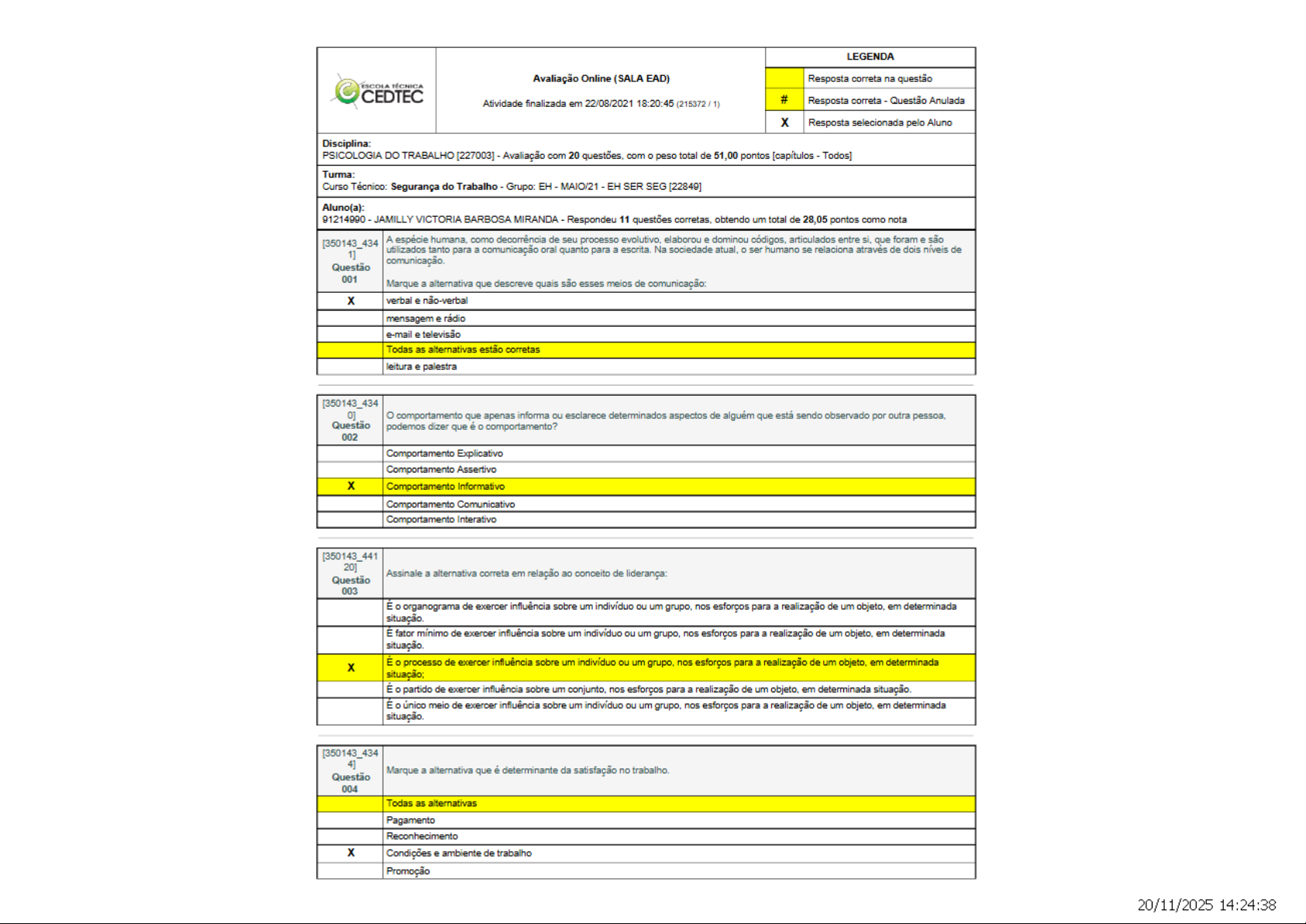 LEGENDA Avaliação Online (SALA EAD) Resposta correta na questão ESCOLA CEDTEC Atividade finalizada em 22/08/2021 18:20:45 (215372 # Resposta correta - Questão Anulada X Resposta selecionada pelo Aluno Disciplina: PSICOLOGIA DO TRABALHO [227003] Avaliação com 20 questões, com peso total de 51,00 pontos [capítulos - Todos] Turma: Curso Técnico: Segurança do Trabalho Grupo: EH MAIO/21 EH SER SEG [22849] Aluno(a): 91214990 JAMILLY VICTORIA BARBOSA MIRANDA Respondeu 11 questões corretas, obtendo um total de 28,05 pontos como nota [350143_434 A espécie humana, como decorrência de seu processo evolutivo, elaborou e dominou códigos, articulados entre si, que foram e são utilizados tanto para a comunicação oral quanto para a escrita. Na sociedade atual, ser humano se relaciona através de dois níveis de comunicação. Questão 001 Marque a alternativa que descreve quais são esses meios de comunicação: X verbal e não-verbal mensagem e rádio e-mail e televisão Todas as alternativas estão corretas leitura e palestra [350143_434 0] o comportamento que apenas informa ou esclarece determinados aspectos de alguém que está sendo observado por outra pessoa, Questão podemos dizer que é comportamento? 002 Comportamento Explicativo Comportamento Assertivo X Comportamento Informativo Comportamento Comunicativo Comportamento Interativo 20] Assinale a alternativa correta em relação ao conceito de liderança: Questão 003 É o organograma de exercer influência sobre um indivíduo ou um grupo, nos esforços para a realização de um objeto, em determinada situação. fator mínimo de exercer influência sobre um indivíduo ou um grupo, nos esforços para a realização de um objeto, em determinada situação. X É processo de exercer influência sobre um indivíduo ou um grupo, nos esforços para a realização de um objeto, em determinada situação; É o partido de exercer influência sobre um conjunto, nos esforços para a realização de um objeto, em determinada situação. É o único meio de exercer influência sobre um indivíduo ou um grupo, nos esforços para a realização de um objeto, em determinada situação. [350143_434 4] Marque a alternativa que é determinante da satisfação no trabalho. Questão 004 Todas as alternativas Pagamento Reconhecimento X Condições e ambiente de trabalho Promoção 20/11/2025 14:24:38