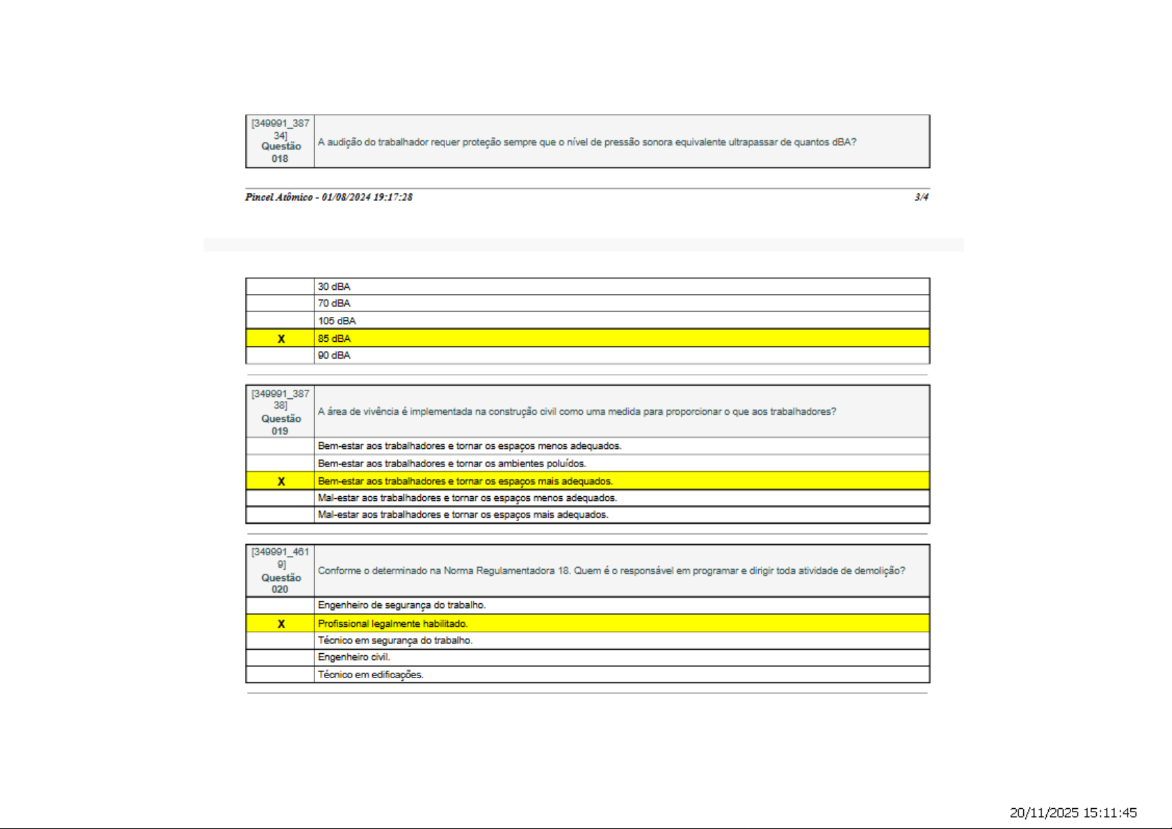 [349991_387 34] Questão A audição do trabalhador requer proteção sempre que o nível de pressão sonora equivalente ultrapassar de quantos dBA? 018 Pincel Atômico - 01/08/2024 19:17:28 3/4 30 dBA 70 dBA 105 dBA 85 dBA 90 dBA [349991_387 38] A área de vivência é implementada na construção civil como uma medida para proporcionar o que aos trabalhadores? Questão 019 Bem-estar aos trabalhadores e tornar os espaços menos adequados. Bem-estar aos trabalhadores e tornar os ambientes poluídos. X Bem-estar aos trabalhadores e tornar os espaços mais adequados. Mal-estar aos trabalhadores e tornar os espaços menos adequados. Mal-estar aos trabalhadores e tornar os espaços mais adequados. [349991_461 9] Conforme o determinado na Norma Regulamentadora 18. Quem é o responsável em programar e dirigir toda atividade de demolição? Questão 020 Engenheiro de segurança do trabalho. X Profissional legalmente habilitado. Técnico em segurança do trabalho. Engenheiro civil. Técnico em edificações. 20/11/2025 15:11:45