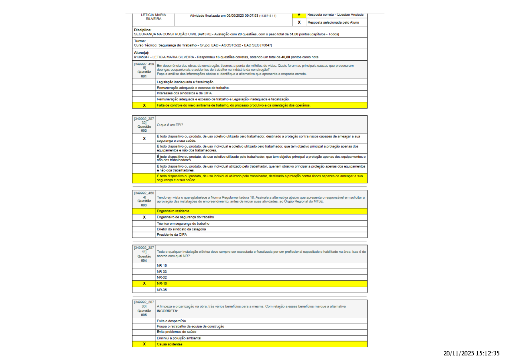 LETICIA MARIA Atividade finalizada em 05/09/2023 09:07:53 (1138718 # Resposta correta Questao Anulada SILVEIRA X Resposta selecionada pelo Aluno Disciplina: SEGURANÇA NA CONSTRUÇÃO CIVIL [491370] Avaliação com 20 questões, com peso total de 51,00 pontos [capítulos Todos] Turma: Curso Técnico: Segurança do Trabalho - Grupo: EAD AGOSTO/22 EAD SEG [70647] Aluno(a): 91345847 LETICIA MARIA SILVEIRA Respondeu 16 questões corretas, obtendo um total de 40,80 pontos como nota [349992_459 Em decorrência das obras da construção, tivemos a perda de milhões de Quais foram as principais causas que provocaram doenças ocupacionais e acidentes de trabalho na indústria da construção? Questão Faça a análise das informações abaixo e identifique a alternativa que apresenta a resposta correta. 001 Legislação inadequada e fiscalização. Remuneração adequada e excesso de Interesses dos sindicatos e da CIPA Remuneração adequada e excesso de trabalho e Legislação inadequada e fiscalização. X Falta de controle do meio ambiente de trabalho, do processo produtivo e da orientação dos operários. [349992_387 32] Questão o que é um EPI? 002 É todo dispositivo ou produto, de uso coletivo utilizado pelo trabalhador, destinado a proteção contra riscos capazes de ameaçar a sua X segurança e a sua saúde. É todo dispositivo ou produto, de uso individual e coletivo utilizado pelo trabalhador, que tem objetivo principal a proteção apenas dos equipamentos e não dos trabalhadores. É todo dispositivo ou produto, de uso coletivo utilizado pelo trabalhador, que tem objetivo principal a proteção apenas dos equipamentos e não dos É todo dispositivo ou produto, de uso individual utilizado pelo trabalhador, que tem objetivo principal a proteção apenas dos equipamentos e não dos trabalhadores. É todo dispositivo ou produto, de uso individual utilizado pelo destinado a proteção contra riscos capazes de ameaçar a sua segurança e a sua saúde. [349992_460 4] Tendo em vista que estabelece a Norma Regulamentadora 18. Assinale a alternativa abaixo que apresenta responsável em solicitar a Questão aprovação das instalações do empreendimento, antes de iniciar suas atividades, ao Regional do 003 Engenheiro residente X Engenheiro de segurança do trabalho Técnico em segurança do trabalho Diretor do sindicato da categoria Presidente da CIPA [349992_387 44] Toda e qualquer instalação elétrica deve sempre ser executada e fiscalizada por um profissional capacitado e habilitado na área, isso é de Questão acordo com qual NR? 004 NR-15 NR-33 NR-32 X NR-10 NR-35 [349992_387 36] A limpeza e organização na obra, trás vários benefícios para a mesma. Com relação a esses benefícios marque a alternativa Questão INCORRETA: 005 Evita desperdício Poupa retrabalho da equipe de construção Evita problemas de saúde Diminiui a poluição ambiental X Causa acidentes 20/11/2025 15:12:35