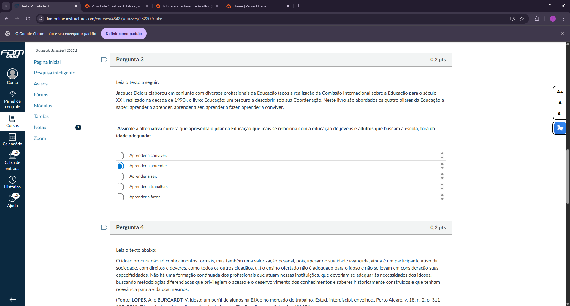 Teste: Atividade 3 Atividade Objetiva 3_ Educação Educação de Jovens e Adultos Home Passei Direto + X famonline.instructure.com/courses/48427/quizzes/232202/take : Google Chrome não é seu navegador padrão Definir como padrão Graduação Semestral 2025.2 ONLINE Página inicial Pergunta 3 0,2 pts Pesquisa inteligente Conta Avisos Leia O texto a seguir: Jacques Delors elaborou em conjunto com diversos profissionais da Educação (após a realização da Comissão Internacional sobre a Educação para século A+ Fóruns Painel de XXI, realizado na década de 1990), livro: Educação: um tesouro a descobrir, sob sua Coordenação. Neste livro são abordados os quatro pilares da Educação a A controle Módulos saber: aprender a aprender, aprender a ser, aprender a fazer, aprender a conviver. A- Tarefas Cursos Notas 1 Assinale a alternativa correta que apresenta pilar da Educação que mais se relaciona com a educação de jovens e adultos que buscam a escola, fora da idade adequada: Zoom Calendário 10 Aprender a conviver. Caixa de Aprender a aprender. entrada Aprender a ser. Histórico Aprender a trabalhar. 10 Aprender a fazer. Ajuda Pergunta 4 0,2 pts Leia O texto abaixo: idoso procura não só conhecimentos formais, mas também uma valorização pessoal, pois, apesar de sua idade avançada, ainda é um participante ativo da sociedade, com direitos e deveres, como todos outros cidadãos. (...) O ensino ofertado não é adequado para idoso e não se levam em consideração suas especificidades. Não há uma formação continuada dos profissionais que atuam nessas instituições, que deveriam se adequar às necessidades dos idosos, buscando metodologias diferenciadas que privilegiem acesso e desenvolvimento dos conhecimentos e saberes historicamente construídos e que tenham relevância para a vida dos mesmos. (Fonte: LOPES, A. e BURGARDT, V. Idoso: um perfil de alunos na EJA e no mercado de trabalho. Estud. interdiscipl. envelhec., Porto Alegre, V. 18, n. 2, p. 311-
