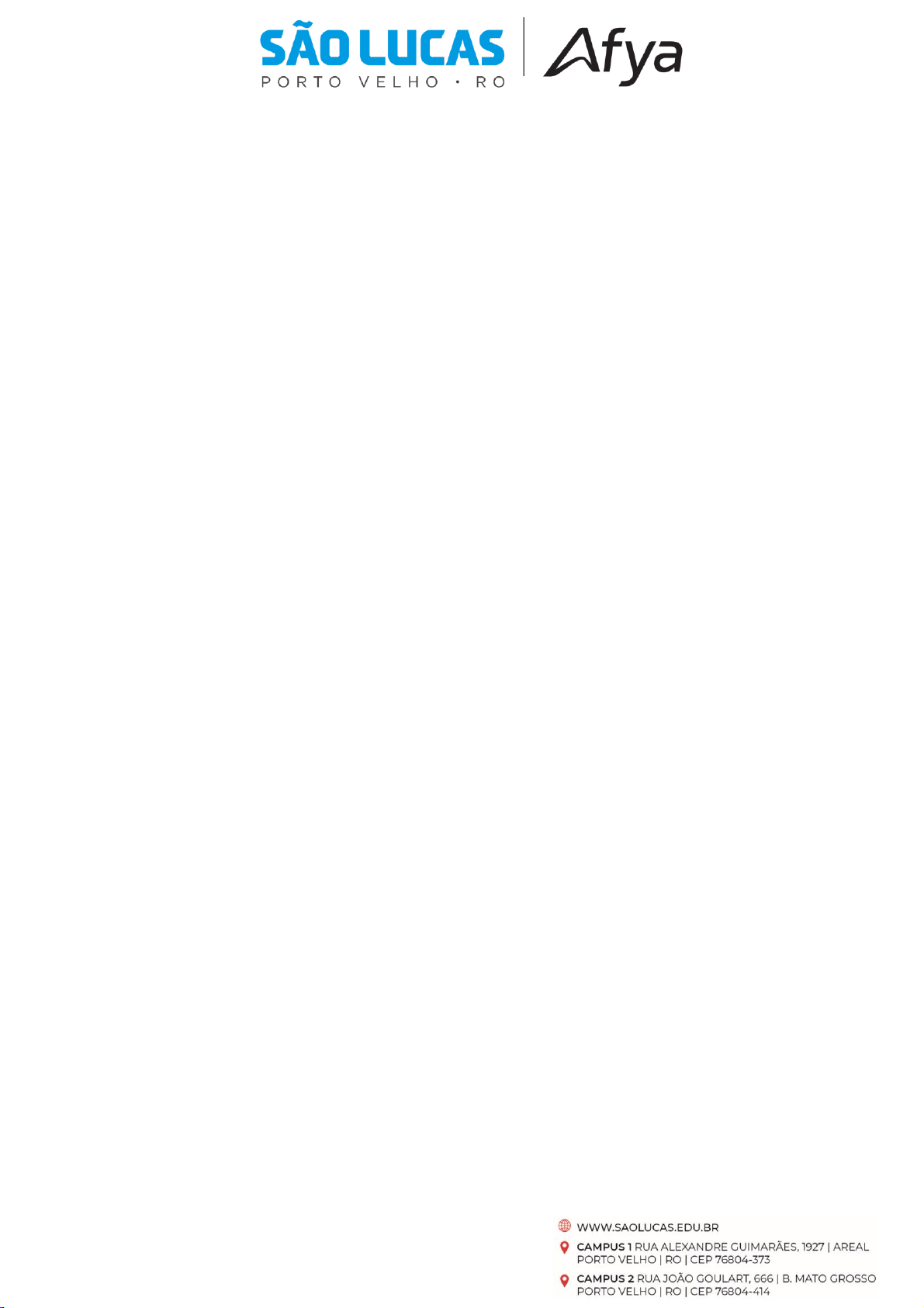 CENTRO UNIVERSITÁRIO SÃO LUCAS-AFYA COODENAÇÃO DE MEDICINA CLÍNICAS INTEGRADAS II JEMILLE VICTÓRIA PIRES DOS SANTOS TIC SEMANA 02: CALENDÁRIO VACINAÇÃO DA CRIANÇA - ATÉ 1 ANO DE IDADE Porto Velho-RO 2024.2 JEMILLE VICTÓRIA PIRES DOS SANTOS TIC SEMANA 02: CALENDÁRIO VACINAÇÃO DA CRIANÇA - ATÉ 1 ANO DE IDADE Atividade apresentada a Clínicas Integradas II do curso de Medicina do Centro Universitário São Lucas como requisito parcial a obtenção de nota para compor a modalidade de TIC’S conforme a semana vigente. Docente: Profº. Esp. Douglas Smith Porto Velho-RO 2024.2 S02: CALENDÁRIO VACINAÇÃO DA CRIANÇA - ATÉ 1 ANO DE IDADE O Programa Nacional de Imunização (PNI) oferece uma ampla gama de vacinas para garantir proteção em todo o ciclo de vida, desde o nascimento até a idade adulta. A prevenção é a maneira mais eficaz de combater doenças, e é essencial seguir todo o calendário de vacinação para atingir esse objetivo de forma mais eficaz. Idade Vacina Ao nascer BCG Hepatite B 1ª dose 2 meses Pentavalente 1ª dose (Tetravalente +Hepatite B 2ª dose) Poliomielite 1ª dose (VIP) Pneumocócica conjugada (10V) 1ª dose Rotavírus 1ª dose 3 meses Meningocócica C conjugada 1ª dose 4 meses Pentavalente 2ª dose (Tetravalente +Hepatite B 3ª dose) Poliomielite 2ª dose (VIP) Pneumocócica conjugada (10V) 2ª dose Rotavírus 2ª dose 5 meses Meningocócica C conjugada 2ª dose 6 meses Penta valente 3ª dose (Tetravalente +Hepatite B 4ª dose) Poliomielite 3ª dose (VIP) 9 meses Febre amarela 12 meses Pneumocócica conjugada (10V) reforço Continuação dos 12 meses Meningocócica conjugada reforço Tríplice viral 1ª dose REFERÊNCIAS Ministério da Saúde (BR). Instrução normativa referente ao calendário nacional de vacinação. Brasília: Ministério da Saúde, 2020. Tratado de Pediatria: Sociedade Brasileira de Pediatria. 4ª edição. Barueri, SP. Manole: 2017. CENTRO UNIVERSITÁRIO SÃO LUCAS-AFYA COODENAÇÃO DE MEDICINA CLÍNICAS INTEGRADAS II