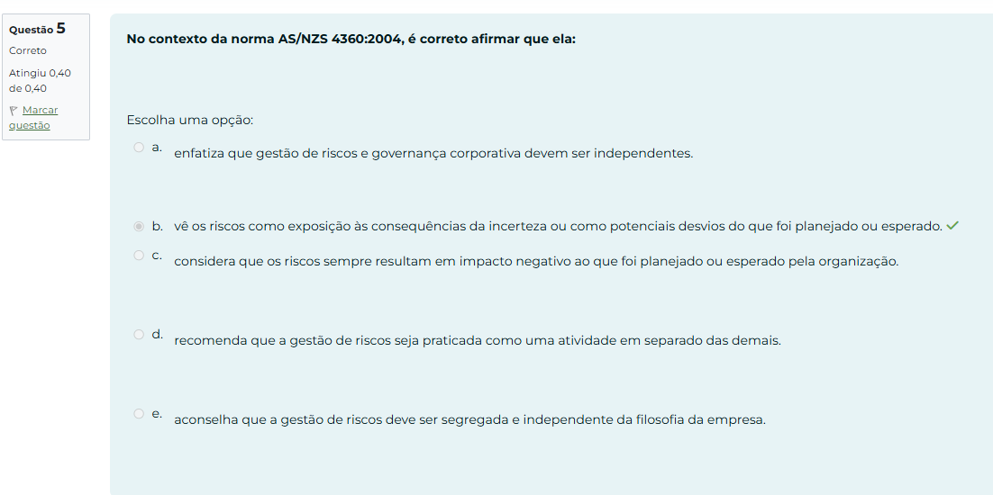 Questão 5 No contexto da norma AS/NZS 4360:2004, é correto afirmar que ela: Correto Atingiu 0,40 de 0,40 P Marcar guestão Escolha uma opção: a. enfatiza que gestão de riscos e governança corporativa devem ser independentes. b. vê riscos como exposição às consequências da incerteza ou como potenciais desvios do que foi planejado ou esperado. C. considera que riscos sempre resultam em impacto negativo ao que foi planejado ou esperado pela organização. d. recomenda que a gestão de riscos seja praticada como uma atividade em separado das demais. e. aconselha que a gestão de riscos deve ser segregada e independente da filosofia da empresa.
