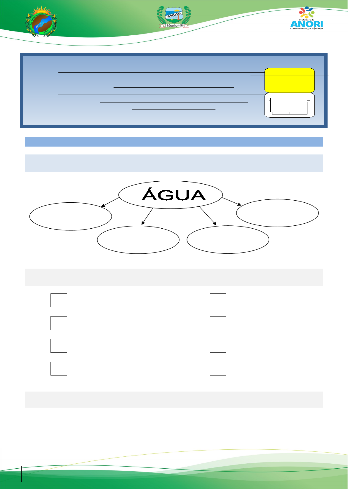 ( AVALIAÇÃO SUBJETIVA, DISCURSIVA E OBJETIVA - 4º BIMESTRE Escola Municipal : ________________________________________________________ Coordenador : FERLISON DA CRUZ BRITO Professor ( a) : KELLYANE JAIME RAMOS Nome : ____________________ ______________________________________ Nº ______ Sé rie : ______ano Turma : MULTI Turno : MATUTINO Data:_ _______/________/2025 Valor da avaliação 5 ,0 pontos Nota alcançada ) CIÊNCIAS E EDUCAÇÃO FÍSICA – 1º ANO Item 01. RELACIONE PALAVRAS COM A PALAVRA GERADORA TRABALHADA EM CIENCIAS E EDUCAÇÃO FÍSICA. (1,2 pontos: 0,3 cada escrita correta ) ITEM 02. ALGUMAS ATIVIDADES ESPORTIVAS SÃO PRATICADAS NA ÁGUA. MAQUE UM X SOMENTE NOS ESPORTE PRATICADO NA ÁGUA. (1,0 ponto: 0,2 cada) PREFEITURA MUNICIPAL DE ANORI SECRETARIA MUNICIPAL DE EDUCAÇÃO Educação Integral: Diversidade, Qualidade, Equidade, Compromisso de Todos. ( Comunidade: Menino Jesus e São Sebastião II Localidade: Paranã do São Tomé Anori – Amazonas CEP: 69440-000 ) NATAÇÃO SKATE CANOAGEM SURFE REMO BOLICHE BICICLISMO NADO ARTÍSTICO Item 03. ESCREVA O NOME DE COISAS QUE VOCÊ COSTUMA UTILIZAR ÁGUA. (0,8 décimos: 0,2 escrita correta) a) b) _____________________________ c) _____________________________ d) _____________________________ e) _____________________________ Item 04. COMPLETE AS FRASES COM AS PALAVRAS DO QUADRO SOBRE A UTILIZAÇÃO E IMPORTÂNCIA DA ÁGUA. (1,2 décimos: 0,3 cada) POTÁVEL ALIMENTOS ÁGUA PESSOAS a) A ÁGUA É MUITO IMPORTANTE PARA AS ______________________________. b) UTILIZAMOS A ÁGUA PARA LAVAR OS ________________________________. c) SEM ____________________ NÃO HAVERIA VIDA NO PLANETA TERRA. d) A ÁGUA QUE OS HUMANOS TÊM QUE CONSUMIR DE SER ____________________. Item 05. LIGUE CADA ELEMENTO ABAIXO COM O RESPECTIVO NOME DO SEU ESTADO FÍSICO. (0,9 décimos: 0,3 cada) Tenha uma ótima avaliação!!! image8.png image1.jpeg image2.png image3.png image4.png image5.png image6.png image7.png